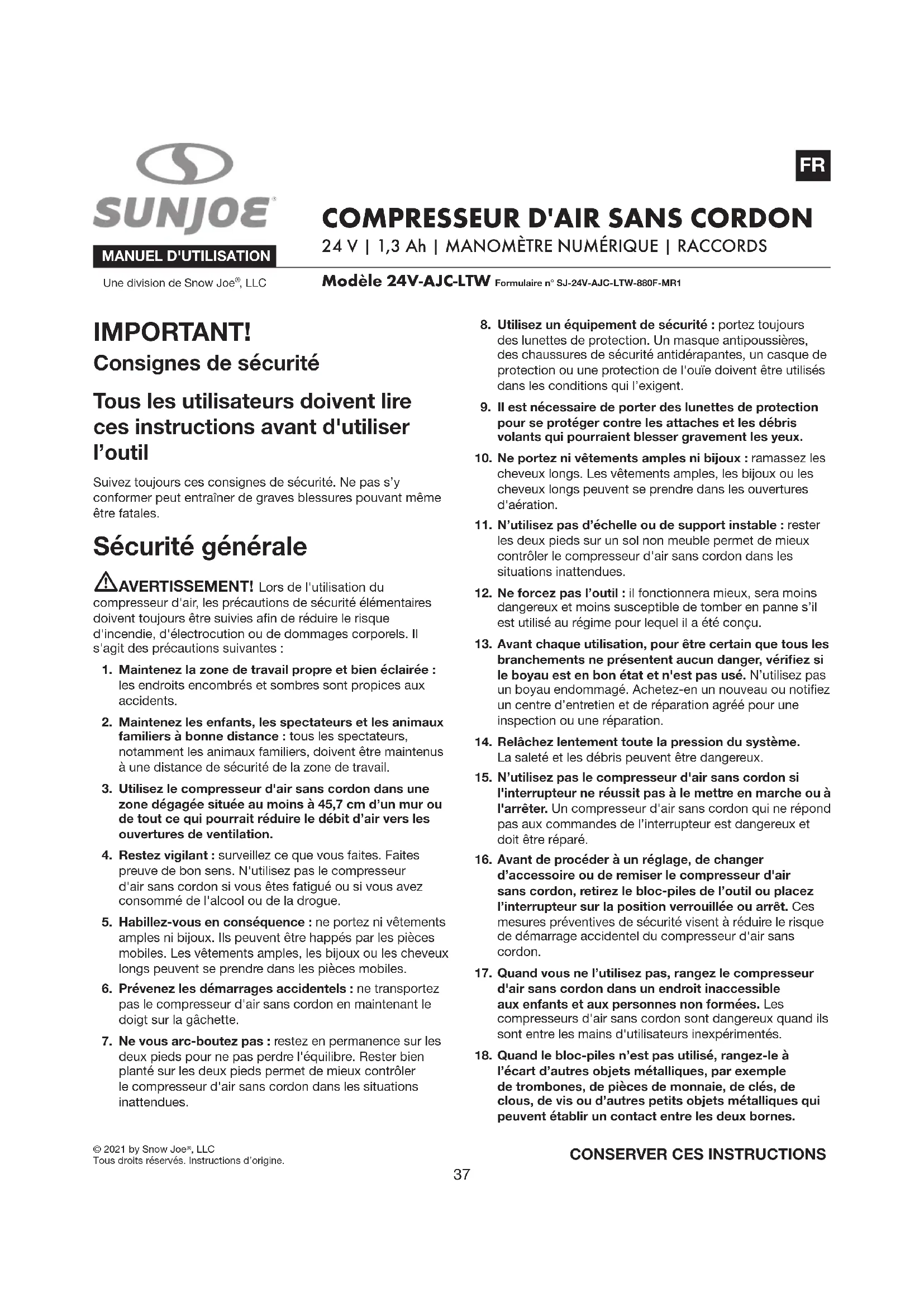 24VAJCLTW - Compresseur Sun Joe - Notice d'utilisation et mode d'emploi gratuit