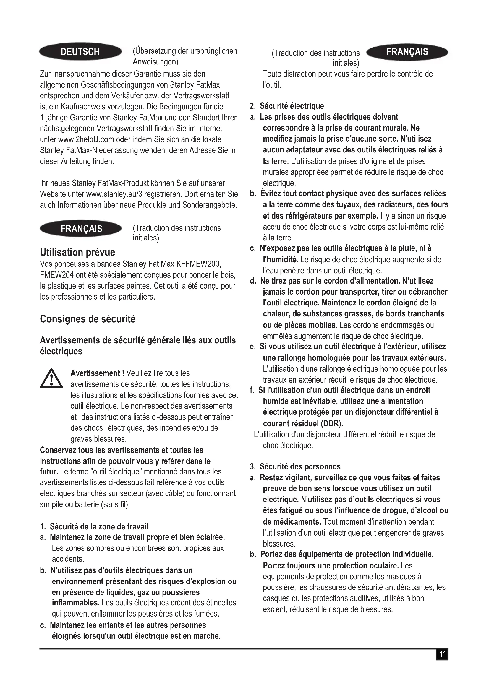 Ponceuse KFFMEW200/ FMEW204 Stanley Europe déclare que les produits décrits dans les "Caractéristiques techniques" sont conformes aux normes : 2006/42/EC, EN 62841-1:2015; EN 62841-2-4:2014 Ces produits sont également conformes aux Directives 2014/30/UE et 2011/65/UE. Pour plus de détails, veuillez contacter Stanley Europe à l'adresse suivante ou vous reporter au dos du manuel. Le soussigné est responsable de la compilation du dossier technique et fait cette déclaration au nom de Stanley FatMax. R. Laverick Directeur Ingénierie Stanley Europe, Egide Walschaertsstraat14-18, 2800 Mechelen, Belgique 28/08/2018 Garantie Stanley Fat Max est sûr de la qualité de ses produits et offre une garantie de 12 mois à ses clients, à partir de la date d'achat. Cette garantie s'ajoute à vos droits légaux auxquels elle ne porte aucunement préjudice. Cette garantie est valable au sein des territoires des États membres de l’Union Européenne et au sein de la Zone européenne de libre- échange. Pour prétendre à la garantie, la réclamation doit être en conformité avec les conditions générales de Stanley Fat Max et vous devez fournir une preuve d'achat au vendeur ou au réparateur agréé. Les conditions générales de la garantie de 1 an Stanley Fat Max ainsi que l'adresse du réparateur agrée le plus proche sont disponibles sur le site Internet www.2helpU. com ou en contactant votre agence Stanley Fat Max locale à l'adresse indiquée dans ce manuel. Veuillez consulter notre site Internet www.stanley.eu/3 pour enregistrer votre nouveau produit Stanley Fat Max et pour être tenu informé des nouveaux produits et offres spéciales. (Traduzione del testo originale) ITALIANO Uso previsto Le levigatrici a nastro KFFMEW200, FMEW204 Stanley