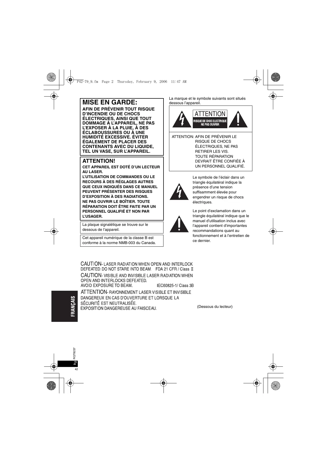AVERTISSEMENT - RAYONNEMENT LASER LORSQUE L'APPAREIL EST OUVERT ET QUE LE VERROUILLAGE DE SÉCURITÉ EST DÉSACTIVÉ. NE PAS REGARDER DIRECTEMENT LE FAISCEAU. FDA 21 CFR / Classe II.