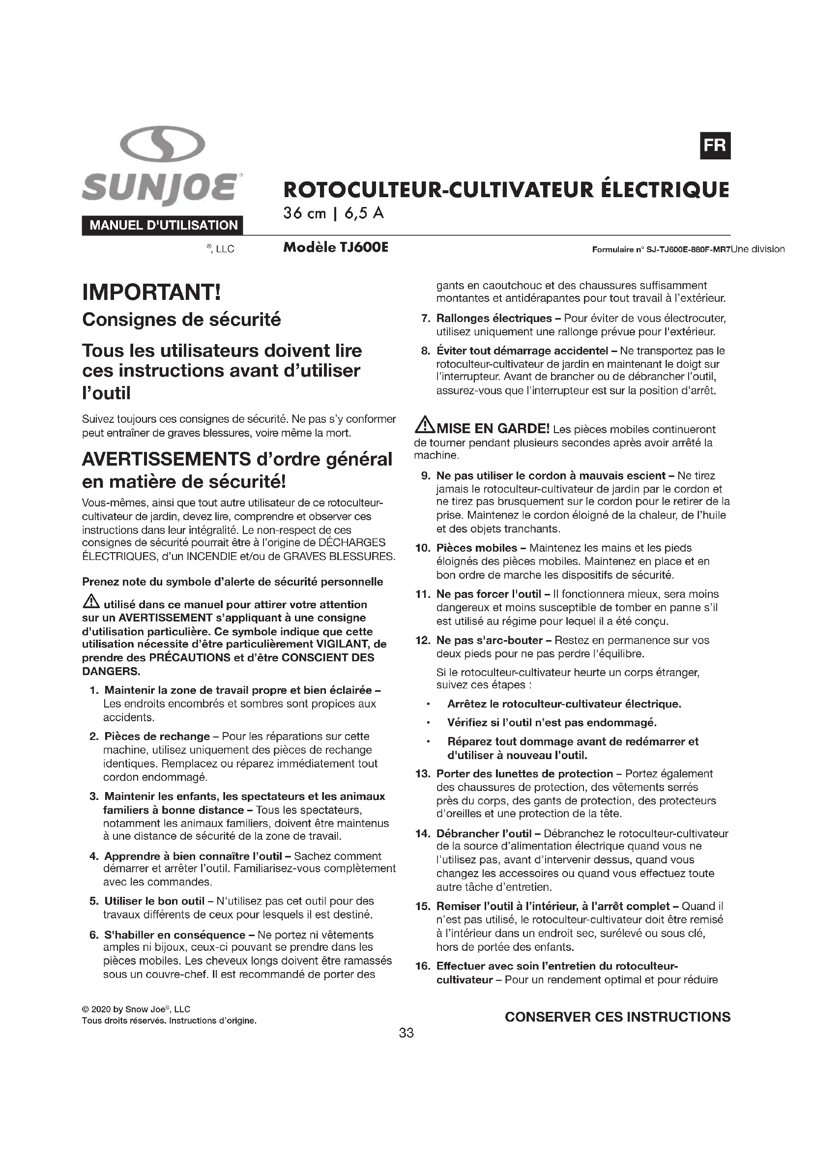 homologués. NE JAMAIS utiliser des pièces ou des accessoires qui ne sont pas destinés à être utilisés avec ce rotoculteur-cultivateur électrique. Communiquez avec Snow Joe
