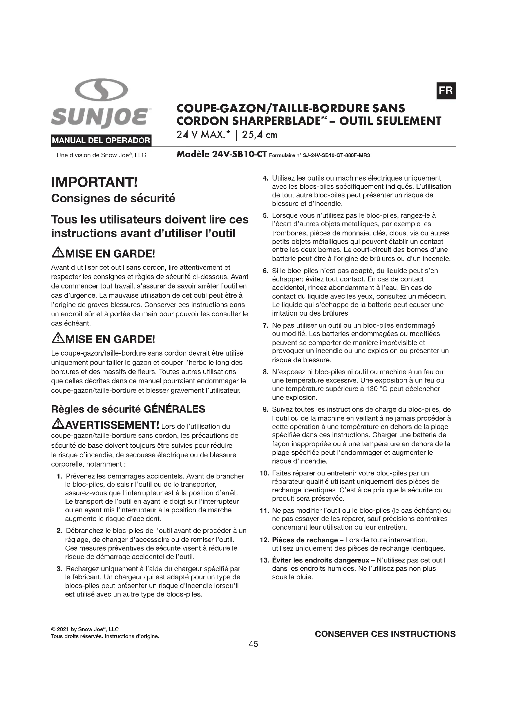 MODE D'EMPLOI 24VTBLTE Sun Joe