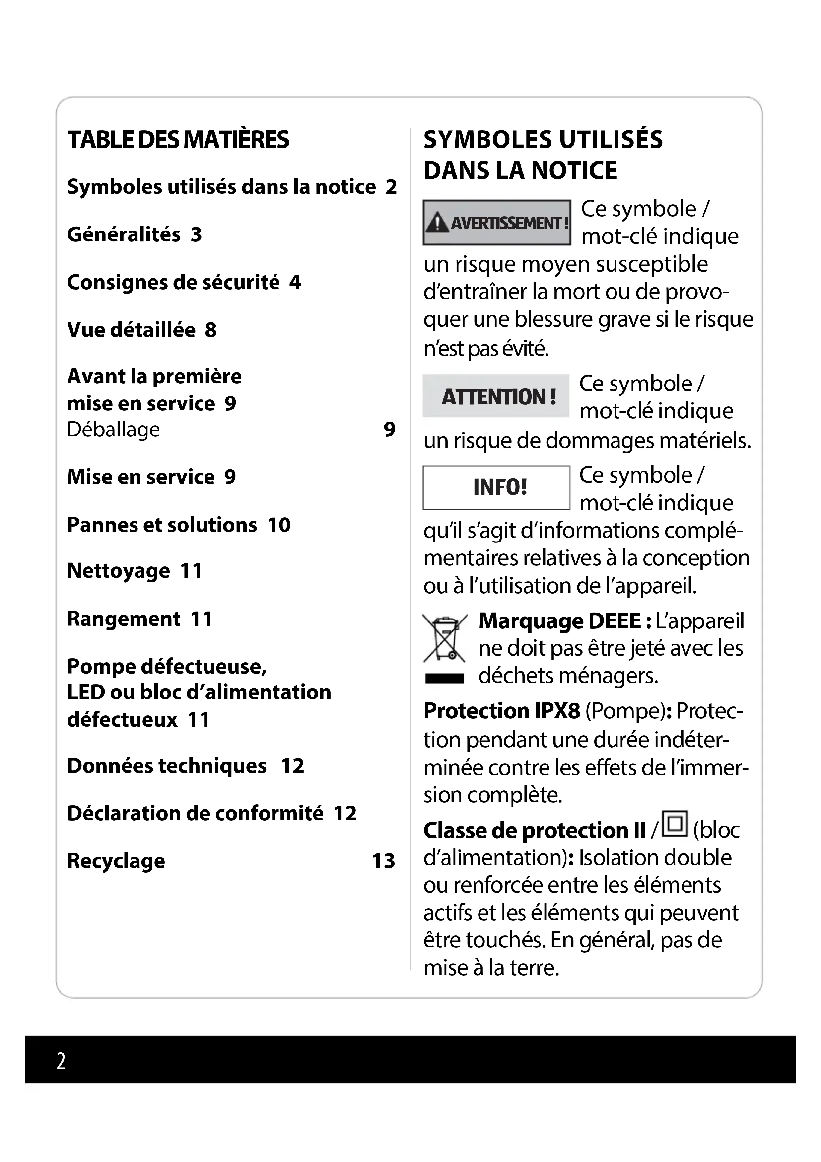 Symboles utilisés dans la notice 2 Généralités 3 Consignes de sécurité 4 Vue détaillée 8 Avant la première mise en service 9 Déballage 9 Mise en service 9 Pannes et solutions 10 Nettoyage 11 Rangement 11 Pompe défectueuse, LED ou bloc d’alimentation défectueux 11 Données techniques 12 Déclaration de conformité 12 Recyclage 13
