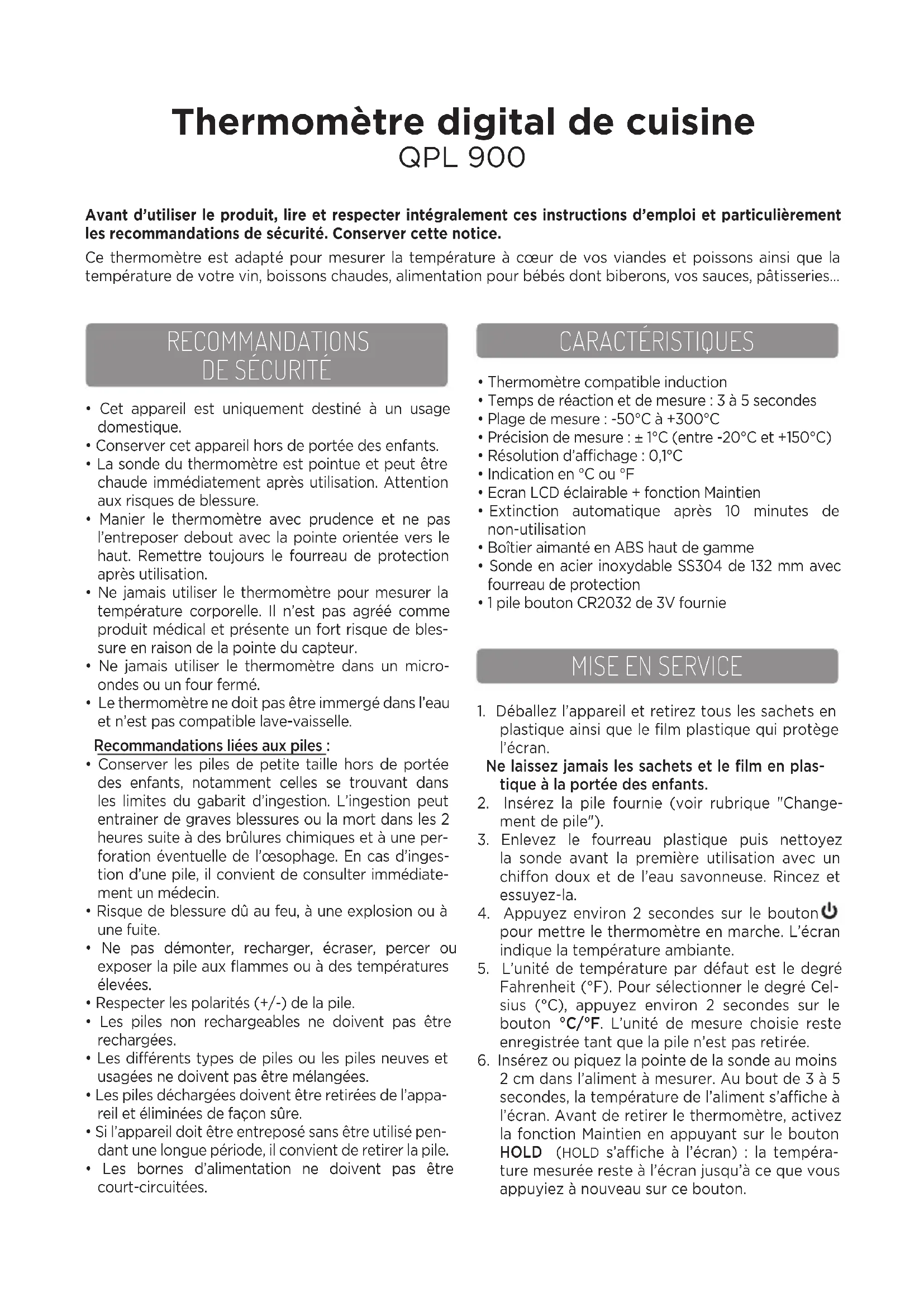 Thermomètre digital de cuisine QPL 900 Avant d’utiliser le produit, lire et respecter intégralement ces instructions d’emploi et particulièrement les recommandations de sécurité. Conserver cette notice. Ce thermomètre est adapté pour mesurer la température à cœur de vos viandes et poissons ainsi que la température de votre vin, boissons chaudes, alimentation pour bébés dont biberons, vos sauces, pâtisseries…