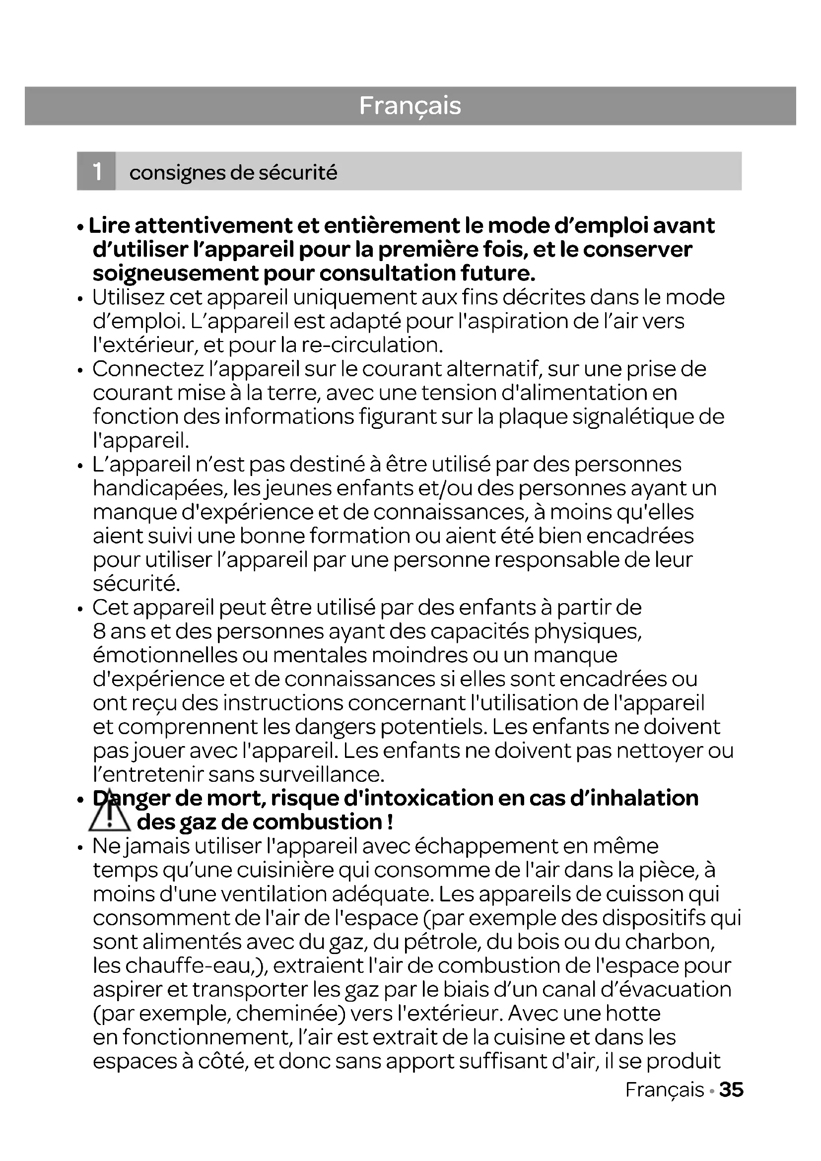 - Utilisez cet appareil uniquement aux fins décrites dans le mode d’emploi. L’appareil est adapté pour l'aspiration de l’air vers l'extérieur, et pour la re-circulation.