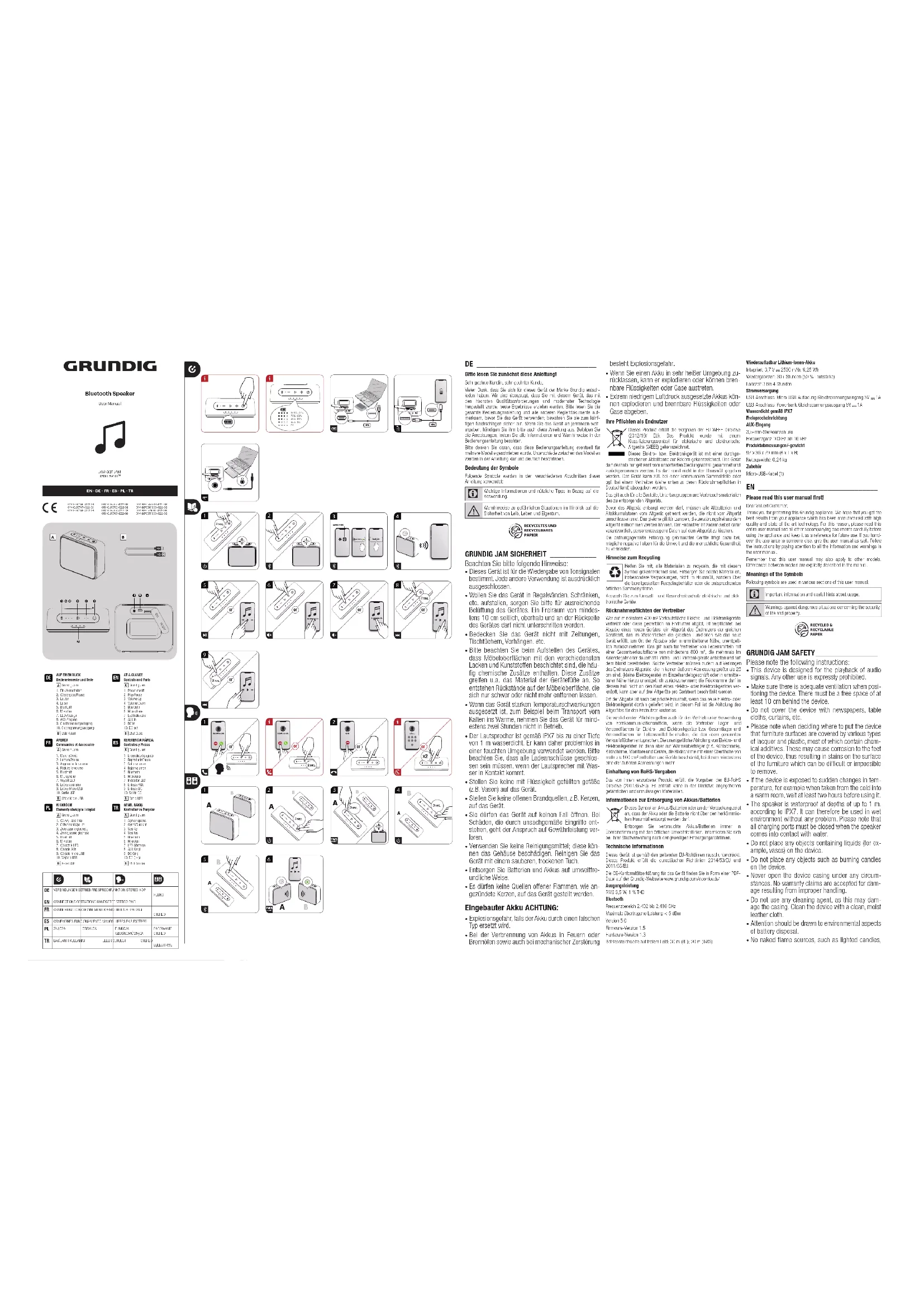 - Soumettre une batterie à une pression atmosphéri- que extrêmement basse peut entraîner une explo- sion ou une fuite de liquide ou de gaz inflammable. Conformité avec la directive DEEE et mise au rebut des dé- chets : Ce produit est conforme à la directive DEEE (2012/19/UE) de l’Union eu-ropéenne. Ce produit porte un symbole de classification pour la mise au rebut des équipements électriques et électroniques (DEEE). Ce symbole indique que ce produit ne doit pas être jeté avec les déchets ménagers à la fin de sa vie utile. Les appareils usagés doivent être retournés au point de collecte officiel destiné au recyclage des appareils électriques et électroniques. Pour trou-ver ces systèmes de collecte, veuillez contacter les autorités locales ou le détaillant auprès duquel vous avez acheté le produit. Chaque ménage joue un rôle important dans la récupération et le recyclage des appareils ménagers usagés. L’élimination appropriée des appareils usagés aide à prévenir les conséquences négatives potentielles pour l’environne-ment et la santé humaine. Conformité avec la directive LdSD : L’appareil que vous avez acheté est conforme à la directive LdSD (2011/65/UE) de l’Union européenne. Il ne comporte pas les matériels dangereux et interdits mentionnés dans la directive. Information sur l’emballage L’emballage du produit est composé de matériaux recyclables, conformément à notre réglementation nationale. Ne jetez pas les éléments d’emballage avec les déchets domestiques et autres déchets. Déposez-les dans un des points de collecte d’éléments d’emballage que vous indiquera l’autorité locale dont vous dépendez. Batteries usagées Assurez-vous de mettre au rebut les batteries usagées con-formément aux lois et réglementations locales. Le symbole sur la batterie et l’emballage indique que la batterie livrée avec l’ap-pareil ne doit pas être considérée comme un déchet ménager. Ce symbole peut être utilisé en conjointement avec un symbole chimique dans certaines régions. Si les batteries contiennent plus de 0,0005 % de mercure et plus de 0,004 % de plomb, le symbole chimique Hg est ajouté pour le mercure et Pb pour le plomb sous le symbole. En vous assurant que les batteries sont mises au rebut de façon appropriée, vous contribuerez à la prévention les dommages potentiels à l’environnement et à la santé humaine dus à une mise au rebut inappropriée des batteries. Informations techniques Cet appareil est dénué de tout parasite conformément aux directives de l’EU en vigueur. Ce produit est conforme aux directives européennes 2014/53/EU et 2011/65/EU.La déclaration de conformité CE de l’appareil est disponible en format PDF à la page d’accueil de Grundig www.grundig.com/downloads/doc.Puissance de sortieRMS 3,5 W, 1 % THDBluetoothPlage de fréquence 2,402 GHz-2,480 GHzPuissance maximale transmise <5 dBmVersion 5.0Version du microprogramme 1.5Version du matériel 1.3Plage de fonctionnement en champ libre: 30 m (Bluetooth); 20 m (TWS)Batterie rechargeable Li-ionIntégré, 3,7 V 2500 mAh, 9,25 WhTemps de lecture : 30+ heures (à 50 % du volume)Temps de charge 3-4 heuresAlimentation électriquePrise USB : Chargeur Micro USB ENTRÉE CC 5 V 1APrise USB : Chargeur externe SORTIE CC 5V 1AImperméable IPX7Mains libresENTRÉE AUXILIAIREJack stéréo 3,5 mmFréquence de réponse 100 Hz-16 kHzDimensions/Poids du produit97 mm (l) x 36 mm (p) x 79 mm (h)Poids net : 0,24 kgAccessoireCâble Micro USB (1) ES ________________________________ ¡Lea el manual de usuario antes de utilizar el aparato! Estimado cliente:Gracias por elegir un aparato Grundig. Esperamos que obtenga los mejores resultados de su aparato, ya que ha sido fabricado con gran calidad y con tecnología de última generación. Por esta razón, le aconsejamos que lea este manual de usuario y todos los demás documentos adjuntos con at-ención antes de utilizar el aparato y que los guarde para futuras consultas. Si entrega este aparato a otra persona, proporciónele también el manual de usuario. Siga las instrucciones prestando especial atención a toda la información y advertencias incluidas en el manual de usuario.Recuerde que este manual de usuario también puede servir para otros modelos. En el manual se describen las diferencias entre los modelos ex-plícitamente. Significado de los símbolos Los siguientes símbolos se usan en las diversas secciones del presente manual de usuario: Información importante y consejos útiles sobre su uso. Advertencias de situaciones peligrosas sobre la seguridad de las personas y la propiedad.
