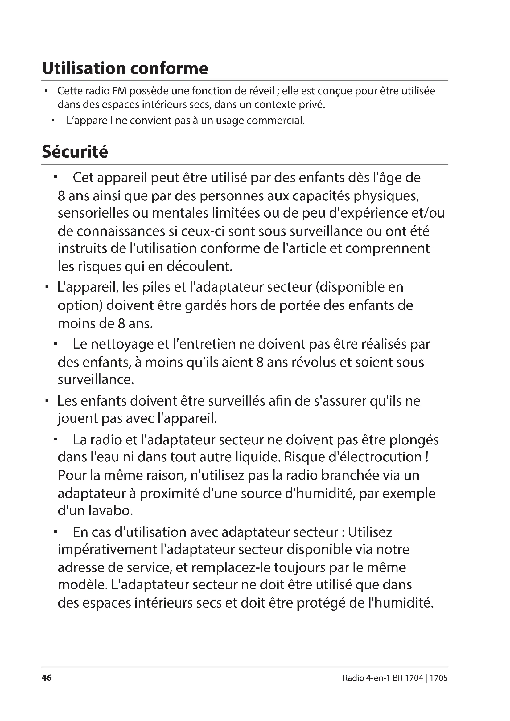 Radio 4-en-1 BR 1704 | 1705 Utilisation conforme Cette radio FM possède une fonction de réveil; elle est conçue pour être utilisée dans des espaces intérieurs secs, dans un contexte privé. L’appareil ne convient pas à un usage commercial. Sécurité Cet appareil peut être utilisé par des enfants dès l'âge de 8 ans ainsi que par des personnes aux capacités physiques, sensorielles ou mentales limitées ou de peu d'expérience et/ou de connaissances si ceux-ci sont sous surveillance ou ont été instruits de l'utilisation conforme de l'article et comprennent les risques qui en découlent. L'appareil, les piles et l'adaptateur secteur (disponible en option) doivent être gardés hors de portée des enfants de moins de 8 ans. Le nettoyage et l’entretien ne doivent pas être réalisés par des enfants, à moins qu’ils aient 8 ans révolus et soient sous surveillance. Les enfants doivent être surveillés an de s'assurer qu'ils ne jouent pas avec l'appareil. La radio et l'adaptateur secteur ne doivent pas être plongés dans l'eau ni dans tout autre liquide. Risque d'électrocution! Pour la même raison, n'utilisez pas la radio branchée via un adaptateur à proximité d'une source d'humidité, par exemple d'un lavabo. En cas d'utilisation avec adaptateur secteur: Utilisez impérativement l'adaptateur secteur disponible via notre adresse de service, et remplacez-le toujours par le même modèle. L'adaptateur secteur ne doit être utilisé que dans des espaces intérieurs secs et doit être protégé de l'humidité.Sécurité