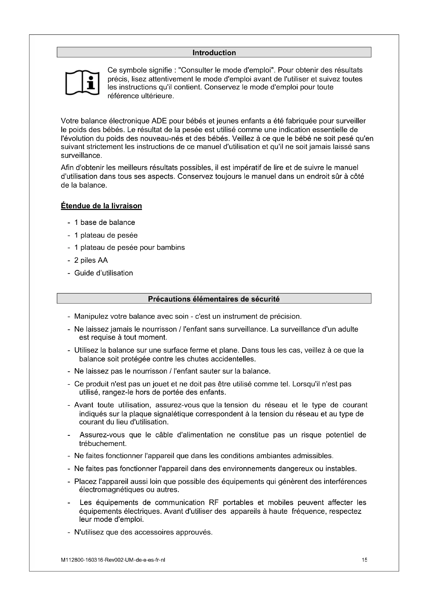 Introduction Ce symbole signifie : "Consulter le mode d'emploi". Pour obtenir des résultats précis, lisez attentivement le mode d'emploi avant de l'utiliser et suivez toutes les instructions qu'il contient. Conservez le mode d'emploi pour toute référence ultérieure. Votre balance électronique ADE pour bébés et jeunes enfants a été fabriquée pour surveiller le poids des bébés. Le résultat de la pesée est utilisé comme une indication essentielle de l'évolution du poids des nouveau-nés et des bébés. Veillez à ce que le bébé ne soit pesé qu'en suivant strictement les instructions de ce manuel d'utilisation et qu'il ne soit jamais laissé sans surveillance. Afin d'obtenir les meilleurs résultats possibles, il est impératif de lire et de suivre le manuel d'utilisation dans tous ses aspects. Conservez toujours le manuel dans un endroit sûr à côté de la balance. Étendue de la livraison - 1 base de balance - 1 plateau de pesée - 1 plateau de pesée pour bambins - 2 piles AA - Guide d’utilisation Précautions élémentaires de sécurité - Manipulez votre balance avec soin - c'est un instrument de précision. - Ne laissez jamais le nourrisson / l'enfant sans surveillance. La surveillance d'un adulte est requise à tout moment. - Utilisez la balance sur une surface ferme et plane. Dans tous les cas, veillez à ce que la balance soit protégée contre les chutes accidentelles. - Ne laissez pas le nourrisson / l'enfant sauter sur la balance. - Ce produit n'est pas un jouet et ne doit pas être utilisé comme tel. Lorsqu'il n'est pas utilisé, rangez-le hors de portée des enfants. - Avant toute utilisation, assurez-vous que la tension du réseau et le type de courant indiqués sur la plaque signalétique correspondent à la tension du réseau et au type de courant du lieu d'utilisation. - Assurez-vous que le câble d'alimentation ne constitue pas un risque potentiel de trébuchement. - Ne faites fonctionner l'appareil que dans les conditions ambiantes admissibles. - Ne faites pas fonctionner l'appareil dans des environnements dangereux ou instables. - Placez l'appareil aussi loin que possible des équipements qui génèrent des interférences électromagnétiques ou autres. - Les équipements de communication RF portables et mobiles peuvent affecter les équipements électriques. Avant d'utiliser des appareils à haute fréquence, respectez leur mode d'emploi. - N'utilisez que des accessoires approuvés.16