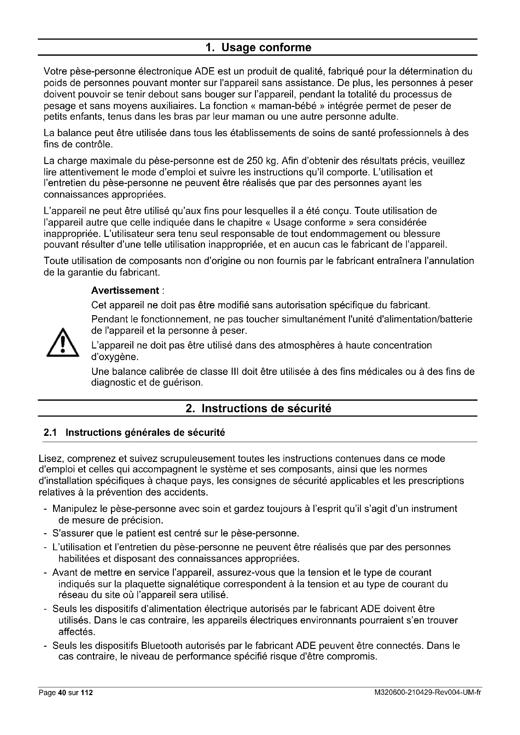 Lisez, comprenez et suivez scrupuleusement toutes les instructions contenues dans ce mode d'emploi et celles qui accompagnent le système et ses composants, ainsi que les normes d'installation spécifiques à chaque pays, les consignes de sécurité applicables et les prescriptions relatives à la prévention des accidents. - Manipulez le pèse-personne avec soin et gardez toujours à l’esprit qu’il s’agit d’un instrument de mesure de précision. - S'assurer que le patient est centré sur le pèse-personne. - L’utilisation et l’entretien du pèse-personne ne peuvent être réalisés que par des personnes habilitées et disposant des connaissances appropriées. - Avant de mettre en service l’appareil, assurez-vous que la tension et le type de courant indiqués sur la plaquette signalétique correspondent à la tension et au type de courant du réseau du site où l’appareil sera utilisé. - Seuls les dispositifs d’alimentation électrique autorisés par le fabricant ADE doivent être utilisés. Dans le cas contraire, les appareils électriques environnants pourraient s’en trouver affectés. - Seuls les dispositifs Bluetooth autorisés par le fabricant ADE peuvent être connectés. Dans le cas contraire, le niveau de performance spécifié risque d'être compromis.M320600-210429-Rev004-UM-fr Page 41 sur 112 - Toute personne connectant un équipement supplémentaire ou une alimentation électrique (autres que ceux visés à l'article 9) à l'équipement est responsable que le système est conforme aux exigences de la norme CEI 60601-1. - La fiche mâle/adaptateur isole l'appareil de l'alimentation principale. Ne placez pas l'appareil dans une position où il est difficile de le débrancher du réseau d'alimentation pour mettre fin au fonctionnement de l'appareil en toute sécurité. - Disposez le cordon d’alimentation entre la prise électrique et le pèse-personne de manière à ne présenter aucun danger de trébuchement. - Disposez le cordon d’alimentation entre la prise électrique et le pèse-personne de manière à ne présenter aucun danger d’étranglement. - Ne faites jamais glisser le pèse-personne sur la surface d’installation, car cela pourrait endommager les cellules de pesage. - N’utilisez l’appareil que dans les conditions environnementales autorisées. - N’exposez jamais le pèse-personne à des températures élevées, émises par des appareils à proximité ou par les rayons directs du soleil. L’affichage à cristaux liquides pourrait en être affecté. - Après le stockage dans des conditions extrêmes, au moins 30 min jusqu' à ce que la balance se soit acclimatée et soit prête à l'emploi. - Évitez d’utiliser le pèse-personne dans des courants d’air ou lorsque la température ambiante n’est pas constante, car de telles circonstances pourraient fausser les résultats de mesure. - Essayez, dans la mesure du possible, de placer le pèse-personne à l’écart d’autres appareils et de possibles sources d’interférences, électromagnétiques ou autres, qui pourraient fausser les résultats de mesure. - N’utilisez que des accessoires et périphériques autorisés. - Avant d’entamer le nettoyage de l’appareil, assurez-vous qu’il soit débranché. - N'immergez pas l'appareil dans l'eau ou dans tout autre liquide. - Si le pèse-personne doit rester inutilisé pendant une période prolongée, nettoyez-le et rangez-le en lieu sûr, enveloppé dans un film plastique protecteur. L’ajout d’un sachet desséchant est recommandable. - Retirez les piles de leur compartiment si le pèse-personne doit rester inutilisé pendant une période prolongée. - Si vous rencontrez des problèmes avec cet appareil, tels que la configuration, la maintenance ou l'utilisation, veuillez contacter le service clientèle autorisé. Ne pas ouvrir ou réparer l'appareil par vous-même. - S'il vous plaît, veuillez signaler à l'assistance clientèle autorisée si une opération ou des événements inattendus se produisent. N’utilisez JAMAIS le pèse-personne : - si l’unité d’alimentation est endommagée ; - si l’unité d’alimentation ne fonctionne pas ; - si le compartiment des piles est déformé ; - après un entreposage prolongé dans un environnement humide. Dans de tels cas, veuillez consulter le service après-vente agréé.Page 42 sur 112 M320600-210429-Rev004-UM-fr