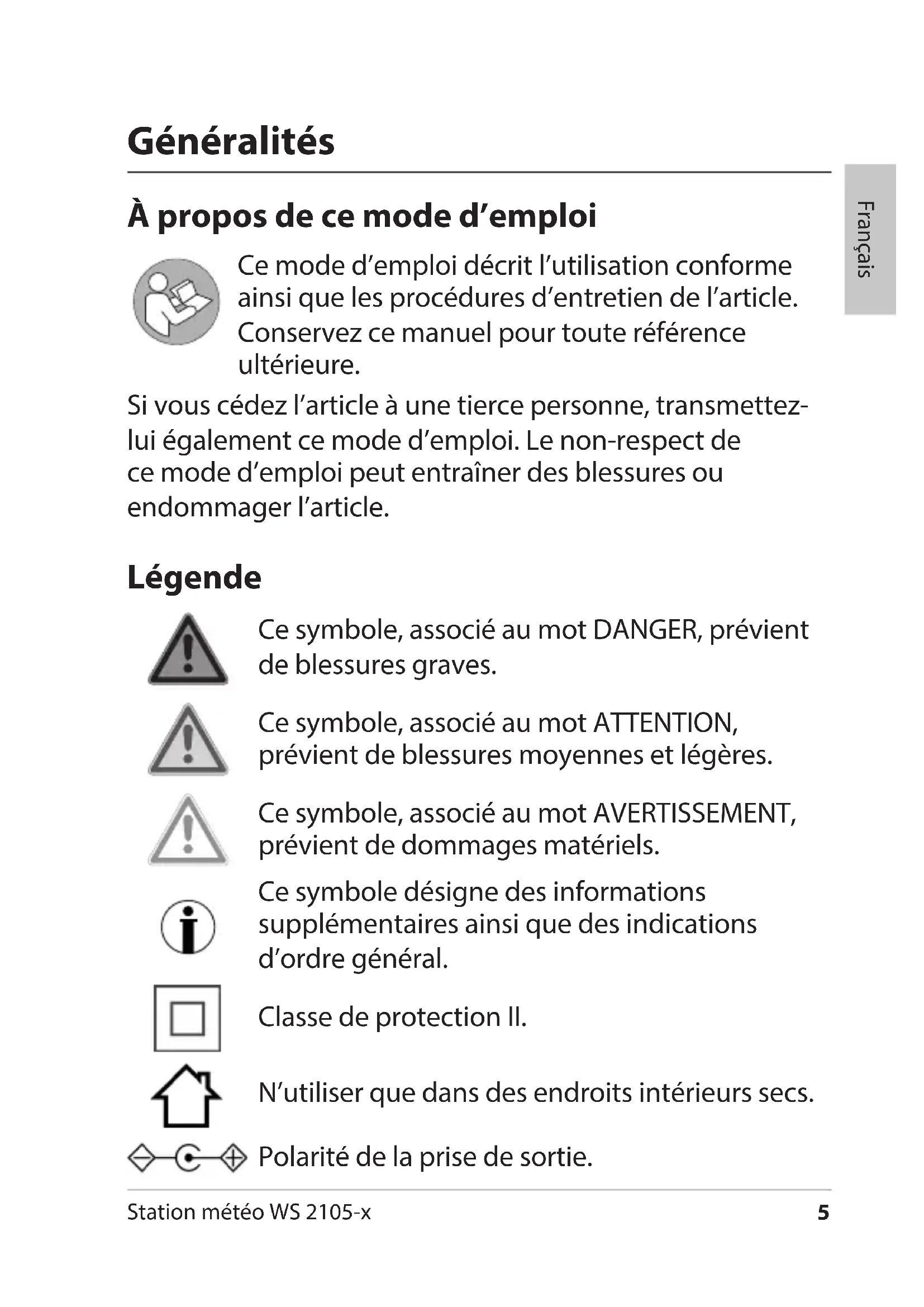 - Mise au rebut Station météoWS2105-x Français Généralités À propos de ce mode d’emploi Ce mode d’emploi décrit l’utilisation conforme ainsi que les procédures d’entretien de l’article. Conservez ce manuel pour toute référence ultérieure. Si vous cédez l’article à une tierce personne, transmettez- lui également ce mode d’emploi. Le non-respect de ce mode d’emploi peut entraîner des blessures ou endommager l’article. Légende Ce symbole, associé au mot DANGER, prévient de blessures graves. Ce symbole, associé au mot ATTENTION, prévient de blessures moyennes et légères. Ce symbole, associé au mot AVERTISSEMENT, prévient de dommages matériels. Ce symbole désigne des informations supplémentaires ainsi que des indications d’ordre général. Classe de protection II. N’utiliser que dans des endroits intérieurs secs. Polarité de la prise de sortie.6 Station météoWS2105-x Courant continu. Sécurité Cet appareil peut être utilisé par des enfants dès l'âge de 8 ans ainsi que par des personnes aux capacités physiques, sensorielles ou mentales limitées ou de peu d'expérience et/ou de connaissances si ceux-ci sont sous surveillance ou ont été instruits de l'utilisation conforme de l'article et comprennent les risques qui en découlent. L'appareil et l'adaptateur secteur doivent être tenus hors de portée des enfants de moins de 8 ans. Le nettoyage et l’entretien ne doivent pas être réalisés par des enfants, à moins qu’ils aient 8 ans révolus et soient sous surveillance. Les enfants doivent être surveillés an de s'assurer qu'ils ne jouent pas avec l'appareil. La station météo et l'adaptateur secteur ne doivent pas être immergés dans de l'eau ou dans d'autres liquides. Risque d'électrocution! Pour cette raison, n'utilisez pas la station de base de la station météo radio à proximité de sources d'humidité, par ex. un évier. N'utilisez que l'adaptateur secteur inclus et ne le remplacez que par un adaptateur du même type. L'adaptateur secteur ne doit être utilisé que dans des espaces intérieurs secs et doit être protégé de l'humidité.7 Station météoWS2105-x Français Danger pour les enfants Les piles peuvent être dangereuses pour la santé en cas d’ingestion. Pour cette raison, conservez la station météo, le capteur radio extérieur et les piles hors de portée de jeunes enfants. En cas d’ingestion d’une pile, sollicitez immédiatement une aide médicale. Tenez les enfants éloignés des matériaux d'emballage et des petits éléments faisant partie du contenu de l'emballage. Risque d’étouement en cas d'ingestion. Risques d'électrocution (lors de l'utilisation de l'adaptateur secteur) Branchez l'appareil sur une prise électrique installée de manière conforme et dont la tension correspond aux «Caractéristiques techniques». Veillez à ce que la prise électrique soit bien accessible de façon à pouvoir rapidement retirer la che en cas de besoin. N'utilisez pas la station météo radio si l'adaptateur secteur ou le câble de l'adaptateur sont endommagés. Ne couvrez pas l'adaptateur secteur avec des rideaux, journaux, etc. et veillez à une aération susante. L'adaptateur secteur peut chauer. Déroulez complètement le câble de l'adaptateur secteur avant de le brancher. Faites attention à ce que des rebords tranchants ou des objets chauds n'endommagent pas le câble. Débranchez l'adaptateur secteur de la prise: − avant de nettoyer la station météo radio, − lorsqu'un dysfonctionnement se produit au cours d'un orage.8 Station météoWS2105-x − Pour ce faire, tirez toujours sur l'adaptateur et non sur le câble. Ne modiez pas l'article ou le câble de raccordement. Conez exclusivement les réparations à un atelier spécialisé, car des réparations non conformes représentent un danger pour l'utilisateur. Ne remplacez pas le câble de l'adaptateur secteur. Si le câble ou l’adaptateur secteur est endommagé, celui-ci doit être mis au rebut et être remplacé par un adaptateur similaire. Risque de blessures Attention: Risque d'explosion en cas de manipulation non conforme des piles. Les piles ne doivent pas être chargées, réactivées avec d’autres moyens, démontées, jetées au feu ou court-circuitées. Évitez que le liquide des piles n'entre en contact avec la peau, les yeux et les muqueuses. En cas de contact, rincez immédiatement les zones concernées avec de l'eau claire et consultez immédiatement un médecin. Remarque sur les dangers matériels Protégez la station de base et le capteur extérieur de la poussière, des chocs, des températures extrêmes et de la lumière directe du soleil. Protégez la station de base de l'humidité. Installez la station de base exclusivement dans une pièce sèche et fermée. Le capteur extérieur est protégé contre l'humidité, mais doit être protégé des eets directs de l'humidité tels que la pluie.9 Station météoWS2105-x Français Retirez les piles de la station de base et du capteur extérieur lorsqu'elles sont usées ou lorsque vous n'utilisez pas la station météo pendant une période prolongée. Vous éviterez ainsi les dommages qui pourraient résulter d’une fuite des piles. N’exposez pas les piles à des conditions extrêmes, en les conservant par exemple sur une source de chaleur ou à la lumière directe du soleil. Risque accru de fuite pour les piles! Si nécessaire, nettoyez les bornes des piles et les contacteurs de l’appareil avant l’insertion. Changez toujours les piles de la station de base et du capteur extérieur en même temps. N'employez que des piles d’un même type, ne mélangez pas des types de piles diérents, ni des piles usées et des piles neuves. N’apportez aucune modication à l’appareil. Conez exclusivement les réparations à un atelier spécialisé et respectez les conditions de garantie. N'utilisez en aucun cas des produits ménagers durs, rugueux, abrasifs ou similaires pour nettoy