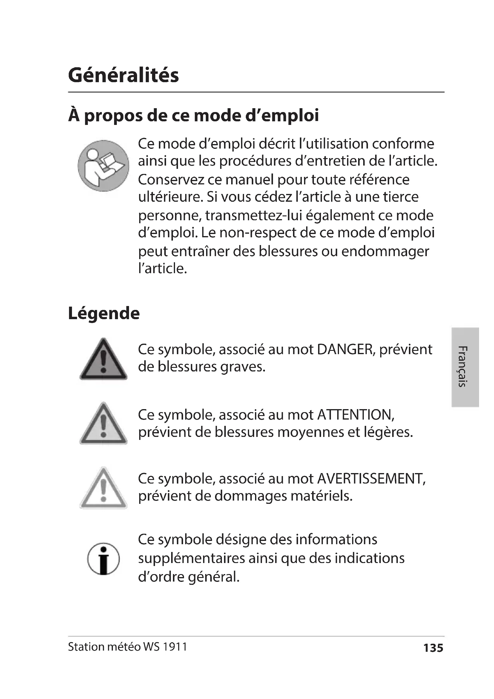 - Mise au rebut 35 Station météo WS1911 Français Généralités À propos de ce mode d’emploi Ce mode d’emploi décrit l’utilisation conforme ainsi que les procédures d’entretien de l’article. Conservez ce manuel pour toute référence ultérieure. Si vous cédez l’article à une tierce personne, transmettez-lui également ce mode d’emploi. Le non-respect de ce mode d’emploi peut entraîner des blessures ou endommager l’article. Légende Ce symbole, associé au mot DANGER, prévient de blessures graves. Ce symbole, associé au mot ATTENTION, prévient de blessures moyennes et légères. Ce symbole, associé au mot AVERTISSEMENT, prévient de dommages matériels. Ce symbole désigne des informations supplémentaires ainsi que des indications d’ordre général.136 Station météo WS1911 Utilisation conforme La station météo - composée d'une station de base et d'un capteur extérieur sans l - ache diverses données météorologiques provenant de l'environnement immédiat. La station météo calcule une prévision météorologique d’après les données thermiques mesurées. La station météo ache également la date et l'heure et est munie d'une fonction réveil. Elle n'est pas adaptée à une utilisation commerciale pour les prévisions météorologiques ou la mesure de données météorologiques. Sécurité Cet appareil peut être utilisé par des enfants dès l'âge de 8ans ainsi que par des personnes aux capacités physiques, sensorielles ou mentales limitées ou de peu d'expérience et/ou de connaissances si ceux-ci sont sous surveillance ou ont été instruits de l'utilisation conforme de l'article et comprennent les risques qui en découlent. L'appareil et l'adaptateur secteur doivent être tenus hors de portée des enfants de moins de 8 ans.137 Station météo WS1911 Français Le nettoyage et l’entretien ne doivent pas être réalisés par des enfants, à moins qu’ils aient 8ans révolus et soient sous surveillance. Les piles peuvent présenter un danger mortel. Gardez les piles hors de portée des enfants. Si une pile a été avalée ou introduite d’une quelconque autre manière dans le corps, consultez immédiatement un médecin. Elles peuvent en eet entraîner, en moins de 2heures, de graves brûlures caustiques internes potentiellement mortelles. Les enfants doivent être surveillés an de s'assurer qu'ils ne jouent pas avec l'appareil. La station météo et l'adaptateur secteur ne doivent pas être immergés dans de l'eau ou dans d'autres liquides. Risque d'électrocution! Pour cette raison, n'utilisez pas la station de base de la station météo radio à proximité de sources d'humidité, par ex. un évier. N'utilisez que l'adaptateur secteur inclus et ne le remplacez que par un adaptateur du même type. L'adaptateur secteur ne doit être utilisé que dans des espaces intérieurs secs et doit être protégé de l'humidité.138 Station météo WS1911 Danger pour les enfants Tenez les enfants éloignés des matériaux d'emballage et des petits éléments faisant partie du contenu de l'emballage. Il existe un risque d’étouement en cas d’ingestion. Risque d’électrocution Branchez l'appareil sur une prise électrique installée de manière conforme et dont la tension correspond aux «Caractéristiques techniques». Veillez à ce que la prise électrique soit bien accessible de façon à pouvoir rapidement retirer la che en cas de besoin. N'utilisez pas la station météo radio si l'adaptateur secteur ou le câble de l'adaptateur sont endommagés. Ne couvrez pas l'adaptateur secteur avec des rideaux, journaux, etc. et veillez à une aération susante. L'adaptateur secteur peut chauer. Déroulez complètement le câble de l'adaptateur secteur avant de le brancher. Faites attention à ce que des rebords tranchants ou des objets chauds n'endommagent pas le câble. Débranchez l'adaptateur secteur de la prise: − avant de nettoyer la station météo radio, − lorsqu'un dysfonctionnement se produit au cours d'un orage. − Pour ce faire, tirez toujours sur l'adaptateur et non sur le câble.139 Station météo WS1911 Français Ne modiez pas l'article ou le câble de raccordement. Conez exclusivement les réparations à un atelier spécialisé, car des réparations non conformes représentent un danger pour l'utilisateur. Ne remplacez pas le câble de l'adaptateur secteur. Si le câble ou l'adaptateur secteur est endommagé, celui-ci doit être mis au rebut et remplacé par un adaptateur secteur de même type. Risque de blessures Attention: Risque d'explosion en cas de manipulation non conforme des piles. Les piles ne doivent pas être chargées, réactivées avec d’autres moyens, démontées, jetées au feu ou court-circuitées. Évitez que le liquide des piles n'entre en contact avec la peau, les yeux et les muqueuses. En cas de contact, rincez immédiatement les zones concernées avec de l'eau claire et consultez immédiatement un médecin. Remarque sur les dangers matériels Protégez la station de base et le capteur extérieur de la poussière, des chocs, des températures extrêmes et de la lumière directe du soleil. Protégez la station de base de l'humidité. Installez la station de base exclusivement dans une pièce sèche et fermée. Le capteur extérieur est protégé contre l'humidité, mais doit davantage l'être contre les facteurs directs de l'humidité, par exemple la pluie.140 Station météo WS1911 Retirez les piles de la station de base et du capteur extérieur lorsqu'elles sont usées ou lorsque vous n'utilisez pas la station météo pendant une période prolongée. Vous éviterez ainsi les dommages qui pourraient résulter d’une fuite des piles. N’exposez pas les piles à des conditions extrêmes, en les conservant par exemple sur une source de chaleur ou à la lumière directe du soleil. Risque accru de fuite pour les piles! Si nécessaire, nettoyez les bornes des piles et les contacteurs de l’appareil avant l’ins