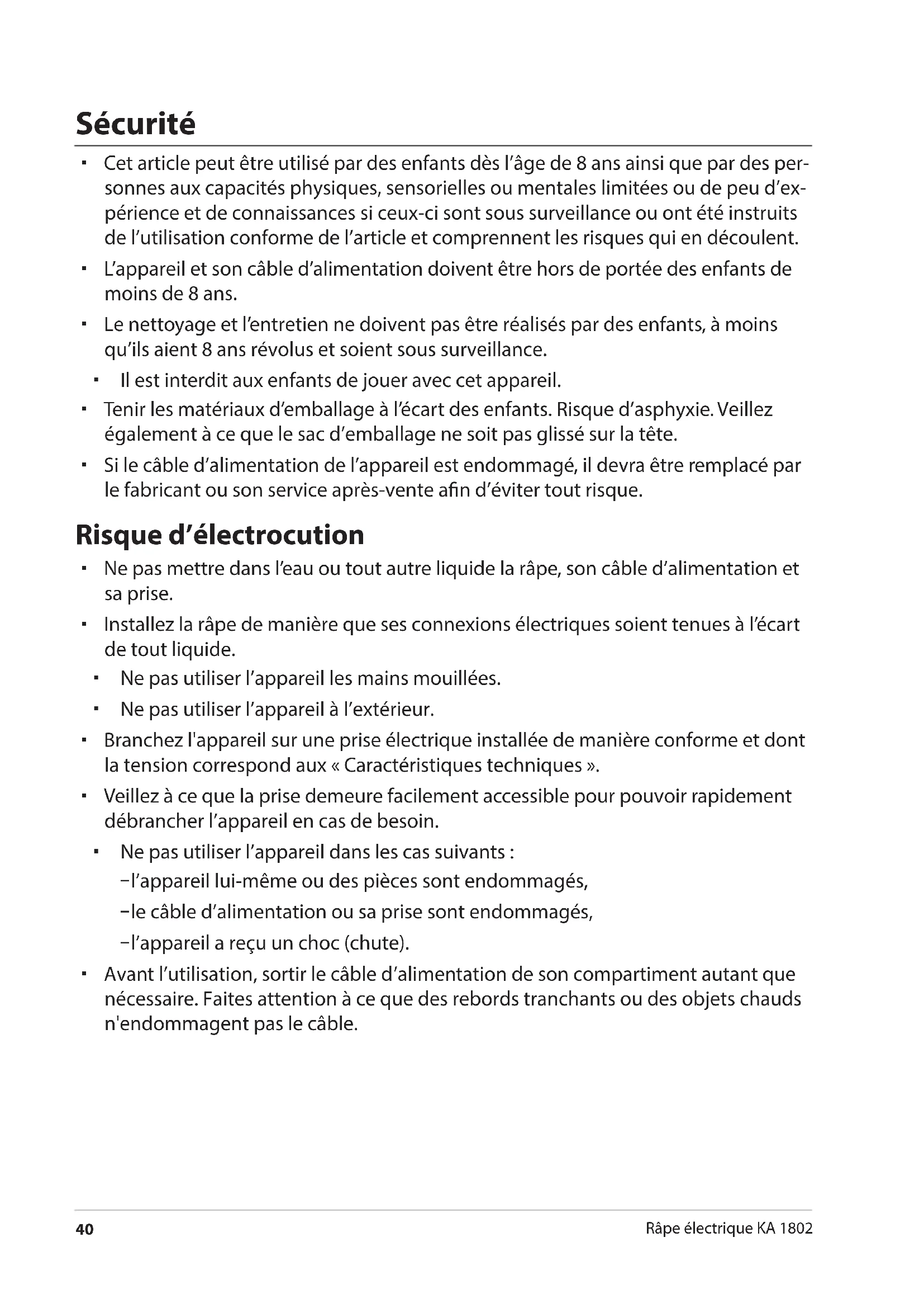 Râpe électrique KA 1802 Sécurité Cet article peut être utilisé par des enfants dès l’âge de 8ans ainsi que par des per- sonnes aux capacités physiques, sensorielles ou mentales limitées ou de peu d’ex- périence et de connaissances si ceux-ci sont sous surveillance ou ont été instruits de l’utilisation conforme de l’article et comprennent les risques qui en découlent. L’appareil et son câble d’alimentation doivent être hors de portée des enfants de moins de 8ans. Le nettoyage et l’entretien ne doivent pas être réalisés par des enfants, à moins qu’ils aient 8 ans révolus et soient sous surveillance. Il est interdit aux enfants de jouer avec cet appareil. Tenir les matériaux d’emballage à l’écart des enfants. Risque d’asphyxie. Veillez également à ce que le sac d’emballage ne soit pas glissé sur la tête. Si le câble d’alimentation de l’appareil est endommagé, il devra être remplacé par le fabricant ou son service après-vente an d’éviter tout risque. Risque d’électrocution Ne pas mettre dans l’eau ou tout autre liquide la râpe, son câble d’alimentation et sa prise. Installez la râpe de manière que ses connexions électriques soient tenues à l’écart de tout liquide. Ne pas utiliser l’appareil les mains mouillées. Ne pas utiliser l’appareil à l’extérieur. Branchez l'appareil sur une prise électrique installée de manière conforme et dont la tension correspond aux «Caractéristiques techniques». Veillez à ce que la prise demeure facilement accessible pour pouvoir rapidement débrancher l’appareil en cas de besoin. Ne pas utiliser l’appareil dans les cas suivants: − l’appareil lui-même ou des pièces sont endommagés, − le câble d’alimentation ou sa prise sont endommagés, − l’appareil a reçu un choc (chute). Avant l’utilisation, sortir le câble d’alimentation de son compartiment autant que nécessaire. Faites attention à ce que des rebords tranchants ou des objets chauds n'endommagent pas le câble.Sécurité