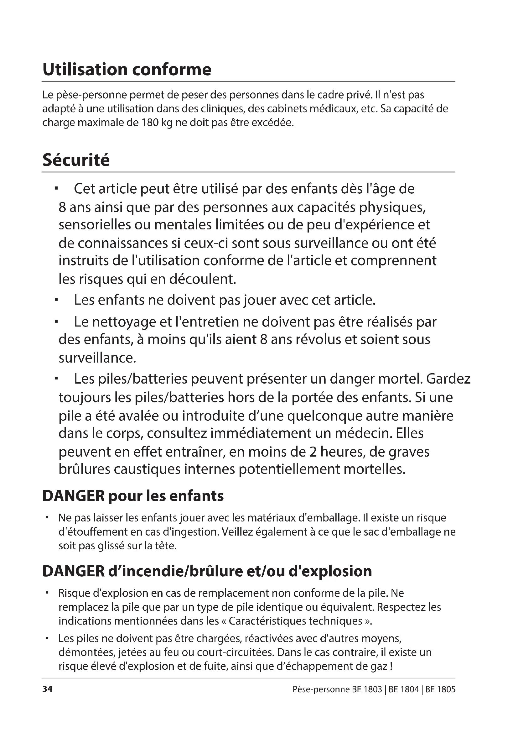 Pèse-personne BE 1803 | BE 1804 | BE 1805 Utilisation conforme Le pèse-personne permet de peser des personnes dans le cadre privé. Il n'est pas adapté à une utilisation dans des cliniques, des cabinets médicaux, etc. Sa capacité de charge maximale de 180kg ne doit pas être excédée. Sécurité Cet article peut être utilisé par des enfants dès l'âge de 8ans ainsi que par des personnes aux capacités physiques, sensorielles ou mentales limitées ou de peu d'expérience et de connaissances si ceux-ci sont sous surveillance ou ont été instruits de l'utilisation conforme de l'article et comprennent les risques qui en découlent. Les enfants ne doivent pas jouer avec cet article. Le nettoyage et l'entretien ne doivent pas être réalisés par des enfants, à moins qu'ils aient 8 ans révolus et soient sous surveillance. Les piles/batteries peuvent présenter un danger mortel. Gardez toujours les piles/batteries hors de la portée des enfants. Si une pile a été avalée ou introduite d’une quelconque autre manière dans le corps, consultez immédiatement un médecin. Elles peuvent en eet entraîner, en moins de 2 heures, de graves brûlures caustiques internes potentiellement mortelles. DANGER pour les enfants Ne pas laisser les enfants jouer avec les matériaux d'emballage. Il existe un risque d'étouement en cas d'ingestion. Veillez également à ce que le sac d'emballage ne soit pas glissé sur la tête. DANGER d’incendie/brûlure et/ou d'explosion Risque d'explosion en cas de remplacement non conforme de la pile. Ne remplacez la pile que par un type de pile identique ou équivalent. Respectez les indications mentionnées dans les «Caractéristiques techniques». Les piles ne doivent pas être chargées, réactivées avec d'autres moyens, démontées, jetées au feu ou court-circuitées. Dans le cas contraire, il existe un risque élevé d'explosion et de fuite, ainsi que d’échappement de gaz!Sécurité