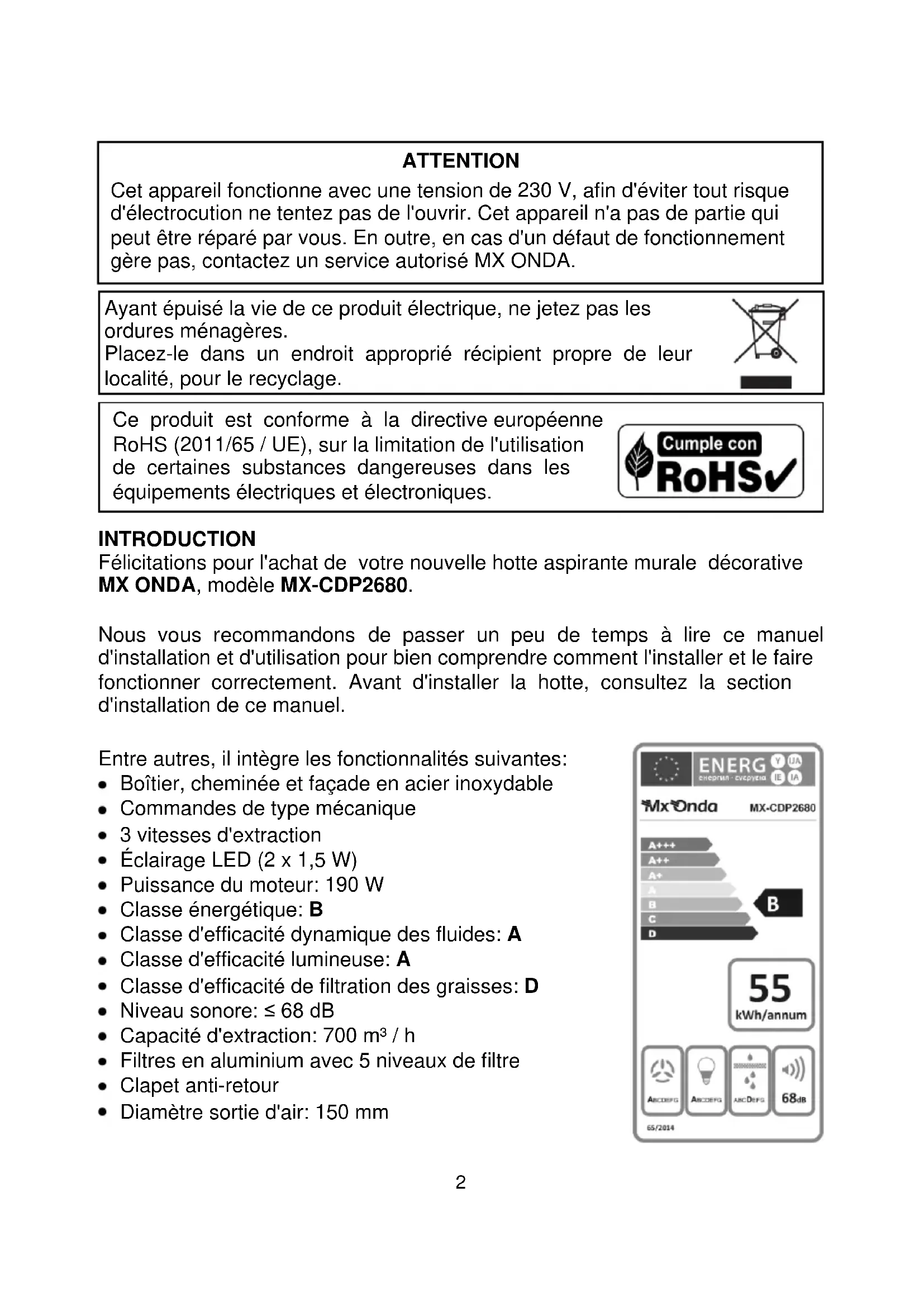 Ce produit est conforme à la directive européenne RoHS (2011/65 / UE), sur la limitation de l'utilisation de certaines substances dangereuses dans les équipements électriques et électroniques. INTRODUCTION Félicitations pour l'achat de votre nouvelle hotte aspirante murale décorative MX ONDA, modèle MX-CDP2680. Nous vous recommandons de passer un peu de temps à lire ce manuel d'installation et d'utilisation pour bien comprendre comment l'installer et le faire fonctionner correctement. Avant d'installer la hotte, consultez la section d'installation de ce manuel. Entre autres, il intègre les fonctionnalités suivantes: Boîtier, cheminée et façade en acier inoxydable Commandes de type mécanique 3 vitesses d'extraction Éclairage LED (2 x 1,5 W) Puissance du moteur: 190 W Classe énergétique: B Classe d'efficacité dynamique des fluides: A Classe d'efficacité lumineuse: A Classe d'efficacité de filtration des graisses: D Niveau sonore: ≤ 68 dB Capacité d'extraction: 700 m³ / h Filtres en aluminium avec 5 niveaux de filtre Clapet anti-retour Diamètre sortie d'air: 150 mm