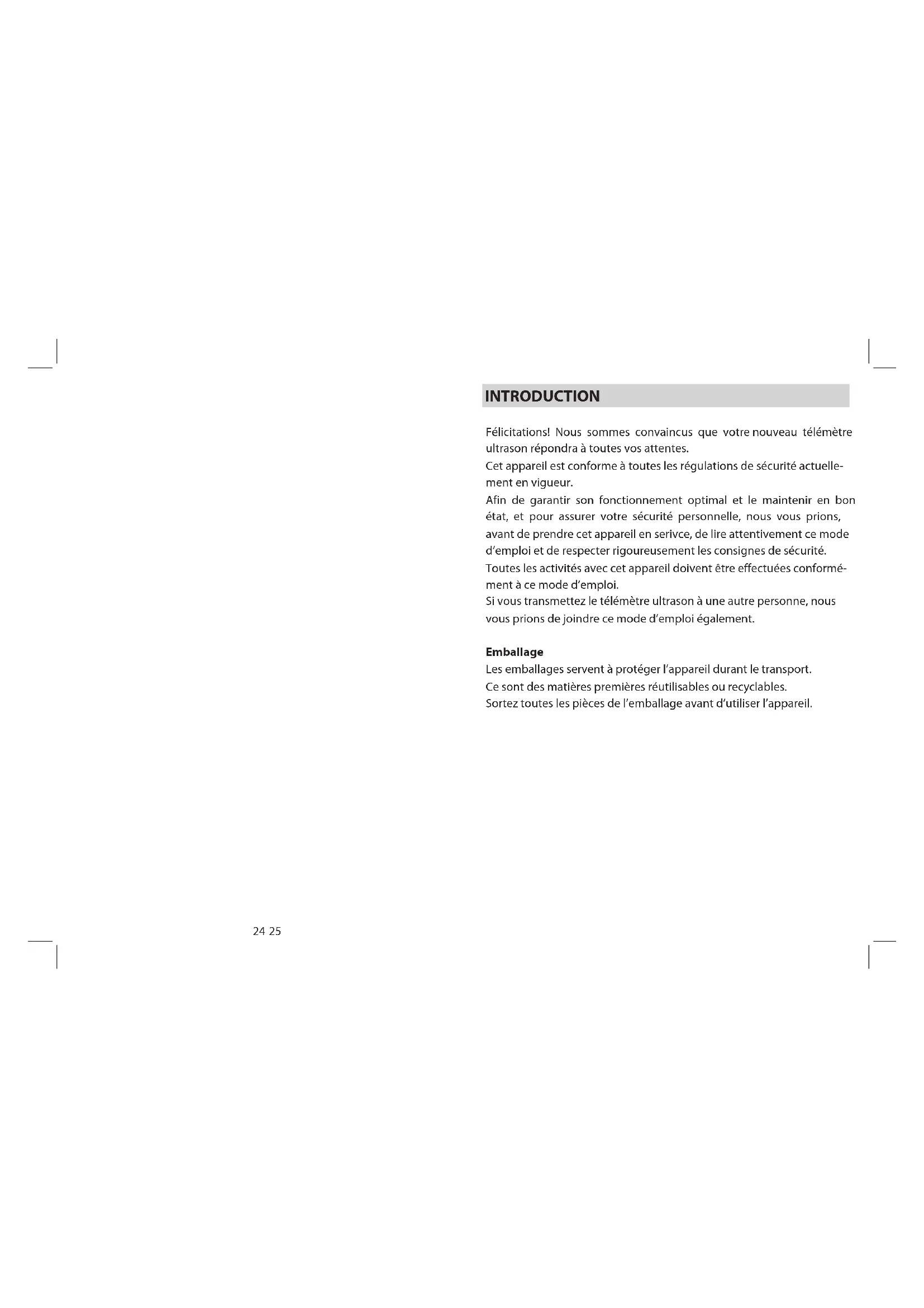 - Geheugeninhoud bij het laatste meetresultaat optellen: houd de +/= - toets ten minste 2 seconden ingedrukt tot er een dubbele pieptoonklinkt.„M+“verdwijntvanhetdisplay,indeondersteregel in het display staat nu de waarde uit het geheugen. BEDIENING22 23 TECHNISCHE GEGEVENS Naam Ultrasone afstandsmeter Type GT-UDM-07 Aanbevolen gebruik In gesloten ruimtes Meetbereik 0,6 tot 16 m (2’ tot 53’) Calculatiebereik: Lengte 9999,99 m ( 9999’ 11’’) Oppervlakte 99999,99 m² (99999.9 vierkante voet) Volume 999999 m³ (999999 kubieke voet) Resolutie 0,01 m Golflengte van de laser 630~660nm Temperatuurbereik 0°Ctot+40°C Laserklasse Klasse 2 Stroomvoorziening 9 V blokbatterij van de grootte 6F22/6LR61 Stroomverbruik < 50 mA Automatische uitschakeling Het apparaat schakelt bij niet- gebruik na ca. 60 seconden automatisch uit. Bedrijfstemperatuur 0° C tot 40° C (32° F tot 104° F) Afmetingen (lengte x breedte x hoogte) 155 mm x 72 mm x 41 mm Gewicht Ca. 150 g (zonder batterij) De ultrasone afstandsmeter is onderhoudsvrij. Reinig het apparaat met een droge of licht bevochtigde doek. OPBERGEN Bewaar het apparaat op een droge en vorstvrije plaats. Het apparaat moet buiten het bereik van kinderen worden bewaard. AFVOER Batterijen mogen niet met het huisvuil worden weggegooid, maar moeten bij de daarvoor bestemde inzamelcentra worden ingeleverd. Verpakkingsmaterialen zijn grondstoffen. Doe deze in het belang van de bescherming van het milieu weg op een wijze die rekening houdt met het milieu. Lever onbruikbaar geworden oude apparaten in bij inzamelplaatsen voor elektronisch afval. Uw lokale bestuur geeft u graag de benodigde informatie. REINIGING24 25 INTRODUCTION Félicitations! Nous sommes convaincus que votre nouveau télémètre ultrason répondra à toutes vos attentes. Cet appareil est conforme à toutes les régulations de sécurité actuelle- ment en vigueur. Afin de garantir son fonctionnement optimal et le maintenir en bon état, et pour assurer votre sécurité personnelle, nous vous prions, avant de prendre cet appareil en serivce, de lire attentivement ce mode d’emploi et de respecter rigoureusement les consignes de sécurité. Toutes les activités avec cet appareil doivent être effectuées conformé- ment à ce mode d’emploi. Si vous transmettez le télémètre ultrason à une autre personne, nous vous prions de joindre ce mode d’emploi également. Emballage Les emballages servent à protéger l’appareil durant le transport. Ce sont des matières premières réutilisables ou recyclables. Sortez toutes les pièces de l’emballage avant d’utiliser l’appareil.26 27 UTILISATION CONFORME L’appareil de mesure électronique GT-UDM-07 multi-usages sert à déterminer la distance d’un objet à l’aide de signaux de distance haute vitesse. La valeur mesurée est affichée sur l’écran. L’appareil est équipé d’une puce d’ordinateur et d’une fonction clé d’indicateur et de mémoire pour les mesures continuées et cumulées, le calcul auto- matique de surfaces et de volumes. C’est un outil indispensable pour l’industrie de la construction et l’aménagement intérieur (comme cour- tage immobilier, construction de meubles, métiers du bâtiment, etc.) L’appareil est doté d’une fonction d’orientation du laser, c’est à dire qu’il envoie un rayon laser rouge que vous pouvez orienter sur un objet. La compensation de température automatique de l’appareil fournit un résultat exact et affiche, en même temps, avec exactitude la tempéra- ture ambiante. L’appareil de mesure électronique GT-UDM-07 multi-usages est un appareil laser de la classe II et correspond aux directives de sécu- rité internationales 21 CFR 1040.10, 1040.11 et EN 60825-1 / A2: 2001/A1: 2002. Ne détachez pas les étiquettes de l’appareil. Mise en garde !