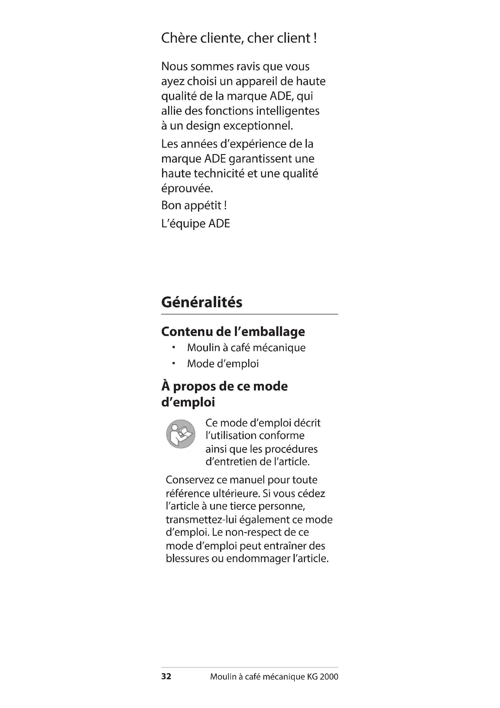Español Eliminación del embalaje Elimine el embalaje separando los materiales. Lleve el papel y cartón al contenedor de cartón y las láminas al de plásticos. Eliminación del molinillo de café − Elimine el molinillo conforme a la normativa vigente en su país. Garantía Estimada/o cliente, La empresa Waagen-Schmitt GmbH garantiza durante 2 años a partir de la fecha de compra la subsanación gratuita de los defectos debidos a fallos de material o fabricación, mediante reparación o cambio del equipo. En caso de solicitar la aplicación de la garantía, lleve el artículo a su distribuidor con el justificante de compra (explicando el motivo de la reclamación). Hamburgo, marzo de 2021 Waagen-Schmitt GmbH32 Moulin à café mécanique KG 2000 Chère cliente, cher client! Nous sommes ravis que vous ayez choisi un appareil de haute qualité de la marque ADE, qui allie des fonctions intelligentes à un design exceptionnel. Les années d’expérience de la marque ADE garantissent une haute technicité et une qualité éprouvée. Bon appétit! L’équipe ADE Généralités Contenu de l’emballage Moulin à café mécanique Mode d’emploi À propos de ce mode d’emploi Ce mode d’emploi décrit l’utilisation conforme ainsi que les procédures d’entretien de l’article. Conservez ce manuel pour toute référence ultérieure. Si vous cédez l’article à une tierce personne, transmettez-lui également ce mode d’emploi. Le non-respect de ce mode d’emploi peut entraîner des blessures ou endommager l’article.Moulin à café mécanique KG 2000