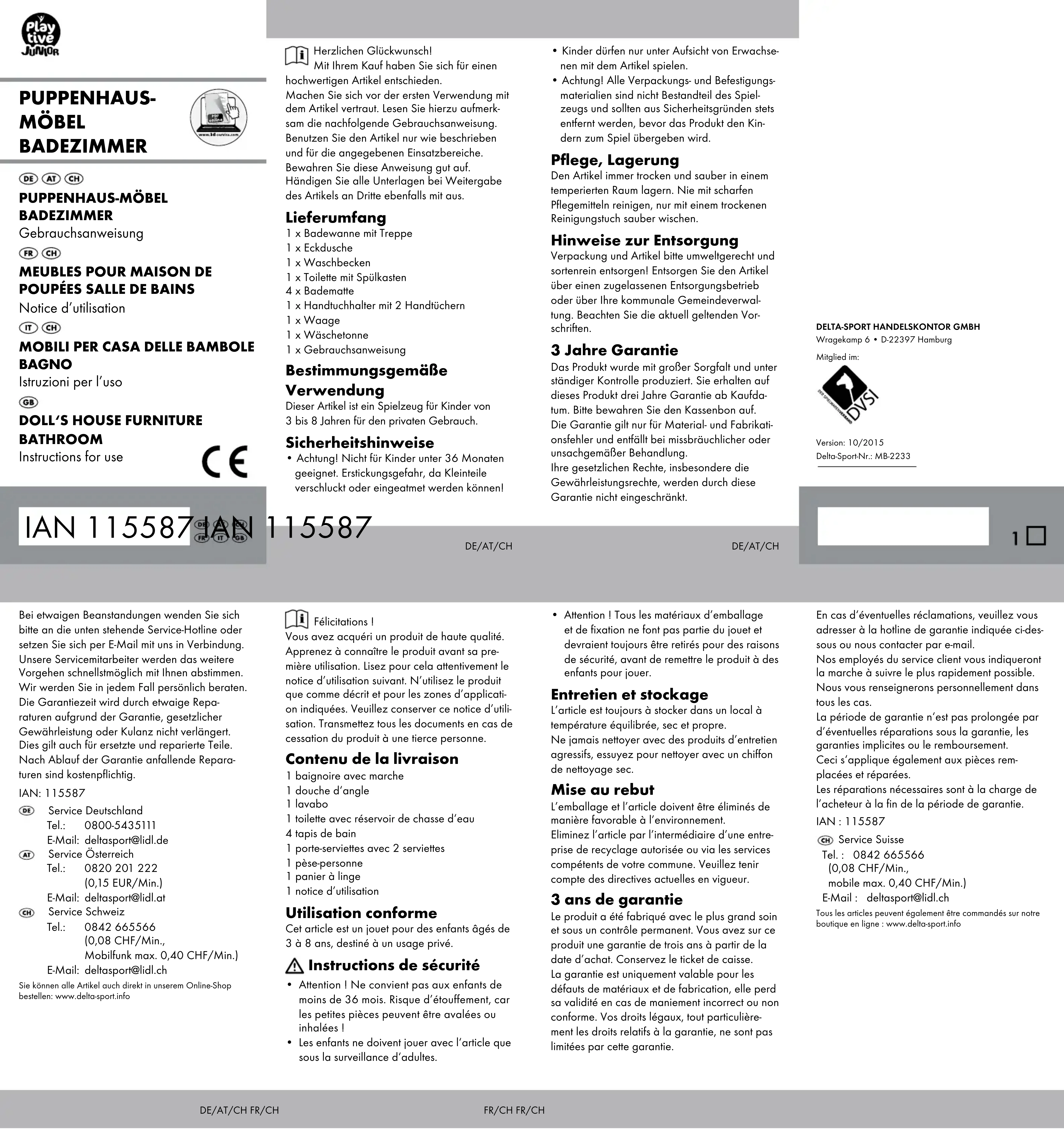 En cas d‘éventuelles réclamations, veuillez vous adresser à la hotline de garantie indiquée ci-des- sous ou nous contacter par e-mail. Nos employés du service client vous indiqueront la marche à suivre le plus rapidement possible. Nous vous renseignerons personnellement dans tous les cas. La période de garantie n‘est pas prolongée par d’éventuelles réparations sous la garantie, les garanties implicites ou le remboursement. Ceci s‘applique également aux pièces rem- placées et réparées. Les réparations nécessaires sont à la charge de l’acheteur à la fin de la période de garantie. IAN : 115587 Service Suisse Tel. : 0842 665566 (0,08 CHF/Min., mobile max. 0,40 CHF/Min.) E-Mail : deltasport@lidl.ch Tous les articles peuvent également être commandés sur notre boutique en ligne : www.delta-sport.infoDE/AT/CHDE/AT/CH FR/CHDE/AT/CHFR/CH FR/CH Félicitations ! Vous avez acquéri un produit de haute qualité. Apprenez à connaître le produit avant sa pre- mière utilisation. Lisez pour cela attentivement le notice d’utilisation suivant. N’utilisez le produit que comme décrit et pour les zones d’applicati- on indiquées. Veuillez conserver ce notice d’utili- sation. Transmettez tous les documents en cas de cessation du produit à une tierce personne. Contenu de la livraison 1 baignoire avec marche 1 douche d‘angle 1 lavabo 1 toilette avec réservoir de chasse d‘eau 4 tapis de bain 1 porte-serviettes avec 2 serviettes 1 pèse-personne 1 panier à linge 1 notice d’utilisation Utilisation conforme Cet article est un jouet pour des enfants âgés de 3 à 8 ans, destiné à un usage privé. Instructions de sécurité