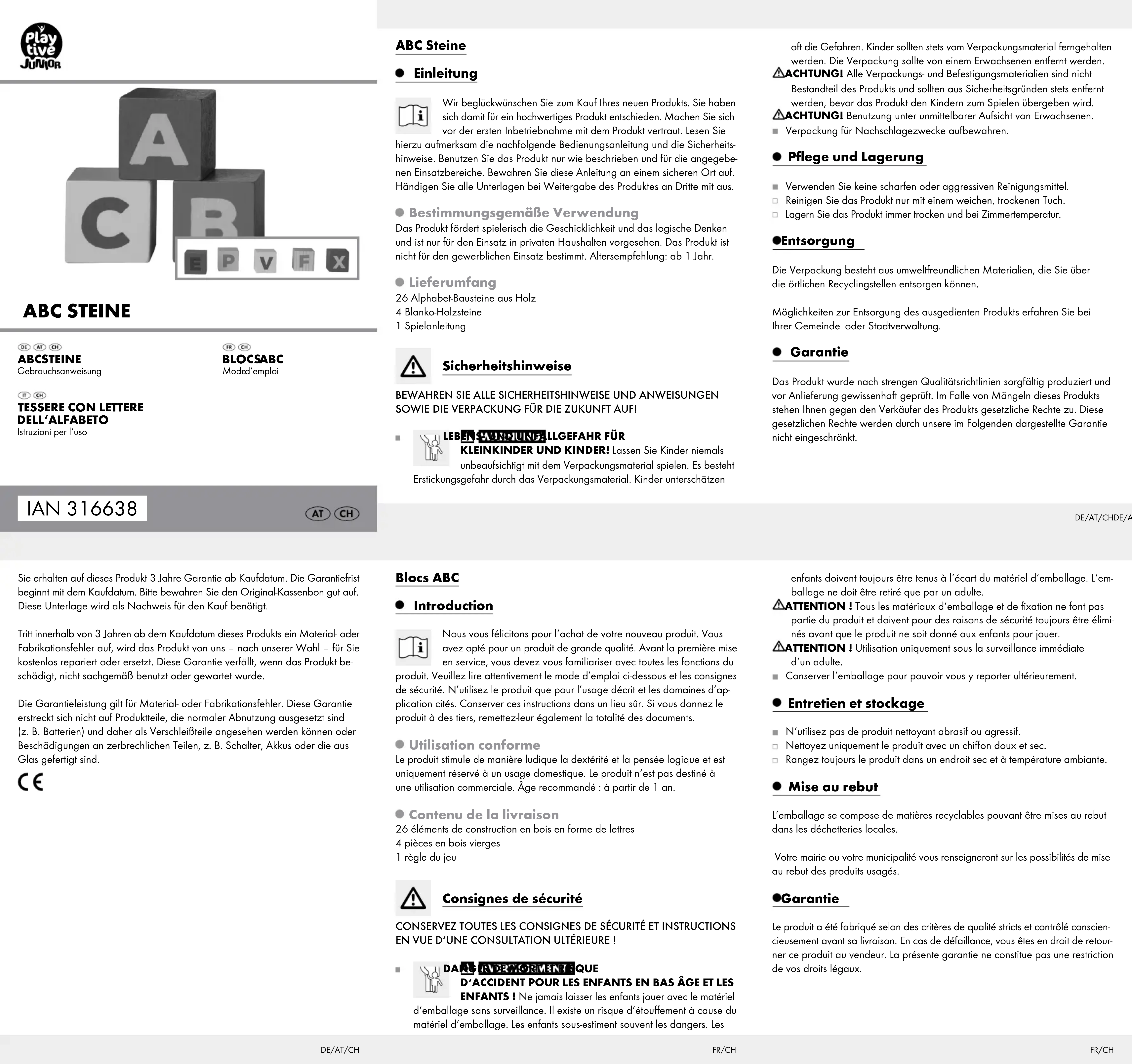 FR/CH Blocs ABC Introduction Nous vous félicitons pour l‘achat de votre nouveau produit. Vous avez opté pour un produit de grande qualité. Avant la première mise en service, vous devez vous familiariser avec toutes les fonctions du produit. Veuillez lire attentivement le mode d’emploi ci-dessous et les consignes de sécurité. N’utilisez le produit que pour l’usage décrit et les domaines d’ap- plication cités. Conserver ces instructions dans un lieu sûr. Si vous donnez le produit à des tiers, remettez-leur également la totalité des documents. Utilisation conforme Le produit stimule de manière ludique la dextérité et la pensée logique et est uniquement réservé à un usage domestique. Le produit n‘est pas destiné à une utilisation commerciale. Âge recommandé: à partir de 1 an. Contenu de la livraison 26 éléments de construction en bois en forme de lettres 4 pièces en bois vierges 1 règle du jeu Consignes de sécurité CONSERVEZ TOUTES LES CONSIGNES DE SÉCURITÉ ET INSTRUCTIONS EN VUE D‘UNE CONSULTATION ULTÉRIEURE !