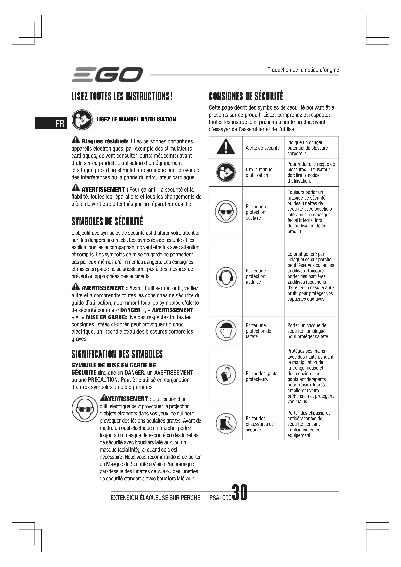 Cette page décrit des symboles de sécurité pouvant être présents sur ce produit. Lisez, comprenez et respectez toutes les instructions présentes sur le produit avant d’essayer de l’assembler et de l’utiliser.Alerte de sécuritéIndique un danger potentiel de blessure corporelle.Lire le manuel d’utilisationPour réduire le risque de blessures, l’utilisateur doit lire la notice d’utilisation.Porter une protection oculaireToujours porter un masque de sécurité ou des lunettes de sécurité avec boucliers latéraux et un masque facial intégral lors de l’utilisation de ce produit.Porter une protection auditiveLe bruit généré par l’élagueuse sur perche peut léser vos capacités auditives. Toujours porter des barrières auditives (bouchons d’oreille ou casque anti-bruit) pour protéger vos capacités auditives.Porter une protection de la têtePorter un casque de sécurité homologué pour protéger sa têtePorter des gants protecteursProtégez ses mains avec des gants pendant la manipulation de la tronçonneuse et de la chaîne. Les gants antidérapants pour travaux lourds améliorent votre préhension et protègent vos mains.Porter des chaussures de sécurité.Porter des chaussures antidérapantes de sécurité pendant l’utilisation de cet équipement. LISEZ TOUTES LES INSTRUCTIONS!