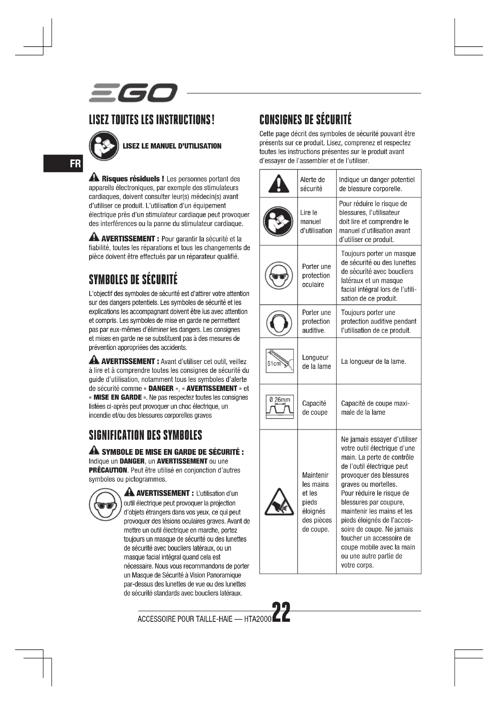 Cette page décrit des symboles de sécurité pouvant être présents sur ce produit. Lisez, comprenez et respectez toutes les instructions présentes sur le produit avant d’essayer de l’assembler et de l’utiliser.Alerte de sécuritéIndique un danger potentiel de blessure corporelle.Lire le manuel d’utilisationPour réduire le risque de blessures, l’utilisateur doit lire et comprendre le manuel d’utilisation avant d’utiliser ce produit.Porter une protection oculaireToujours porter un masque de sécurité ou des lunettes de sécurité avec boucliers latéraux et un masque facial intégral lors de l’utili-sation de ce produit.Porter une protection auditive.Toujours porter une protection auditive pendant l’utilisation de ce produit. 51cm Longueur de la lameLa longueur de la lame.Ø 26mmCapacité de coupeCapacité de coupe maxi-male de la lameMaintenir les mains et les pieds éloignés des pièces de coupe.Ne jamais essayer d’utiliser votre outil électrique d’une main. La perte de contrôle de l’outil électrique peut provoquer des blessures graves ou mortelles. Pour réduire le risque de blessures par coupure, maintenir les mains et les pieds éloignés de l’acces-soire de coupe. Ne jamais toucher un accessoire de coupe mobile avec la main ou une autre partie de votre corps.ACCESSOIRE POUR TAILLE-HAIE — HTA2000 23
