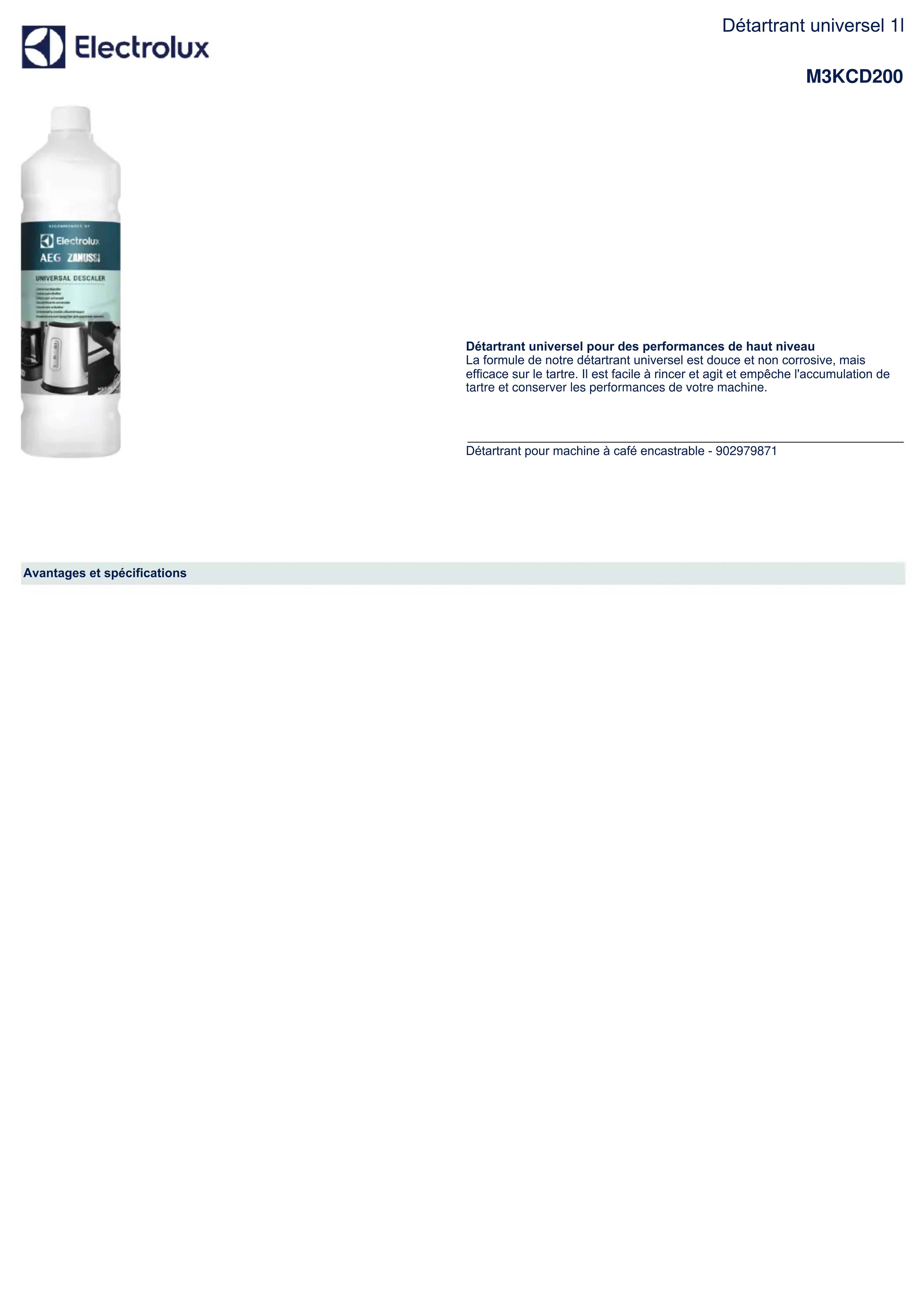 Détartrant pour machine à café encastrable - 902979871 Détartrant universel pour des performances de haut niveau La formule de notre détartrant universel est douce et non corrosive, mais efficace sur le tartre. Il est facile à rincer et agit et empêche l'accumulation de tartre et conserver les performances de votre machine. Avantages et spécifications Détartrant universel 1l M3KCD200Référence M3KCD200 Code EAN