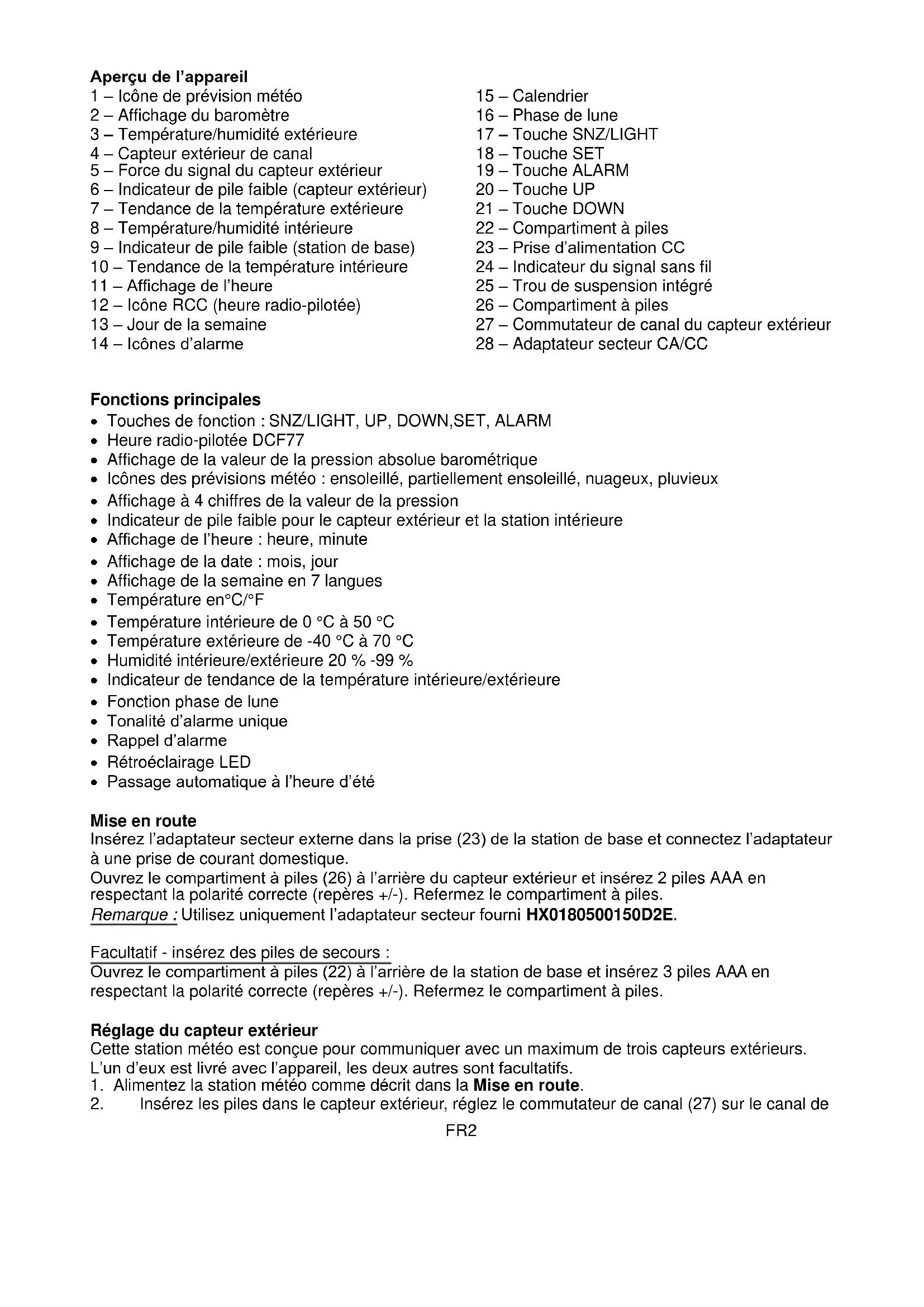 Fonctions principales Touches de fonction : SNZ/LIGHT, UP, DOWN,SET, ALARM Heure radio-pilotée DCF77 Affichage de la valeur de la pression absolue barométrique Icônes des prévisions météo : ensoleillé, partiellement ensoleillé, nuageux, pluvieux Affichage à 4 chiffres de la valeur de la pression Indicateur de pile faible pour le capteur extérieur et la station intérieure Affichage de l’heure : heure, minute Affichage de la date : mois, jour Affichage de la semaine en 7 langues Température en°C/°F Température intérieure de 0 °C à 50 °C Température extérieure de -40 °C à 70 °C Humidité intérieure/extérieure 20 % -99 % Indicateur de tendance de la température intérieure/extérieure Fonction phase de lune Tonalité d’alarme unique Rappel d’alarme Rétroéclairage LED Passage automatique à l’heure d’été Mise en route Insérez l’adaptateur secteur externe dans la prise (23) de la station de base et connectez l’adaptateur à une prise de courant domestique. Ouvrez le compartiment à piles (26) à l’arrière du capteur extérieur et insérez 2 piles AAA en respectant la polarité correcte (repères +/-). Refermez le compartiment à piles. Remarque : Utilisez uniquement l’adaptateur secteur fourni HX0180500150D2E. Facultatif - insérez des piles de secours : Ouvrez le compartiment à piles (22) à l’arrière de la station de base et insérez 3 piles AAA en respectant la polarité correcte (repères +/-). Refermez le compartiment à piles. Réglage du capteur extérieur Cette station météo est conçue pour communiquer avec un maximum de trois capteurs extérieurs. L’un d’eux est livré avec l’appareil, les deux autres sont facultatifs.
