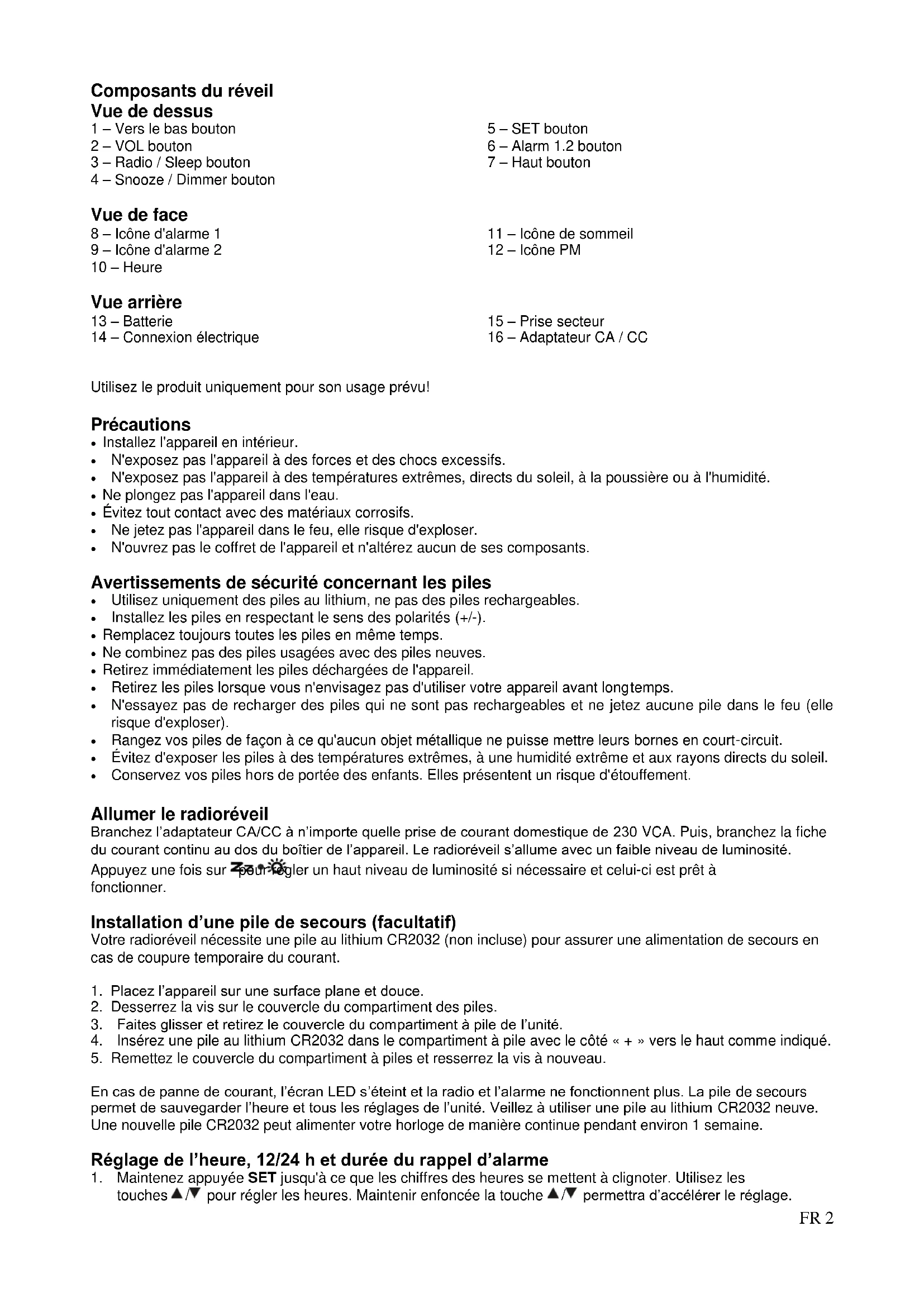 Utilisez le produit uniquement pour son usage prévu! Précautions Installez l'appareil en intérieur. N'exposez pas l'appareil à des forces et des chocs excessifs. N'exposez pas l'appareil à des températures extrêmes, directs du soleil, à la poussière ou à l'humidité. Ne plongez pas l'appareil dans l'eau. Évitez tout contact avec des matériaux corrosifs. Ne jetez pas l'appareil dans le feu, elle risque d'exploser. N'ouvrez pas le coffret de l'appareil et n'altérez aucun de ses composants. Avertissements de sécurité concernant les piles Utilisez uniquement des piles au lithium, ne pas des piles rechargeables. Installez les piles en respectant le sens des polarités (+/-). Remplacez toujours toutes les piles en même temps. Ne combinez pas des piles usagées avec des piles neuves. Retirez immédiatement les piles déchargées de l'appareil. Retirez les piles lorsque vous n'envisagez pas d'utiliser votre appareil avant longtemps. N'essayez pas de recharger des piles qui ne sont pas rechargeables et ne jetez aucune pile dans le feu (elle risque d'exploser). Rangez vos piles de façon à ce qu'aucun objet métallique ne puisse mettre leurs bornes en court-circuit. Évitez d'exposer les piles à des températures extrêmes, à une humidité extrême et aux rayons directs du soleil. Conservez vos piles hors de portée des enfants. Elles présentent un risque d'étouffement. Allumer le radioréveil Branchez l’adaptateur CA/CC à n’importe quelle prise de courant domestique de 230 VCA. Puis, branchez la fiche du courant continu au dos du boîtier de l’appareil. Le radioréveil s’allume avec un faible niveau de luminosité. Appuyez une fois sur pour régler un haut niveau de luminosité si nécessaire et celui-ci est prêt à fonctionner. Installation d’une pile de secours (facultatif) Votre radioréveil nécessite une pile au lithium CR2032 (non incluse) pour assurer une alimentation de secours en cas de coupure temporaire du courant.