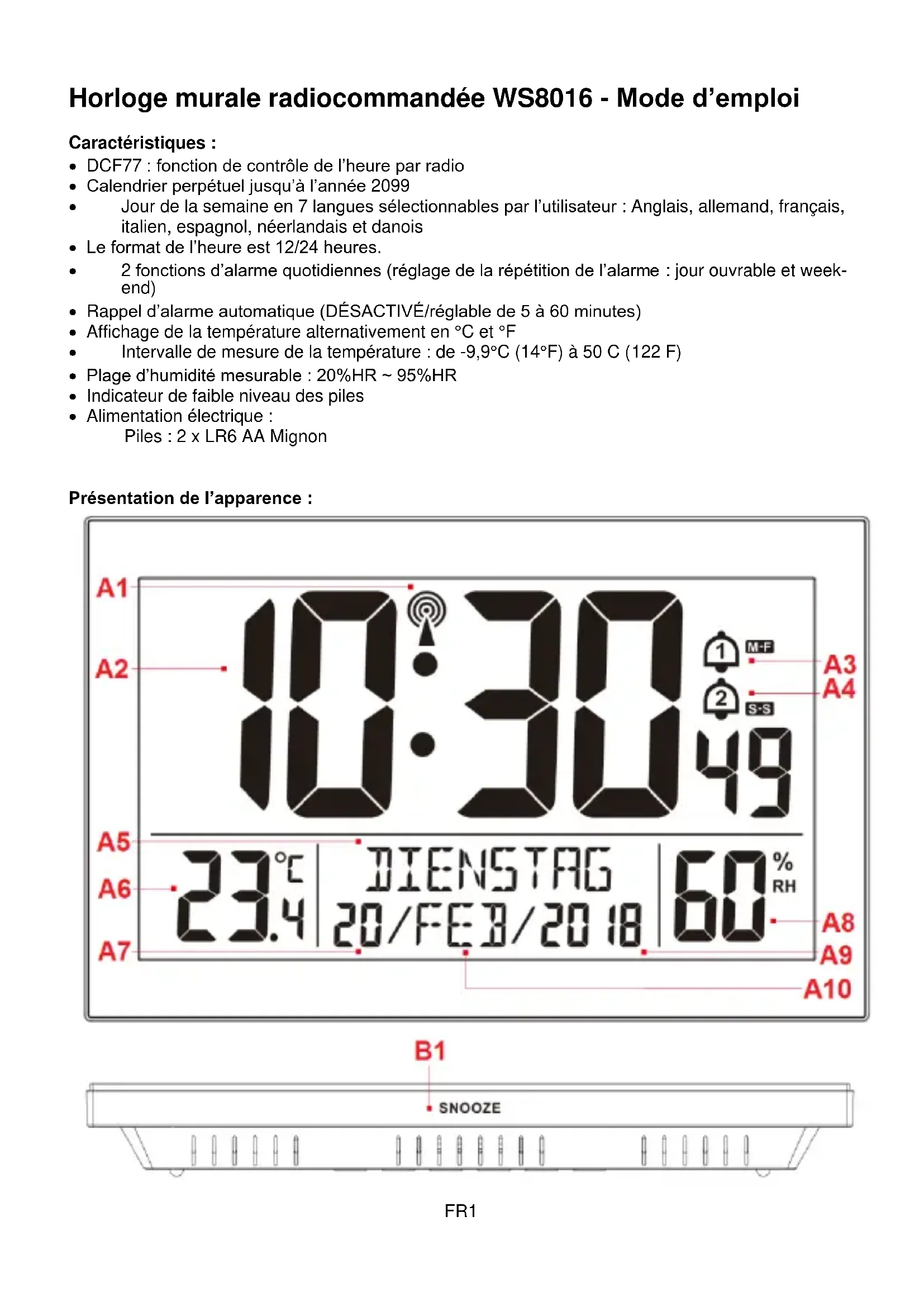 Mise en marche : Ouvrez le compartiment à piles. Insérez 2 piles AA en respectant la polarité correcte [marques « + » et « - »] Lorsque vous insérez les piles, toutes les icônes de l’écran LCD s’allument brièvement pendant 3 secondes, un bip est émis et l’horloge commence à chercher le signal radio. Réception de signal radio : L'horloge commence automatiquement la recherche de signal DCF 7 minutes après un redémarrage ou un changement de piles. L'icône d'antenne radio se met à clignoter. L'horloge effectue automatiquement une procédure de synchronisation avec le signal DCF pour corriger les écarts avec l'heure exacte à 1 heure, 2 heures et 3 heures. En cas d’échec des tentatives de synchronisation (l'icône d'antenne radio disparaît de l'écran), le systèmeFR3 essaie automatiquement une nouvelle synchronisation au bout d'une heure. Cette procédure est répétée automatiquement au maximum 5 fois. Pour lancer manuellement la réception du signal DCF, appuyez une fois sur la touche « WAVE ». Si aucun signal n’est reçu dans les 7 minutes, la recherche du signal DCF s’arrête (l’icône de l’antenne radio disparaît), vous devez alors recommencer à la prochaine heure pleine. Pour arrêter la recherche du signal radio, appuyez une fois sur la touche « WAVE ». Remarques : Une icône d’antenne radio clignotante indique que la réception du signal DCF a démarré Une icône d’antenne radio affichée de façon continue indique que le signal DCF est reçu avec succès Veillez à respecter une distance minimale de 2,5 m des sources d'interférence telles que téléviseurs ou écrans d'ordinateur. La réception du signal radio est plus faible dans des pièces avec murs en béton (ex. sous-sol) et dans les immeubles. Dans de telles circonstances extrêmes, placez le système près d’une fenêtre. En mode de réception radio DCF, seule la touche « WAVE » fonctionne, aucune autre touche ne fonctionne. Si vous souhaitez utiliser d’autres fonctions, appuyez sur la touche « WAVE » pour quitter le mode de réception radio DCF. Sélection du mode RCC activée /désactivée : Maintenez enfoncée la touche « WAVE » jusqu’à ce que le bip retentisse et que « RCC OFF » s’affiche brièvement sur l’écran LCD. L’horloge n’utilise plus la fonction radiocommandée. Maintenez enfoncée la touche « WAVE » jusqu’à ce que le bip retentisse et que « RCC ON » s’affiche brièvement sur l’écran LCD. L’horloge utilise à nouveau la fonction radiocommandée. Réglage de l’affichage de l’heure au format 12 ou 24 heures : Appuyez sur la touche « DOWN » pour changer l’heure affichée au format 12 heures ou 24 heures. RÉGLAGE MANUEL DE L’HEURE : Maintenez enfoncée la touche « SET » pendant 2 secondes, le paramètre sonore des touches : ON ou OFF est affiché. Appuyez sur la touche « UP » ou « DOWN » pour régler la sonnerie sur ON ou OFF. Appuyez sur la touche «MODE» pour confirmer votre réglage, le fuseau horaire se met à clignoter. Appuyez sur la touche « UP » ou « DOWN » pour régler le fuseau correct (-2 à +2). Appuyez sur la touche «SET» pour confirmer votre réglage, les heures se mettent à clignoter. Appuyez sur la touche « UP » ou « DOWN » pour régler l’heure correcte. Appuyez sur la touche «SET» pour confirmer votre réglage, les minutes se mettent à clignoter. Appuyez sur la touche « UP » ou « DOWN » pour régler les minutes correctes. Appuyez sur la touche «SET» pour confirmer votre réglage, l'année 2018 se met à clignoter. Appuyez sur la touche « UP » ou « DOWN » pour régler l’année correcte. Appuyez sur la touche «SET» pour confirmer votre réglage, le mois se met à clignoter. Appuyez sur la touche « UP » ou « DOWN » pour régler le mois correct. Appuyez sur la touche «SET» pour confirmer votre réglage, le jour se met à clignoter. Appuyez sur la touche « UP » ou « DOWN » pour régler le jour correct. Appuyez sur la touche « SET » pour confirmer votre réglage, la sélection de langues se met à clignoter. Appuyez sur la touche « UP » ou « DOWN » pour sélectionner une langue. Appuyez sur la touche «SET» pour confirmer votre réglage et terminer la procédure de réglage. Remarques :FR4 Si aucune touche n'est pressée pendant 20 secondes, l’horloge passe automatiquement du mode de réglage au mode d'affichage normal de l'heure. La valeur en secondes est automatiquement réinitialisée à 00 si la valeur en minutes est modifiée. En mode de réglage de l'heure, vous pouvez maintenir la pression sur les touches « UP » et « DOWN » pour rapidement modifier une valeur. Explication de l’affichage du fuseau horaire : Si vous vous trouvez dans un pays dans lequel l’horloge reçoit toujours le signal DCF, mais dans lequel l’heure locale actuelle est différente, vous pouvez utiliser le réglage du fuseau horaire pour régler votre horloge sur l’heure locale. Si, par exemple, l’heure locale du pays dans lequel vous vous trouvez est en retard d’une heure sur l’heure allemande, définissez l’affichage du fuseau horaire sur -01. Cette horloge est désormais contrôlée par DCF, mais l‘heure affichée est en retard d’une heure. L'icône DST s'affiche lorsque l'heure d'été est reçue. 7 langues sont disponibles : Anglais, allemand, français, italien, espagnol, néerlandais et danois Affichage de la langue de la semaine Langue Dimanche Lundi Mardi Mercredi Anglais SUNDAY MONDAY TUESDAY WENDESDAY Allemand SONNTAG MONTAG DIENSTAG MITTWOCH Français DIMANCHE LUNDI MARDI MERCREDI Italien DOMENICA LUNEDI MARTEDI MERCOLEDI Espagnol DOMINGO LUNES MARTES MIERCOLES Néerlandais ZONDAG MAANDAG DINSDAG WOENSDAG Danois SONDAG MONDAG TIRSDAG ONSDAG