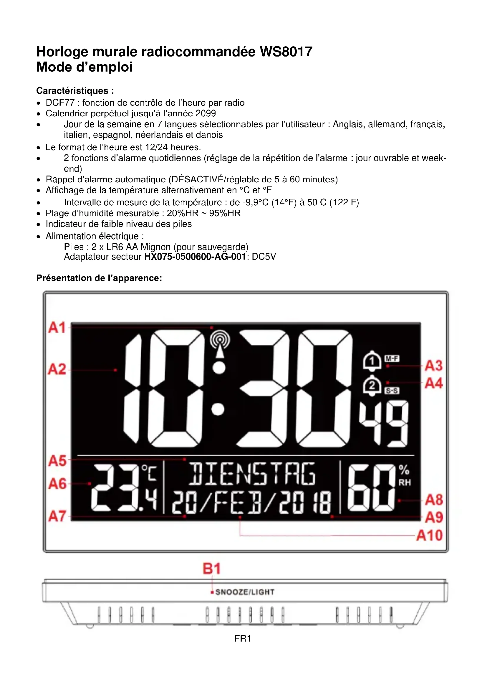 Mise en service Utilisez l'adaptateur secteur pour connecter l'horloge à une prise de courant domestique. Toutes les icônes de l'écran LCD s'allument brièvement pendant 3 secondes, vous entendez un bip sonore et l'horloge commence la recherche du signal radio. Mise en place des piles de secours (en option) Ouvrez le couvercle du compartiment des piles à l'arrière de l'horloge. Insérez 2 piles AA en respectant la polarité [repères "+" et "-"]. Refermez le couvercle du compartiment des piles.FR3 Effets de l'environnement sur la réception Votre horloge obtient l'heure exacte grâce à la technologie sans fil. Comme pour tout appareil sans fil, la réception peut être affectée dans les cas suivants : Distance de transmission longue Montagnes et vallées toutes proches Près d'autoroutes, chemins de fer, aéroports, câbles à haute tension, etc. À proximité d'un chantier de construction Entouré de bâtiments élevés À l'intérieur de bâtiments en béton À proximité d'appareils électriques (ordinateurs, téléviseurs, etc.) et des structures métalliques À l'intérieur de véhicules mobiles Placez votre horloge dans un endroit avec des signaux optimaux, par exemple près d'une fenêtre, loin des surfaces métalliques et des appareils électriques. Réception de signal radio : L'horloge commence automatiquement la recherche de signal DCF 7 minutes après un redémarrage ou un changement de piles. L'icône d'antenne radio se met à clignoter. L'horloge effectue automatiquement une procédure de synchronisation avec le signal DCF pour corriger les écarts avec l'heure exacte à 1 heure, 2 heures et 3 heures. En cas d’échec des tentatives de synchronisation (l'icône d'antenne radio disparaît de l'écran), le système essaie automatiquement une nouvelle synchronisation au bout d'une heure. Cette procédure est répétée automatiquement au maximum 5 fois. Pour lancer manuellement la réception du signal DCF, appuyez une fois sur la touche « WAVE ». Si aucun signal n’est reçu dans les 7 minutes, la recherche du signal DCF s’arrête (l’icône de l’antenne radio disparaît), vous devez alors recommencer à la prochaine heure pleine. Pour arrêter la recherche du signal radio, appuyez une fois sur la touche « WAVE ». Remarques : Une icône d’antenne radio clignotante indique que la réception du signal DCF a démarré Une icône d’antenne radio affichée de façon continue indique que le signal DCF est reçu avec succès Veillez à respecter une distance minimale de 2,5 m des sources d'interférence telles que téléviseurs ou écrans d'ordinateur. La réception du signal radio est plus faible dans des pièces avec murs en béton (ex. sous-sol) et dans les immeubles. Dans de telles circonstances extrêmes, placez le système près d’une fenêtre. En mode de réception radio DCF, seule la touche « WAVE » fonctionne, aucune autre touche ne fonctionne. Si vous souhaitez utiliser d’autres fonctions, appuyez sur la touche « WAVE » pour quitter le mode de réception radio DCF. Sélection du mode RCC activée /désactivée : Maintenez enfoncée la touche « WAVE » jusqu’à ce que le bip retentisse et que « RCC OFF » s’affiche brièvement sur l’écran LCD. L’horloge n’utilise plus la fonction radiocommandée. Maintenez enfoncée la touche « WAVE » jusqu’à ce que le bip retentisse et que « RCC ON » s’affiche brièvement sur l’écran LCD. L’horloge utilise à nouveau la fonction radiocommandée. Réglage de l’affichage de l’heure au format 12 ou 24 heures : Appuyez sur la touche « DOWN » pour changer l’heure affichée au format 12 heures ou 24 heures. RÉGLAGE MANUEL DE L’HEURE : Maintenez enfoncée la touche « SET/ » pendant 2 secondes, le paramètre sonore des touches : ON ou OFF est affiché. Appuyez sur la touche « UP » ou « DOWN » pour régler la sonnerie sur ON ou OFF.FR4 Appuyez sur la touche «SET/ » pour confirmer votre réglage, le fuseau horaire se met à clignoter. Appuyez sur la touche « UP » ou « DOWN » pour régler le fuseau correct (-2 à +2). Appuyez sur la touche «SET/ » pour confirmer votre réglage, les heures se mettent à clignoter. Appuyez sur la touche « UP » ou « DOWN » pour régler l’heure correcte. Appuyez sur la touche «SET/ » pour confirmer votre réglage, les minutes se mettent à clignoter. Appuyez sur la touche « UP » ou « DOWN » pour régler les minutes correctes. Appuyez sur la touche «SET/ » pour confirmer votre réglage, l'année 2018 se met à clignoter. Appuyez sur la touche « UP » ou « DOWN » pour régler l’année correcte. Appuyez sur la touche «SET/ » pour confirmer votre réglage, le mois se met à clignoter. Appuyez sur la touche « UP » ou « DOWN » pour régler le mois correct. Appuyez sur la touche «SET/ » pour confirmer votre réglage, le jour se met à clignoter. Appuyez sur la touche « UP » ou « DOWN » pour régler le jour correct. Appuyez sur la touche « SET/ » pour confirmer votre réglage, la sélection de langues se met à clignoter. Appuyez sur la touche « UP » ou « DOWN » pour sélectionner une langue. Appuyez sur la touche «SET/ » pour confirmer votre réglage et terminer la procédure de réglage. Remarques : Si aucune touche n'est pressée pendant 20 secondes, l’horloge passe automatiquement du mode de réglage au mode d'affichage normal de l'heure. La valeur en secondes est automatiquement réinitialisée à 00 si la valeur en minutes est modifiée. En mode de réglage de l'heure, vous pouvez maintenir la pression sur les touches « UP » et « DOWN » pour rapidement modifier une valeur. Explication de l’affichage du fuseau horaire : Si vous vous trouvez dans un pays dans lequel l’horloge reçoit toujours le signal DCF, mais dans lequel l’heure locale actuelle est différente, vous pouvez utiliser le réglage du fuseau horaire pour régler votre horloge sur l’heure locale. Si, par exemple, l’heure locale
