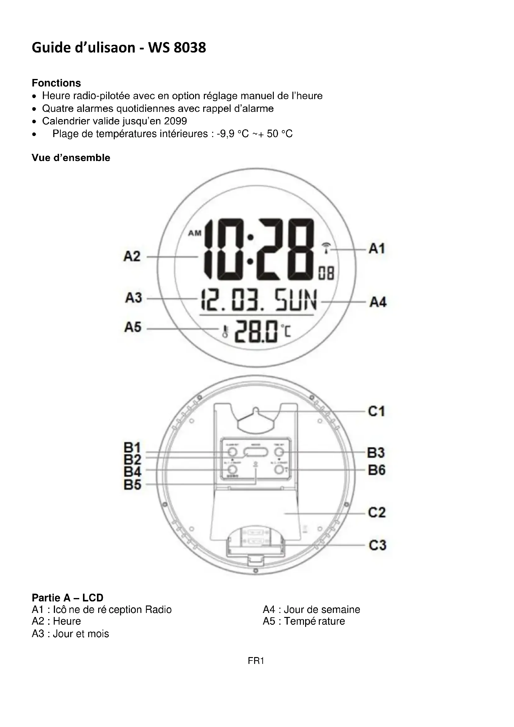 Heure radio-pilotée avec en option réglage manuel de l'heure - Quatre alarmes quotidiennes avec rappel d'alarme - Calendrier valide jusqu'en 2099 - Plage de températures intérieures: -9,9 °C ~ +50 °C