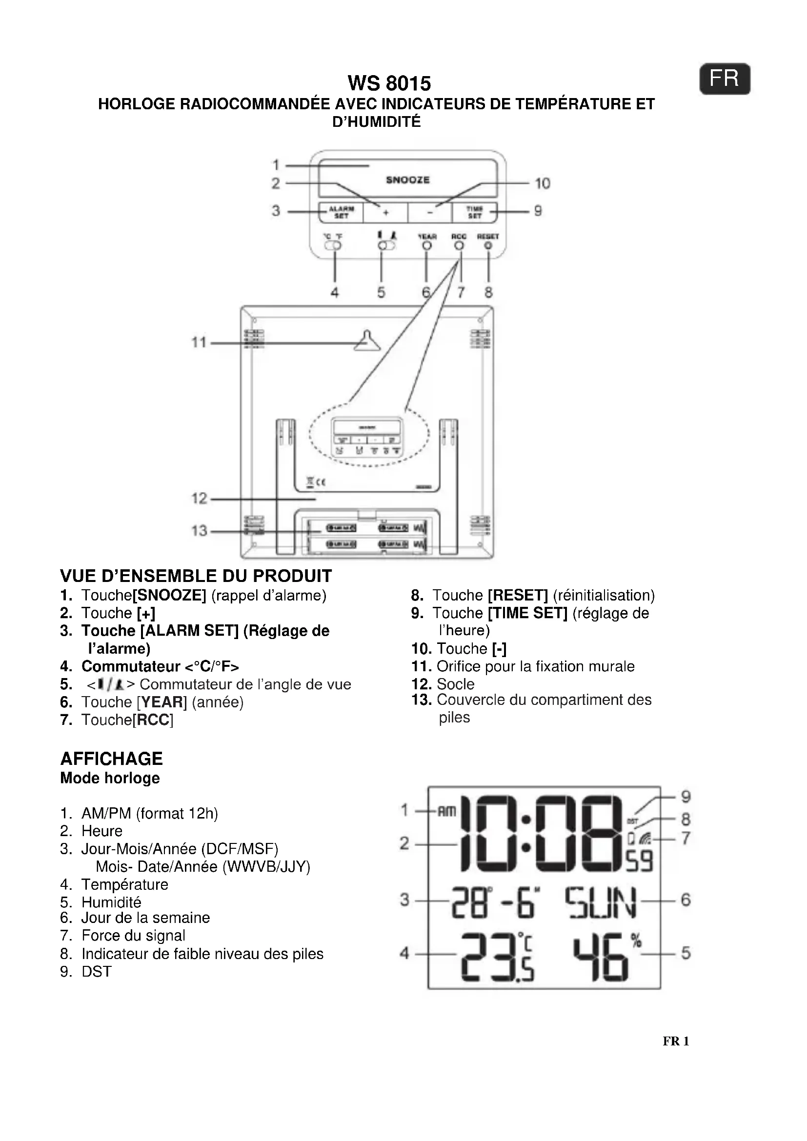 Quand l’indicateur de piles faibles « » s’affiche, il indique que la puissance des piles est insuffisante. Vous devez immédiatement remplacer les 4 piles AA. Remarque : Si l’horloge n’est pas utilisée sur une longue période de temps, veuillez retirer les piles. Attention ! N’exposez pas les piles à une chaleur excessive comme les rayons du soleil, le feu ou similaire. Pour vous débarrasser de votre appareil ou des piles, consultez les règlements en la matière de votre municipalité afin de protéger votre environnement.FR 5 SPÉCIFICATIONS Signal radiocommandé : DCF77 Température Plage d’affichage : De - 40 °C à +70 °C (de - 40 °F à 158 °F) Plage de températures : De 0 °C à +45 °C (de 32 °F à 113 °F) Précision - 5 °C à 0,1 °C +/- 2 °C