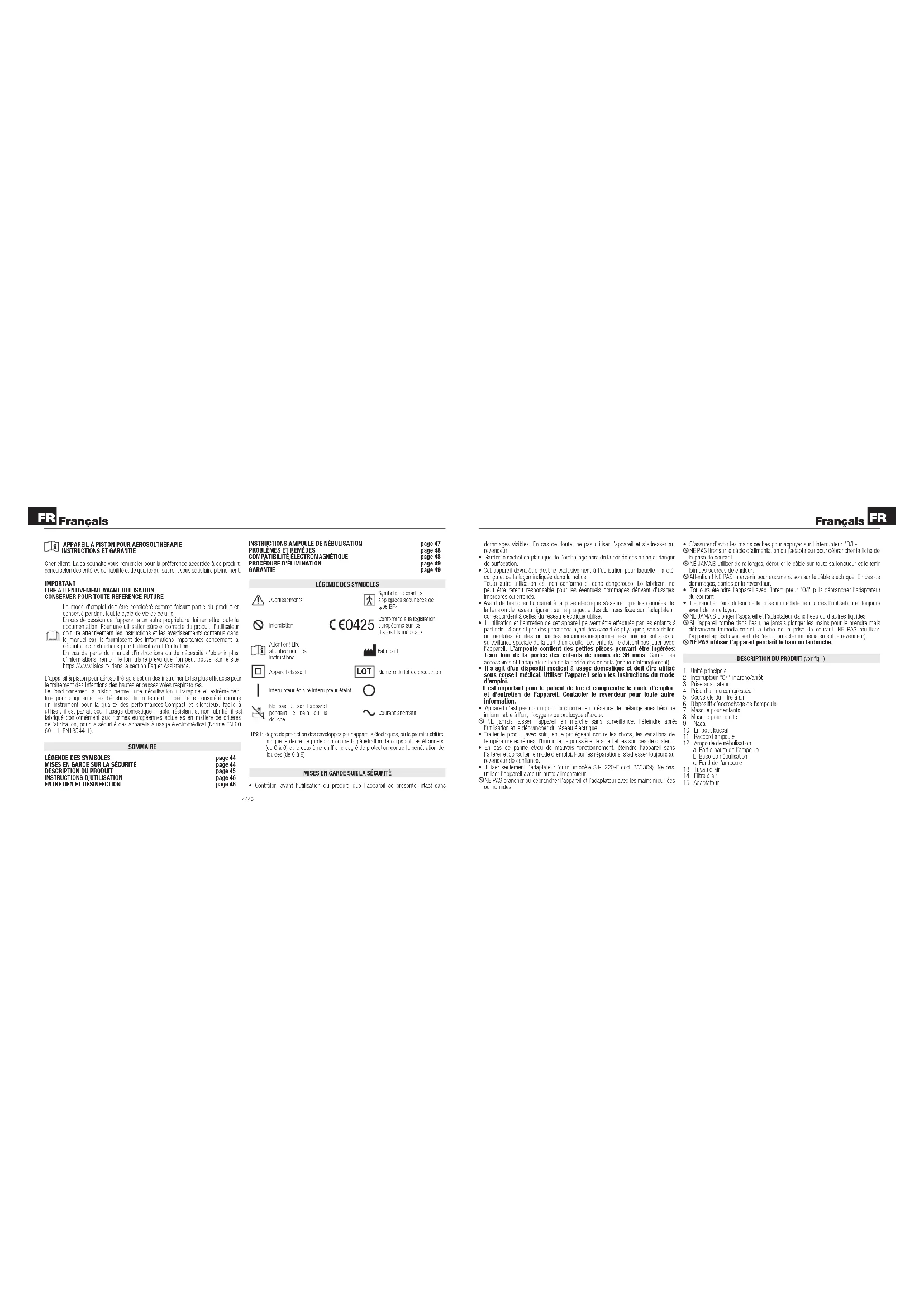 Français48 49 visser de nouveau le top sur le fond, puis insérer le raccord des accessoires sur la partie supérieure du nébuliseur et relier l’accessoire prescrit par le médecin à ce dernier. Relier fortement une extrémité du tuyau d’alimentation de l’air à l’ampoule et l’autre à l’appareil compresseur pour aérosolthérapie. Allumer le compresseur pour commencer le traitement. ATTENTION: NE JAMAIS INHALER DANS LA POSITION HORIZONTALE. NE PAS INCLINER LE NEBULISEUR AU DELA DE 60°. INDICATIONS POUR LE NETTOYAGE DE L’ APPAREIL A la fin de chaque utilisation, effectuer le nettoyage de tous les composants du nébuliseur en éliminant les résidus de médicament et d’éventuels dépôts de saleté. Traiter le nébuliseur et ses parties comme cela est indiqué ci-dessous, sauf le tuyau d’alimentation de l’air. Au cas où l’on effectuerait l’ application sur un autre patient ou au cas où il y aurait des saletés, substituer le tuyau. Nettoyer les composants (sauf le tube de l’air) sous de l’eau chaude (max 60°C) du robinet pendant 5 minutes environ en ajoutant éventuellement une quantité minimale de produit détergent (suivre les indications de dosage et de limitation d’emploi fournies par le fabricant du détergent). Rincer abondamment, enlever l’excès d’eau et laisser sécher à l’air dans un endroit propre. On peut désinfecter le nébuliseur et les accessoires (sauf le tuyau de l’air) avec des désinfectants chimiques que l’on peut trouver facilement en pharmacie et adaptés à l’emploi sur des matières plastiques (Milton®, Amuchina® etc.). Suivre les instructions, les indications de dosage et de limitation d’emploi fournies par le fabricant du désinfectant. Toutes les parties du nébuliseur peuvent être stérilisées à la vapeur (sauf le tube de l’air et les masques) à 121°C (20 minutes) ou 134°C (7 minutes). A la fin de la stérilisation, il faut toujours laisser refroidir l’appareil et ses parties à la température du milieu avant de l’utiliser. Ne pas répéter consécutivement le cycle de stérilisation sur l’appareil encore chaud.