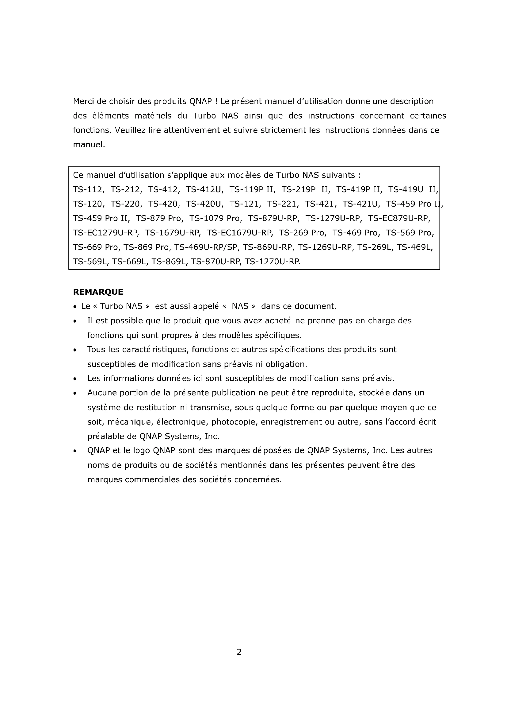 Turbo NAS QNAP Manuel d’utilisation du matériel © 2013. QNAP Systems, Inc. All Rights Reserved.2 Merci de choisir des produits QNAP ! Le présent manuel d‟utilisation donne une description des éléments matériels du Turbo NAS ainsi que des instructions concernant certaines fonctions. Veuillez lire attentivement et suivre strictement les instructions données dans ce manuel. Ce manuel d‟utilisation s‟applique aux modèles de Turbo NAS suivants : TS-112, TS-212, TS-412, TS-412U, TS-119P II, TS-219P II, TS-419P II, TS-419U II, TS-120, TS-220, TS-420, TS-420U, TS-121, TS-221, TS-421, TS-421U, TS-459 Pro II, TS-459 Pro II, TS-879 Pro, TS-1079 Pro, TS-879U-RP, TS-1279U-RP, TS-EC879U-RP, TS-EC1279U-RP, TS-1679U-RP, TS-EC1679U-RP, TS-269 Pro, TS-469 Pro, TS-569 Pro, TS-669 Pro, TS-869 Pro, TS-469U-RP/SP, TS-869U-RP, TS-1269U-RP, TS-269L, TS-469L, TS-569L, TS-669L, TS-869L, TS-870U-RP, TS-1270U-RP. REMARQUE Le « Turbo NAS » est aussi appelé « NAS » dans ce document. Il est possible que le produit que vous avez acheté ne prenne pas en charge des fonctions qui sont propres à des modèles spécifiques. Tous les caractéristiques, fonctions et autres spécifications des produits sont susceptibles de modification sans préavis ni obligation. Les informations données ici sont susceptibles de modification sans préavis. Aucune portion de la présente publication ne peut être reproduite, stockée dans un système de restitution ni transmise, sous quelque forme ou par quelque moyen que ce soit, mécanique, électronique, photocopie, enregistrement ou autre, sans l‟accord écrit préalable de QNAP Systems, Inc. QNAP et le logo QNAP sont des marques déposées de QNAP Systems, Inc. Les autres noms de produits ou de sociétés mentionnés dans les présentes peuvent être des marques commerciales des sociétés concernées.3