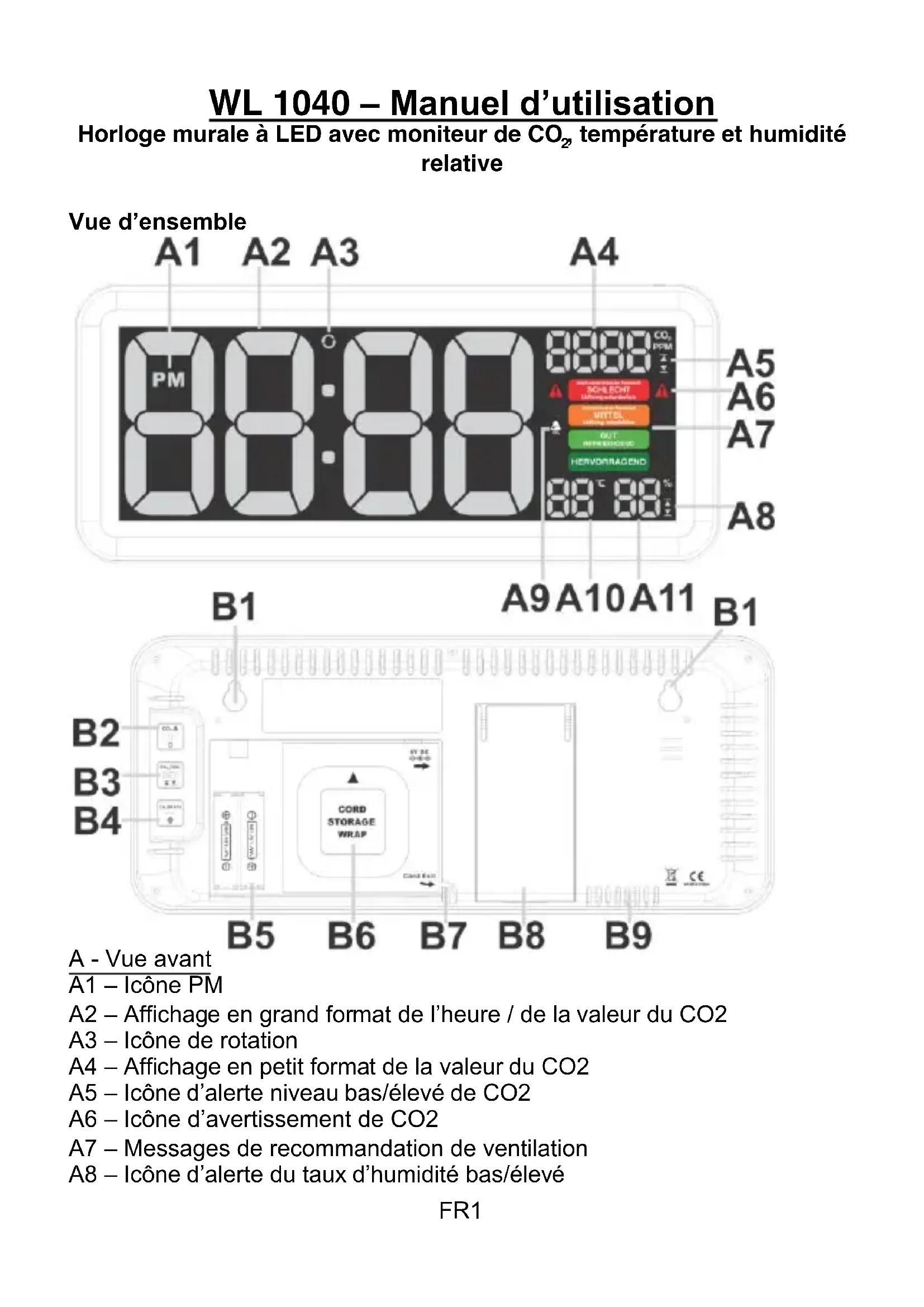 , température et humidité relative Vue d’ensemble A - Vue avant A1 – Icône PM A2 – Affichage en grand format de l’heure / de la valeur du CO2 A3 – Icône de rotation A4 – Affichage en petit format de la valeur du CO2 A5 – Icône d’alerte niveau bas/élevé de CO2 A6 – Icône d’avertissement de CO2 A7 – Messages de recommandation de ventilation A8 – Icône d’alerte du taux d’humidité bas/élevéFR2 A9 – Icône de l’alerte sonore de CO2 A10 – Température ambiante A11 – Humidité ambiante B – Vue arrière B1 – Trous d’accrochage B2 – Bouton +(plus) B3 – Bouton SET B4 – Bouton (minus) B5 – Compartiment à piles B6 – Compartiment de rangement du cordon de l’adaptateur secteur B7 – Sortie du cordon de l’adaptateur secteur B8 – Support B9 – Ventilation du capteur de CO2 Principales caractéristiques