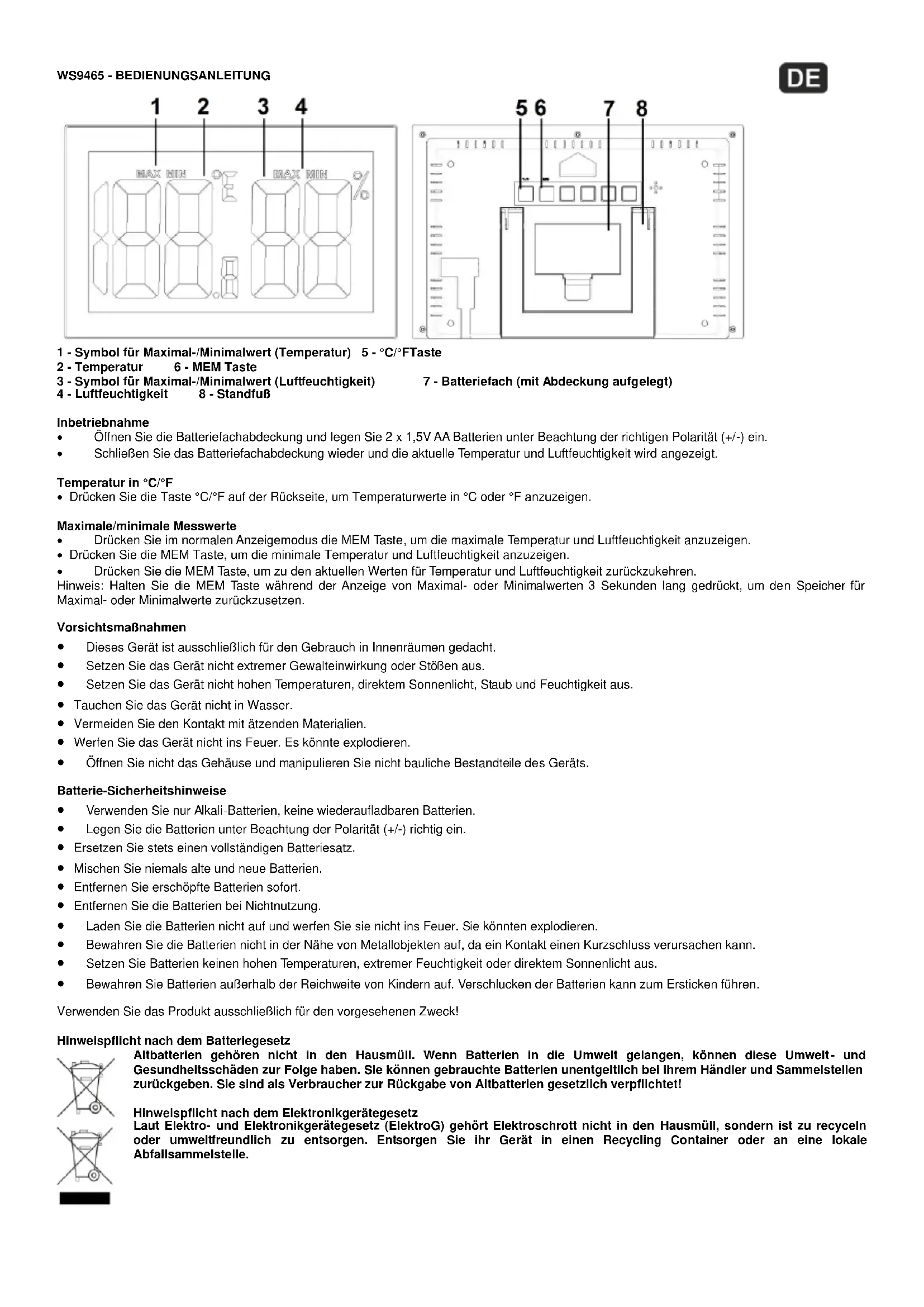 Mise en service Ouvrez le couvercle du compartiment des piles et insérez 2 piles AA de 1,5 V tout en respectant la polarité (+/-). Refermez le couvercle du compartiment des piles et la température et l'humidité actuelles s'affichent. Température en °C/°F Appuyez sur le bouton °C/°F au verso pour afficher les valeurs de température en °C ou °F. Valeurs maximales/minimales En mode d'affichage normal, appuyez sur la touche MEM pour afficher la température et l'humidité maximales. Appuyer sur la touche MEM pour afficher la température et l'humidité minimales. Appuyer sur la touche MEM pour revenir aux valeurs actuelles de température et d'humidité. Remarque: Pendant l'affichage des valeurs maximales ou minimales, appuyez sur la touche MEM et maintenez-la enfoncée pendant 3 secondes pour réinitialiser la mémoire des valeurs maximales ou minimales. Précautions Installez l'appareil en intérieur. N'exposez pas l'appareil à des forces et des chocs excessifs. N'exposez pas l'appareil à des températures extrêmes, directs du soleil, à la poussière ou à l'humidité. Ne plongez pas l'appareil dans l'eau. Évitez tout contact avec des matériaux corrosifs. Ne jetez pas l'appareil dans le feu, elle risque d'exploser. N'ouvrez pas le coffret de l'appareil et n'altérez aucun de ses composants. Avertissements de sécurité concernant les piles Utilisez uniquement des piles alcalines, ne pas des piles rechargeables. Installez les piles en respectant le sens des polarités (+/-). Remplacez toujours toutes les piles en même temps. Ne combinez pas des piles usagées avec des piles neuves. Retirez immédiatement les piles déchargées de l'appareil. Retirez les piles lorsque vous n'envisagez pas d'utiliser votre appareil avant longtemps. N'essayez pas de recharger des piles qui ne sont pas rechargeables et ne jetez aucune pile dans le feu (elle risque d'exploser). Rangez vos piles de façon à ce qu'aucun objet métallique ne puisse mettre leurs bornes en court-circuit. Évitez d'exposer les piles à des températures extrêmes, à une humidité extrême et aux rayons directs du soleil. Conservez vos piles hors de portée des enfants. Elles présentent un risque d'étouffement. Utilisez le produit uniquement pour son usage prévu! Noter l'obligation de la Loi sur la batterie Les piles ne doivent pas être déposées avec vos ordures ménagères. Dans le cas où vous le faites vous risquez de provoquer des dommages importants à votre environnement ou à la santé d'autrui. Vous pouvez rendre les piles usagées à votre commerçant qui vous les a vendues ou d'office à une collecte. Vous en tant qu'utilisateur ou consommateur vous êtes obligés par la loi de retourner les piles usagées! Noter l'obligation de la Loi sur les appareils électriques Ce symbole signifie que les appareils électriques ne doivent pas être jetés aux ordures ménagères à la fin de leur vie utile. Ramenez votre appareil à votre point local de collecte de déchets ou à un centre de recyclage. Ceci s'applique à tous les pays de l'Union européenne et aux autres pays européens disposant d'un système de collecte des déchets sélectif.WS9465 - MANUAL DE INSTRUCCIONES