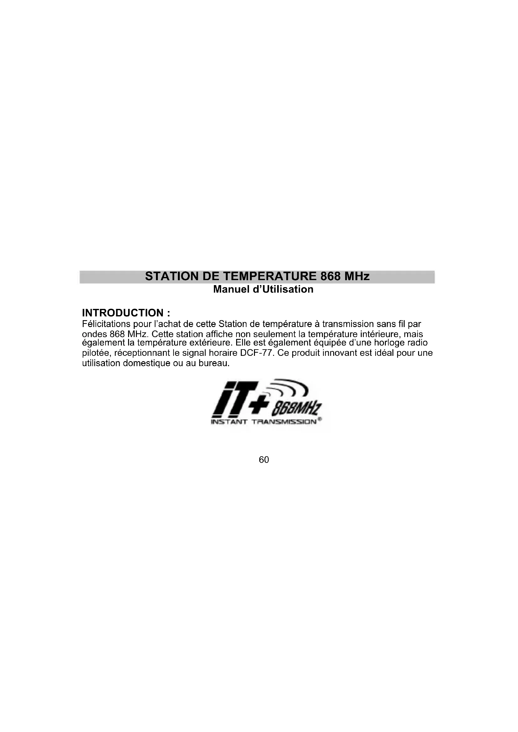 Manuel d’Utilisation INTRODUCTION : Félicitations pour l’achat de cette Station de température à transmission sans fil par ondes 868 MHz. Cette station affiche non seulement la température intérieure, mais également la température extérieure. Elle est également équipée d’une horloge radio pilotée, réceptionnant le signal horaire DCF-77. Ce produit innovant est idéal pour une utilisation domestique ou au bureau.61 CARACTERISTIQUES: Station de Température