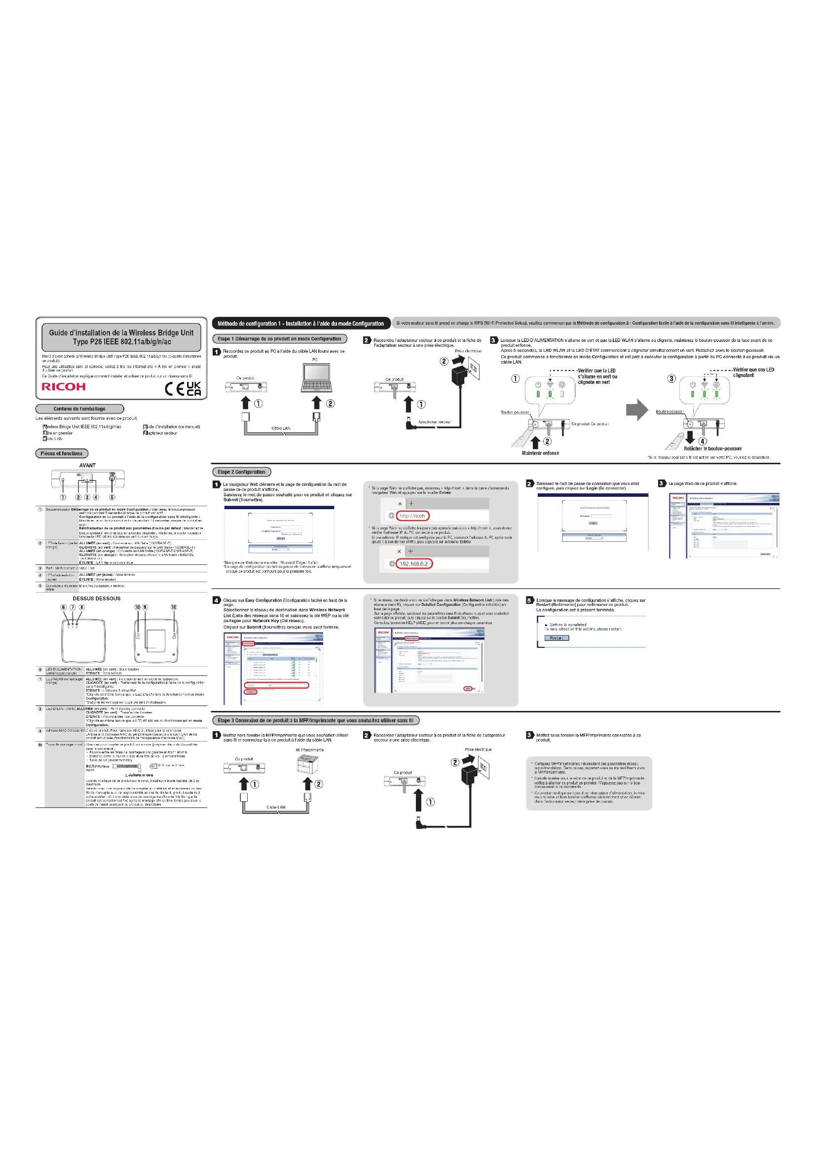 Guide d’installation de la Wireless Bridge Unit Type P26 IEEE 802.11a/b/g/n/ac Merci d’avoir acheté la Wireless Bridge Unit Type P26 IEEE 802.11a/b/g/n/ac (ci-après dénommée ce produit).Pour une utilisation sûre et correcte, veillez à lire les informations « À lire en premier » avant d’utiliser ce produit.Ce Guide d’installation explique comment installer et utiliser ce produit sur un réseau sans fil. Contenu de l’emballage Les éléments suivants sont fournis avec ce produit. Wireless Bridge Unit IEEE 802.11a/b/g/n/ac À lire en premier Câble LAN Guide d’installation (ce manuel) Adaptateur secteur Pièces et fonctions AVANT Bouton-poussoir Démarrage de ce produit en mode Configuration : Maintenez le bouton-poussoir enfoncé pendant 5 secondes lorsque ce produit est actif.Configuration de ce produit à l’aide de la configuration sans fil intelligente : Maintenez le bouton-poussoir enfoncé pendant 10 secondes lorsque ce produit est actif.Réinitialisation de ce produit aux paramètres d’usine par défaut : Maintenez le bouton-poussoir enfoncé tout en allumant ce produit. Relâchez le bouton-poussoir lorsque la LED WLAN s’allume en vert puis en rouge.LED de liaison (verte/orange)ALLUMÉE (en vert) : Connecté au LAN filaire (1000BASE-T).CLIGNOTE (en vert) : Réception de paquets sur le LAN filaire (1000BASE-T).ALLUMÉE (en orange) : Connecté au LAN filaire (100BASE-TX/10BASE-T).CLIGNOTE (en orange) : Réception de paquets sur le LAN filaire (100BASE-TX/10BASE-T).ÉTEINTE : LAN filaire non connecté.Port LAN Branchez le câble LAN.LED d’alimentation (jaune)ALLUMÉE (en jaune) : Sous tensionÉTEINTE : Hors tensionConnecteur d’alimen-tationBranchez l’adaptateur secteur. DESSUS DESSOUS LED D’ALIMENTATION (verte/rouge/orange)ALLUMÉE (en vert) : Sous tensionÉTEINTE : Hors tensionLED WLAN (verte/rouge/orange)ALLUMÉE (en vert) : Fonctionnement en mode Infrastructure.CLIGNOTE (en vert) : Traitement de la configuration à l’aide de la configuration sans fil intelligente.ÉTEINTE : LAN sans fil désactivé.*Clignote en même temps que la LED D’ÉTAT lors du fonctionnement en mode Configuration.*S’allume en vert puis en rouge pendant l’initialisation.LED D’ÉTAT (verte) ALLUMÉE (en vert) : Point d’accès connecté.CLIGNOTE (en vert) : Transfert de données.ÉTEINTE : Point d’accès non connecté.*Clignote en même temps que la LED WLAN lors du fonctionnement en mode Configuration.Adresse MAC Adresse MAC de ce produit. Pour l’adresse MAC à utiliser pour la connexion LAN sans fil, l’adresse MAC du périphérique connecté à un port LAN de ce produit est utilisée (fonctionnalité de transparence d’adresse MAC).Trous de montage mural Utilisez-les pour monter ce produit sur un mur (préparez deux vis disponibles dans le commerce).• Espace entre les trous de montage mural gauche et droit : 90 mm• Distance entre le mur et le bas de la tête de vis : 2 mm minimum• Taille de vis (recommandée) Φ6mm to 7mmΦ3.7mm or less2.4mm or less Φ3,7mmoumoins2,4 mm ou moinsΦ6mmà7mmLors du montage de ce produit sur un mur, installez-le à une hauteur de 2 m maximum.Sélectionnez une longueur de vis adaptée au matériau et à l’épaisseur du mur.Ricoh n’accepte aucune responsabilité en cas de chute du produit ou de tout autre accident dû à une résistance de montage insuffisante. Vérifiez que le produit est correctement fixé après le montage afin qu’il ne tombe pas sous le poids de l’unité principale du produit ou des câbles. Méthode de configuration1 -Installation à l’aide du mode Configuration Si votre routeur sans fil prend en charge le WPS (Wi-Fi Protected Setup), veuillez commencer par la Méthode de configuration2 -Configuration facile à l’aide de la configuration sans fil intelligente à l’arrière. Étape1 Démarrage de ce produit en mode Configuration
