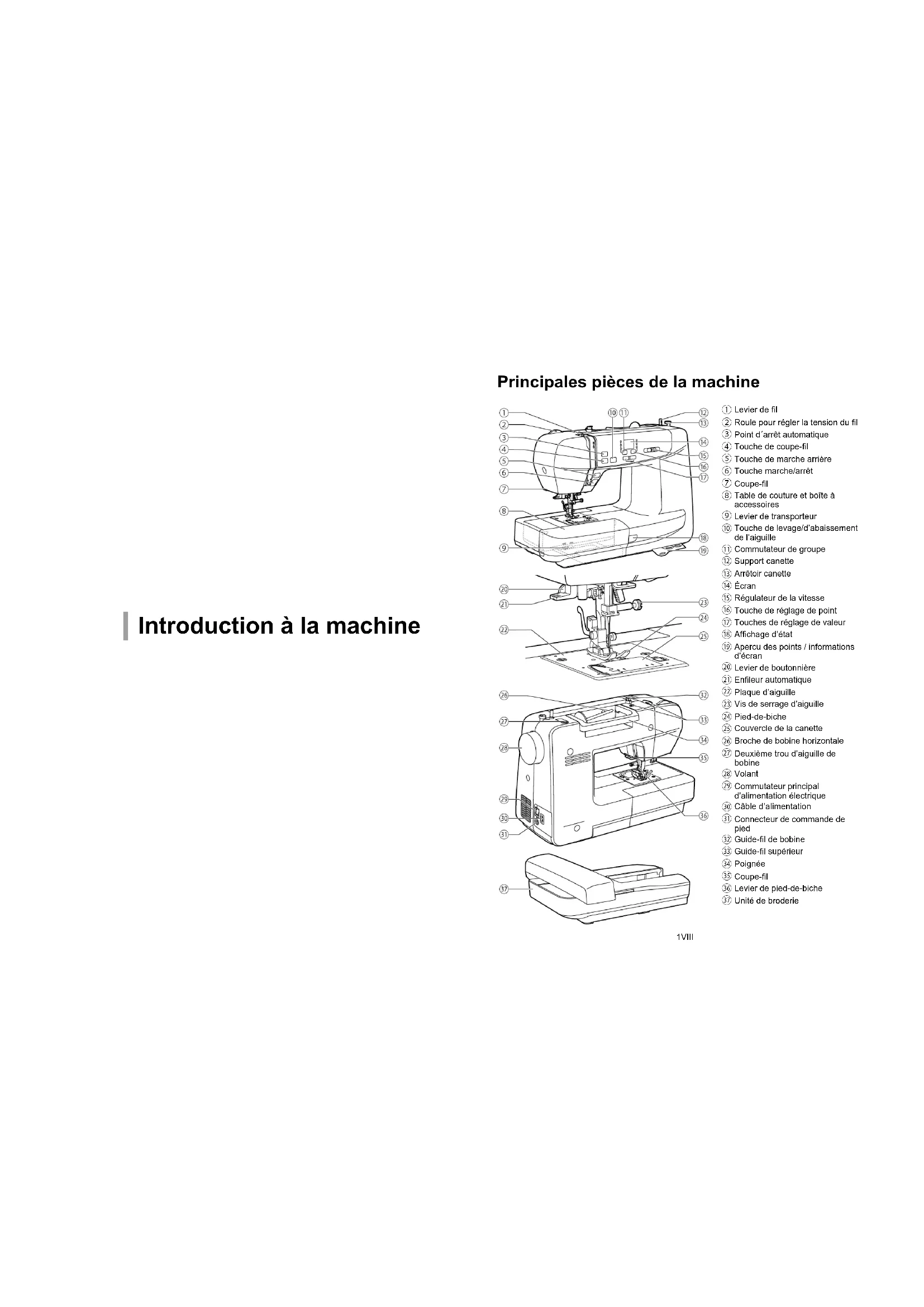 - Danger! Choc électrique dû à l’humidité - Utilisez et rangez cette machine à coudre uniquement dans des endroits secs. - L’humidité et la moisissure pourraient entraîner un risque d’électrocution. Danger! Blessures oculaires dues à une rupture d’aiguille - Cousez uniquement des textiles exibles et souples. - La machine n’est pas conçue pour la couture de matières comme le cuir dur et rigide, des bâches, des toiles, etc., susceptibles de rompre l’aiguille. - L’aiguille peut se rompre lorsqu’au lieu d’un déplacement par entraînement du tissu, l’utilisateur le pousse ou le freine. Danger! Piqûres dues à une manoeuvre involontaire - La machine doit uniquement être utilisée par des personnes adultes et habiles. - Les enfants à partir de 8 ans et les personnes avec des capacités réduites doivent uniquement utiliser la machine d’après les instructions détaillées et sous supervision permanente. Ils doivent avoir compris les danger de la machine. - Les enfants à partir de 8 ans et les personnes avec des capacités réduites doivent uniquement faire les travaux de maintenance et de nettoyage d’après les instructions détaillées et sous supervision permanente. - Une fois la machine opérationnelle, ne la laissez pas à des endroits accessibles aux enfants. Evitez que les enfants ne peuvent pas jouer avec la machine. - Mettez la machine hors tension durant les travaux de préparation et de réglage. Danger! Risques de blessure dus aux défauts ou aux modications - Aucune modication ne doit être apportée à la machine. - Les travaux de réparation doivent être effectués par un service qualié. Les dommages, les modications ou l’utilisation des accessoires de tiers peuvent provoquer des blessures. - Évitez d’utiliser des machines défectueuses. - Des câbles courant défectueux doivent être remplacés par une pièce détachée original.V Contenu Introduction à la machine Principales pièces de la machine p. 1