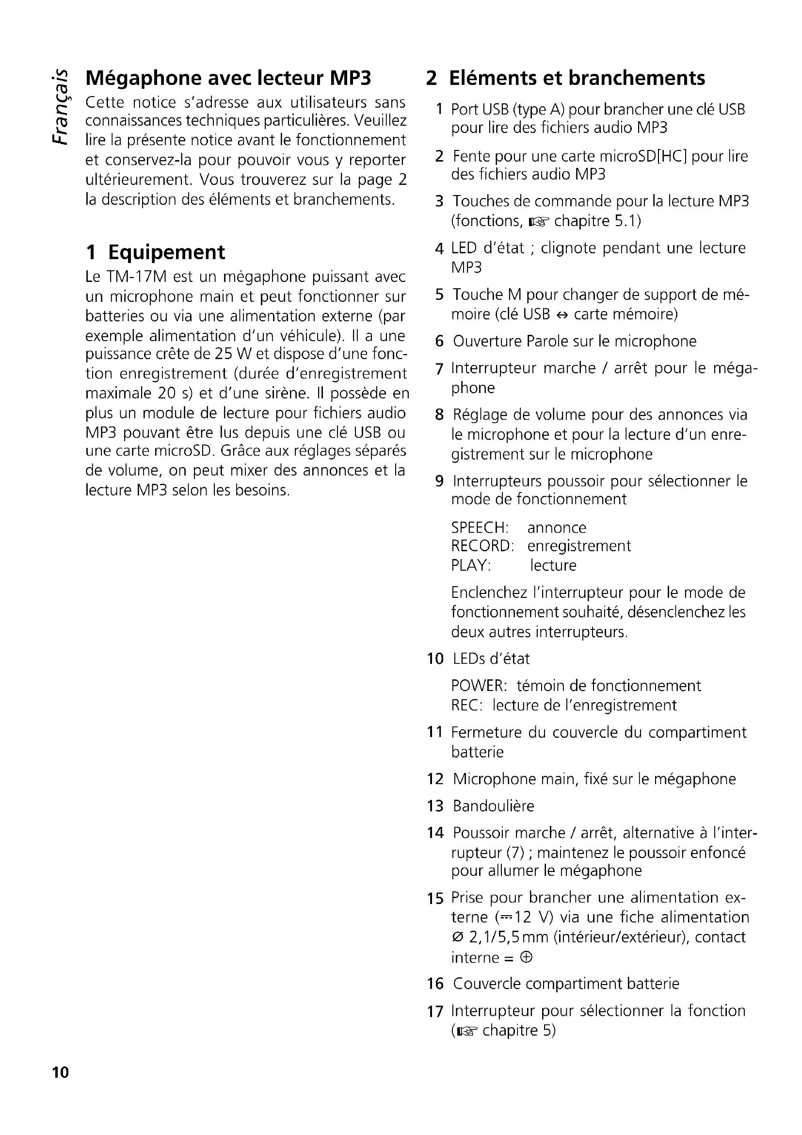 INTERNATIONAL GmbH & Co. KG. No part of this instruction manual may be reproduced in any form or by any means for any commercial use.10 Referenz für Sprachkennzeichnung der Seiten und Inhaltsverzeichnis Referenz für Sprachen-Inhaltsverzeichnis Français Français Page Mégaphone avec lecteur MP3 Cette notice s’adresse aux utilisateurs sans connaissances techniques particulières. Veuillez lire la présente notice avant le fonctionnement et conservez-la pour pouvoir vous y reporter ultérieurement. Vous trouverez sur la page 2 la description des éléments et branchements. 1 Equipement Le TM-17M est un mégaphone puissant avec un microphone main et peut fonctionner sur batteries ou via une alimentation externe (par exemple alimentation d’un véhicule). Il a une puissance crête de 25 W et dispose d’une fonc- tion enregistrement (durée d’enregistrement maximale 20 s) et d’une sirène. Il possède en plus un module de lecture pour fichiers audio MP3 pouvant être lus depuis une clé USB ou une carte microSD. Grâce aux réglages séparés de volume, on peut mixer des annonces et la lecture MP3 selon les besoins. 2 Eléments et branchements