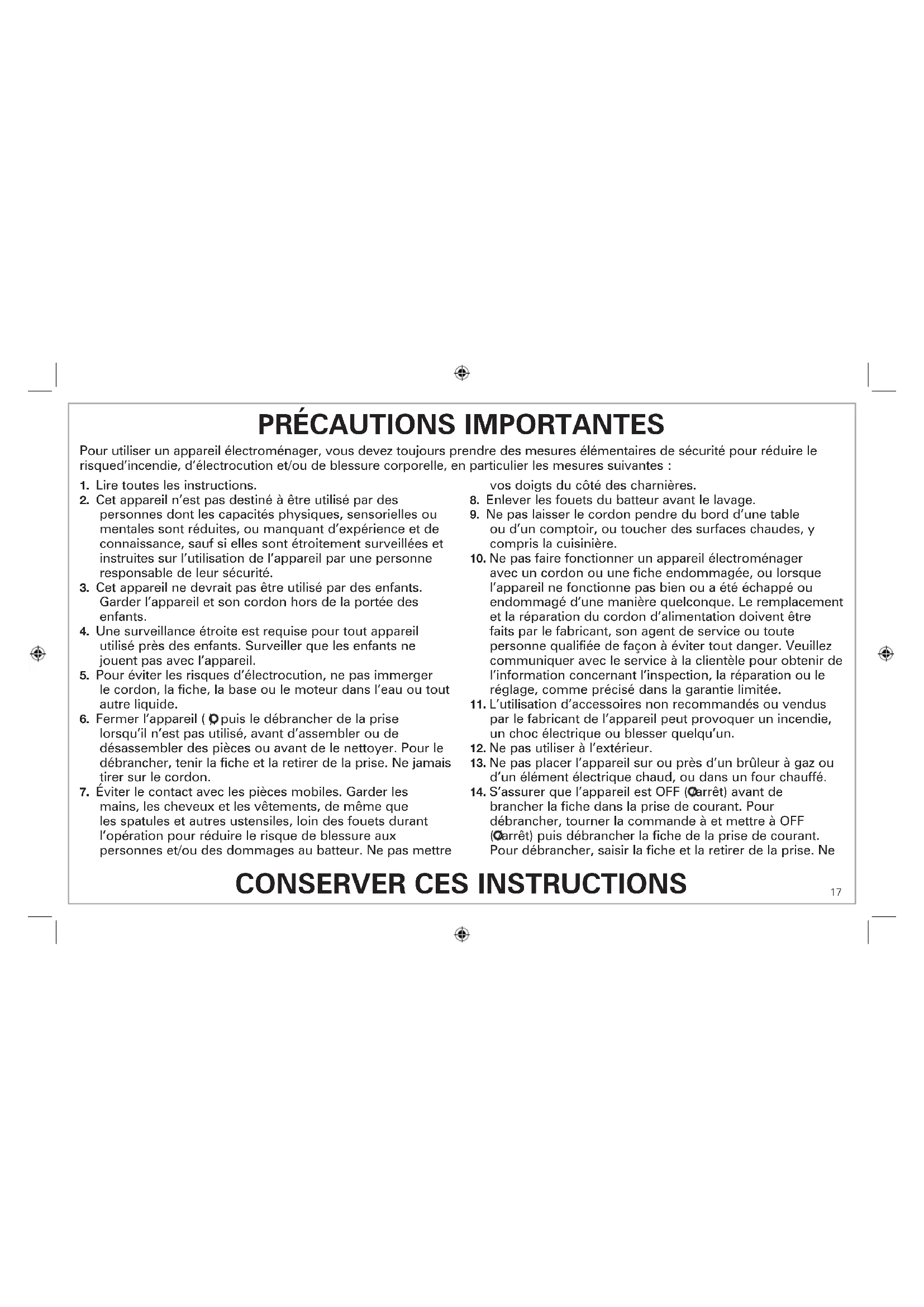 brancher la fiche dans la prise de courant. Pour débrancher, tourner la commande à et mettre à OFF ( /arrêt) puis débrancher la fiche de la prise de courant. Pour débrancher, saisir la fiche et la retirer de la prise. Ne Pour utiliser un appareil électroménager, vous devez toujours prendre des mesures élémentaires de sécurité pour réduire le risqued’incendie, d’électrocution et/ou de blessure corporelle, en particulier les mesures suivantes :