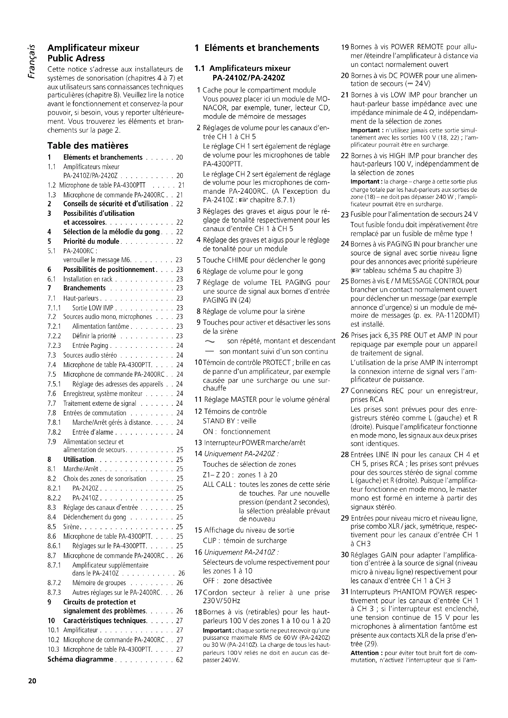 1 Éléments et branchements 20 1.1 Amplificateurs mixeur PA-2410Z/PA-2420Z 20 1.2 Microphone de table PA-4300PTT 21 1.3 Microphone de commande PA-2400RC.. 21 2 Conseils de sécurité et d'utilisation. 22 3 Possibilités d'utilisation et accessoires 22 4 Sélection de la mélodie du gong. 22 5 Priorité du module. 22 5.1 PA-2400RC: verrouiller le message M6. 23 6 Possibilités de positionnement. 23 6.1 Installation en rack 23 7 Branchements 23 7.1 Haut-parleurs. 23 7.1.1 Sortie LOW IMP 23 7.2 Sources audio mono, microphones 23 7.2.1 Alimentation fantôme 23 7.2.2 Définir la priorité 23 7.2.3 Entrée Paging 24 7.3 Sources audio stéréo 24 7.4 Microphone de table PA-4300PTT. 24 7.5 Microphone de commande PA-2400RC..24 7.5.1 Réglage des adresses des appareils 24 7.6 Enregistreur, système moniteur 24 7.7 Traitement externe de signal 24 7.8 Entrées de commutation 24 7.8.1 Marche/Arrêt à distance. 24 7.8.2 Entrée d'alarme 24 7.9 Alimentation secteur et alimentation de secours. 25 8 Utilisation. 25 8.1 Marche/Arrêt 25 8.2 Choix des zones de sonorisation 25 8.2.1 PA-2420Z 25 8.2.2 PA-2410Z. 25 8.3 Réglage des canaux d'entrée 25 8.4 Déclenchement du gong 25 8.5 Sirène. 25 8.6 Microphone de table PA-4300PTT. 25 8.6.1 Règles sur le PA-4300PTT. 25 8.7 Microphone de commande PA-22400RC.. 26 8.7.1 Amplificateur supplémentaire dans le PA-2410Z 26 8.7.2 Mémoire de groupes 26 8.7.3 Autres réglages sur le PA-2400RC. 26 9 Circuits de protection et signalement des problèmes. 26 10 Caractéristiques techniques. 27 10.1 Amplificateur 27 10.2 Microphone de commande PA-2400RC.. 27 10.3 Microphone de table PA-4300PTT. 27 Schéma diagramme 62