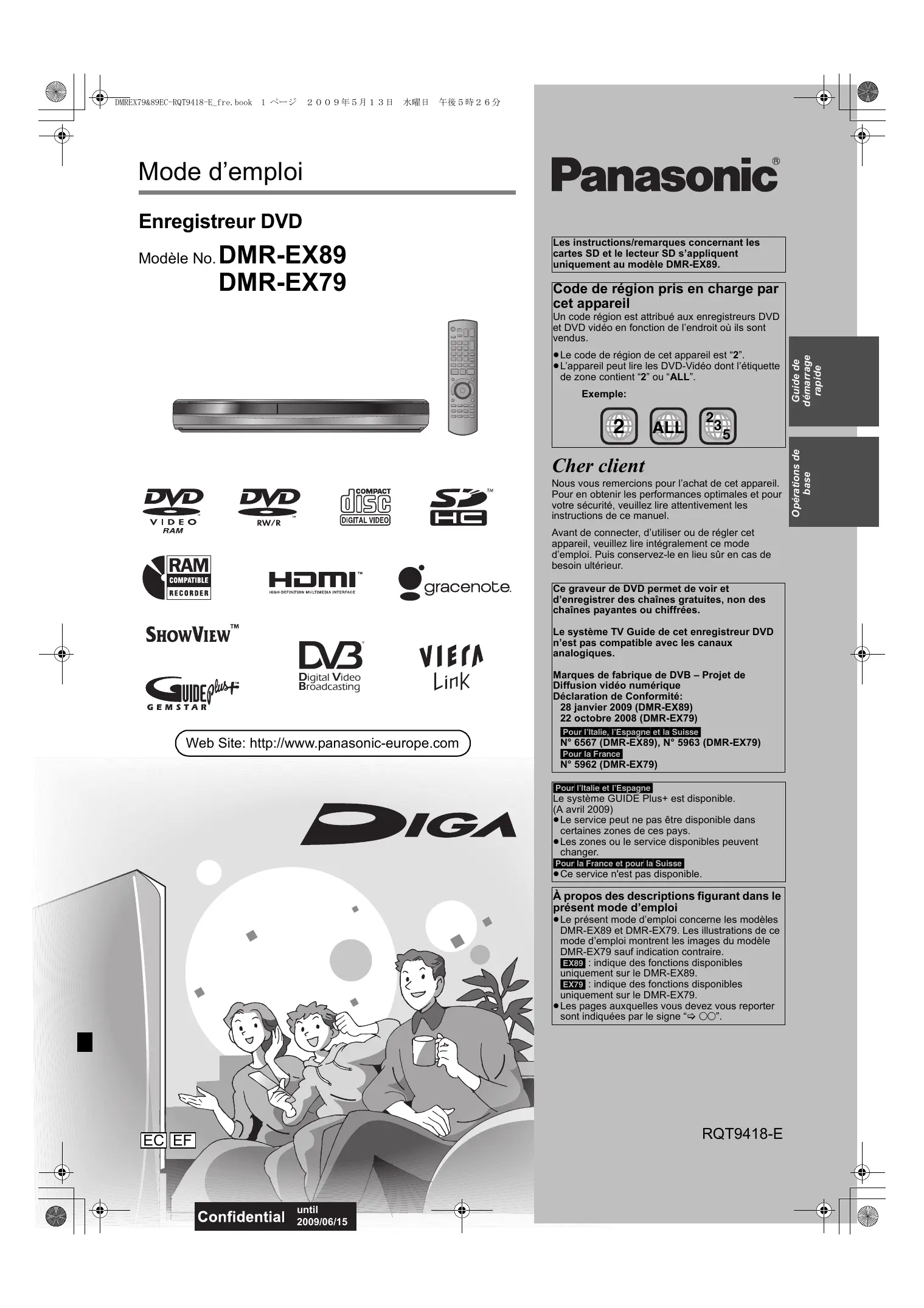 Guide de démarrage rapide Un code région est attribué aux enregistreurs DVD et DVD vidéo en fonction de l’endroit où ils sont vendus. DMREX79&89EC-RQT9418-E_fre.book 2 ページ 2009年5月13日