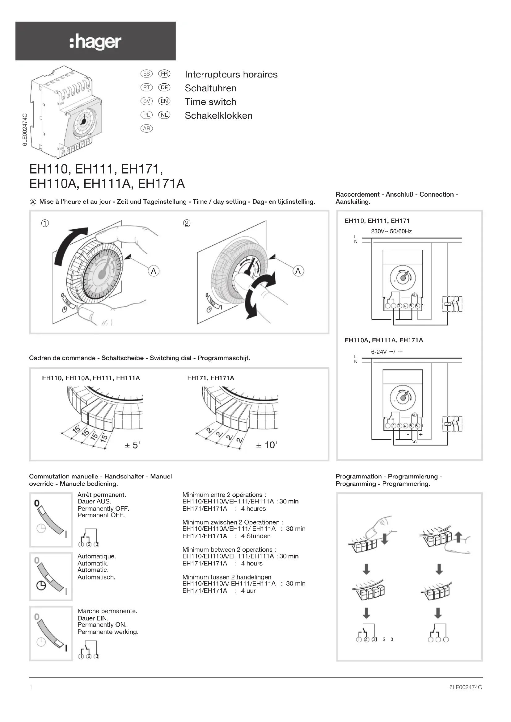 24EH110 - EH110A EH111 - EH171 EH111A - EH171A a Caractéristiques techniques Alimentation : EH110 : 230 V~ +10/-15% 240 V~ +/-6% 50/60Hz EH110A : 6-24 V~ 50/60Hz, 6-24 V s EH111 : 230 V~ +10/-15% 240 V~ +/-6% 50/60Hz EH171 : 230 V~ +10/-15% 240 V~ +/-6% 50/60Hz EH111A, EH171A : 6-24 V~ 50/60Hz 6-24 V s Technologie : quartz, sans réserve quartz, réserve de marche à 20 °C : 200 h après 120 h de mise sous tension quartz, réserve de marche à 20° C : 200h après 120h de mise sous tension Cycle : EH110 : 24 heures / EH110A : 24 heures EH111 : 24 heures / EH171 : 7 jours EH111A : 24 heures / EH171A : 7 jours Consommation : 0,5 VA Précision de fonctionnement : ± 6 min ./ an Température de fonctionnement : -10 °C à +45 °C Température de stockage : -20 °C à +70 °C Capacité de raccordement : 1 à 4 mm