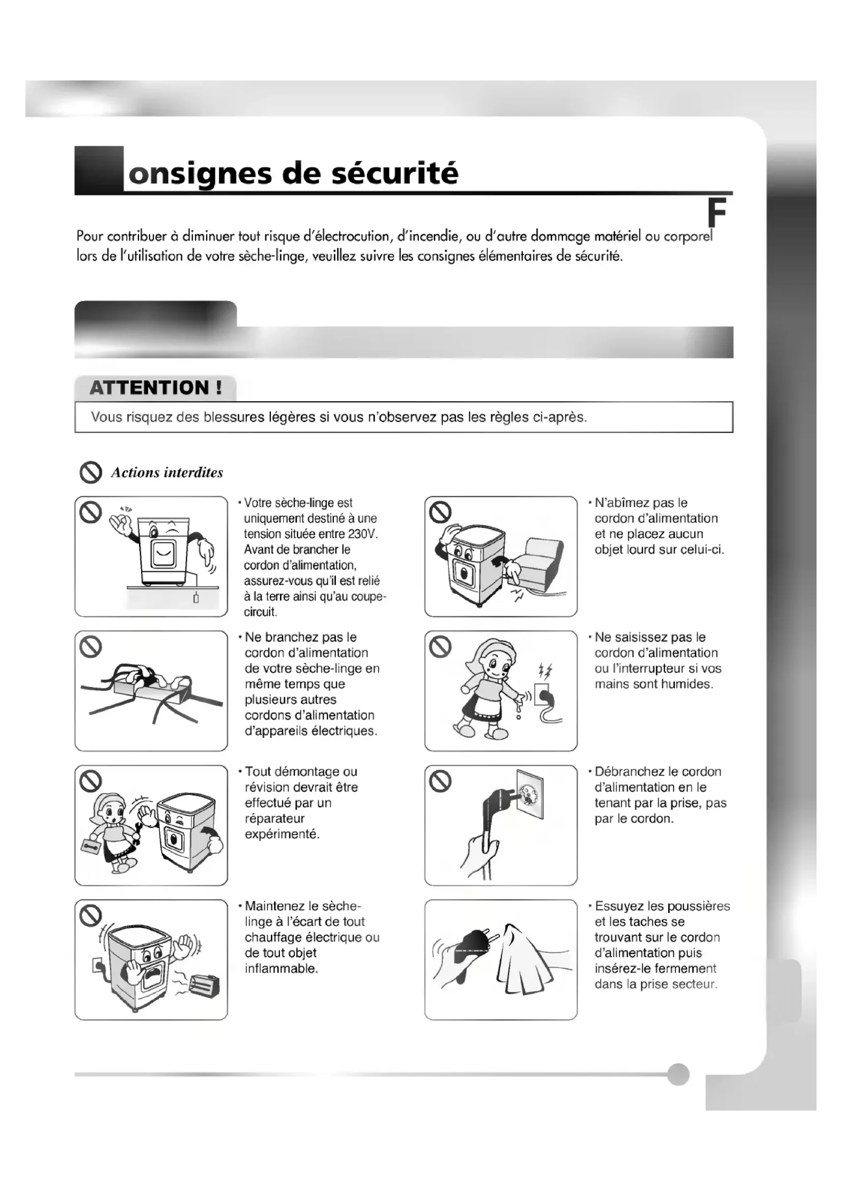 Votreseche-lingeestuniquementdestineaunetensionsitueeentre230V.Avantdebrancherlecordond'alimentation,assurez-vousqu'ilestreliealaterreainsiqu'aucoupe-circuit. Nebranchezpaslecordond'alimentationdevotreseche-lingeenmemetempsqueplusieursautrescordonsd'alimentationd'appareilselectriques. Toutdemontageourevisiondevraitetreeffectueparunreparateurexperimente. Maintenezleseche-lingeal'ecartdetoutchauffageelectriqueoudetoutobjetinflammable. N'abimezpaslecordond'alimentationetneplacezaucunobjetlourdsurcelui-ci. Nesaisissezpaslecordond'alimentationoul'interrupteursivosmainssonthumides. Debranchezlecordond'alimentationenletenantparlaprise,pasparlecordon. Essuyezlespoussieresetlestachessetrouvantsurlecordond'alimentationpuisinserez-lefermementdanslaprisesecteur.Pour contribuer diminuer toutrisqued'electrocution,d'incendie,ou d'autre dommage materiel oucorporel lors