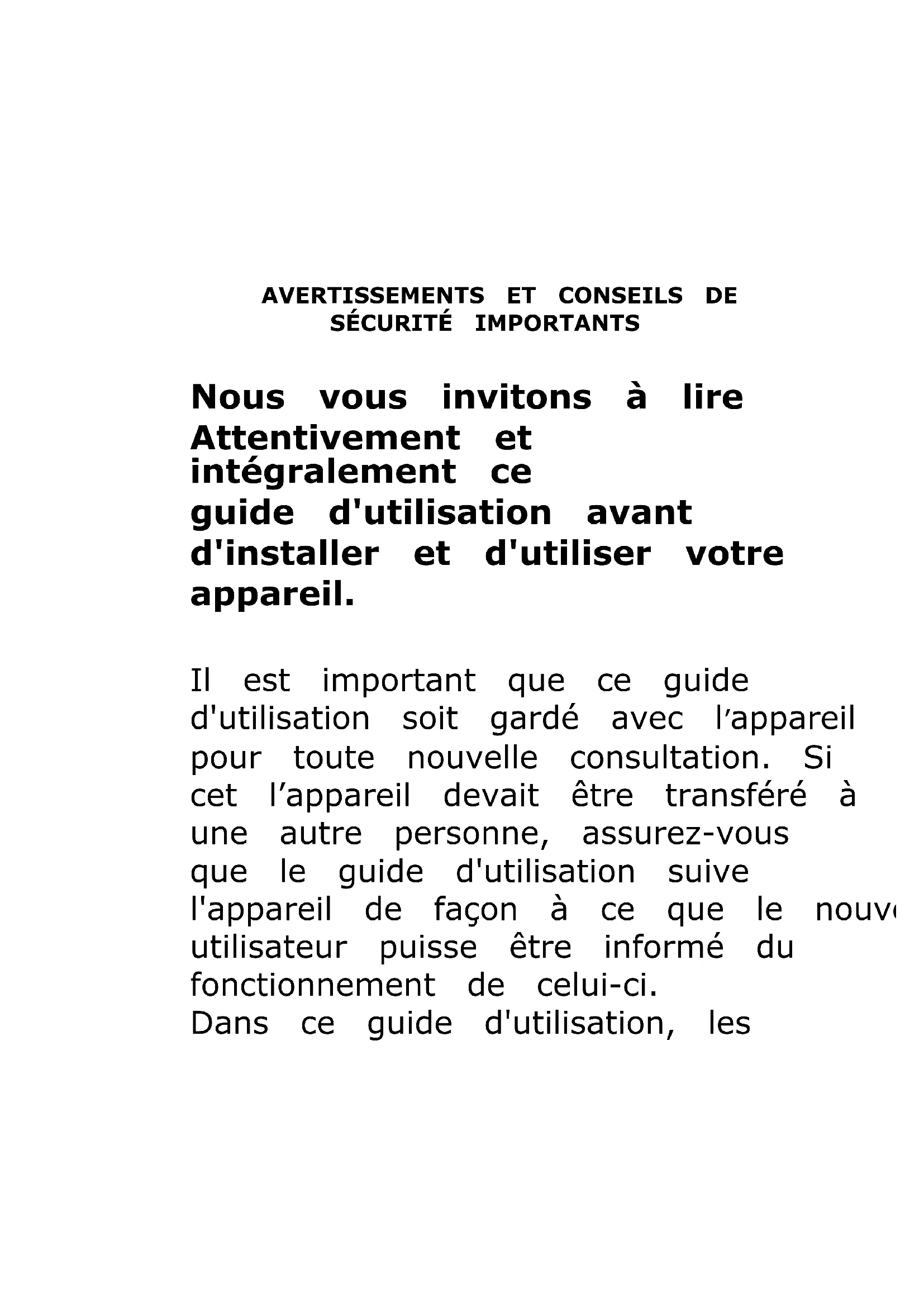 Nous vous invitons à lire Attentivement et intégralement ce guide d'utilisation avant d'installer et d'utiliser votre appareil. Il est important que ce guide d'utilisation soit gardé avec l’appareil pour toute nouvelle consultation. Si cet l’appareil devait être transféré à une autre personne, assurez-vous que le guide d'utilisation suive l'appareil de façon à ce que le nouvel utilisateur puisse être informé du fonctionnement de celui-ci. Dans ce guide d'utilisation, lessymboles suivants sont utilisés: