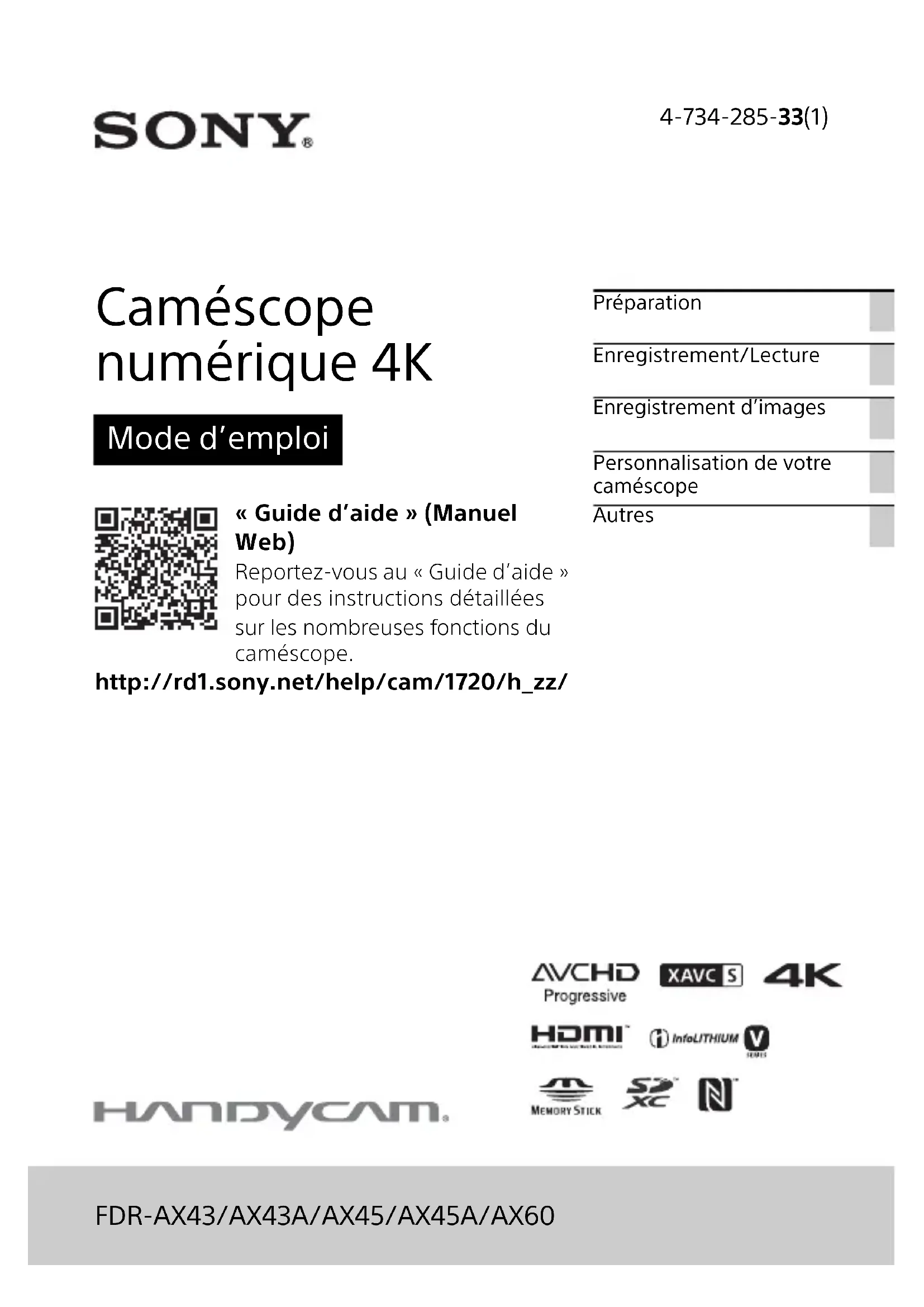 4-734-285-33(1) FDR-AX43/AX43A/AX45/AX45A/AX60 PréparationEnregistrement/LectureEnregistrement d’imagesPersonnalisation de votre caméscopeAutres Caméscope numérique 4K Mode d’emploi http://rd1.sony.net/help/cam/1720/h_zz/ « Guide d’aide » (Manuel Web) Reportez-vous au « Guide d’aide » pour des instructions détaillées sur les nombreuses fonctions du caméscope.FR