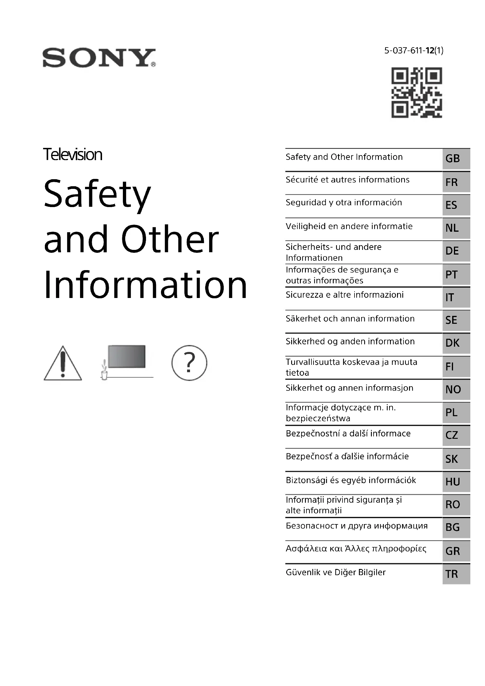- Vous pouvez vous reporter au Guide d’aide avec votre smartphone (informations fournies à la fin de ce manuel). IMPORTANT – Lisez le Contrat de licence logicielle de l’utilisateur final avant d’utiliser votre produit Sony. Utiliser votre produit indique vous avez accepté le Contrat de licence logicielle de l’utilisateur final. Le contrat de licence logicielle entre vous et Sony est disponible en ligne sur le site Web Sony (https://www.sony.net/tv-software-licenses/) ou sur l’écran de votre produit. Appuyez sur (Paramètres rapides) sur la télécommande et sélectionnez [Paramètres] t [Système] t [À propos] t [Informations légales] t [Avis et licences].Connexion Internet et confidentialité des donnéesCe produit se connecte à Internet au cours de la configuration initiale dès qu’un réseau est connecté afin de confirmer la connexion Internet, puis ultérieurement pour configurer l’écran d’accueil. Votre adresse IP est utilisée dans ces connexions Internet et toutes les autres. Si vous ne voulez pas que votre adresse IP soit utilisée, ne configurez pas la fonction Internet sans fil et ne connectez pas de câble Internet. Veuillez vous référer aux informations de confidentialité présentées dans les écrans de configuration pour en savoir plus sur les connexions Internet. AVIS IMPORTANT Ce produit a été fabriqué par ou pour le compte de Sony Corporation.Importateur dans l’UE : Sony Europe B.V.Les questions basées sur la législation européenne pour l’importateur ou relatives à la conformité des produits doivent être adressées au mandataire : Sony Belgium, bijkantoor van Sony Europe B.V., Da Vincilaan 7-D1, 1930 Zaventem, Belgique. Consignes de sécuritéD:\LIFA\@ Jobs\SAFETY\SY22_SAFETY_CEP_121\02FR\5037611121_02FR.fm master page: Right Safety and Other Information 5-037-611-12(1)