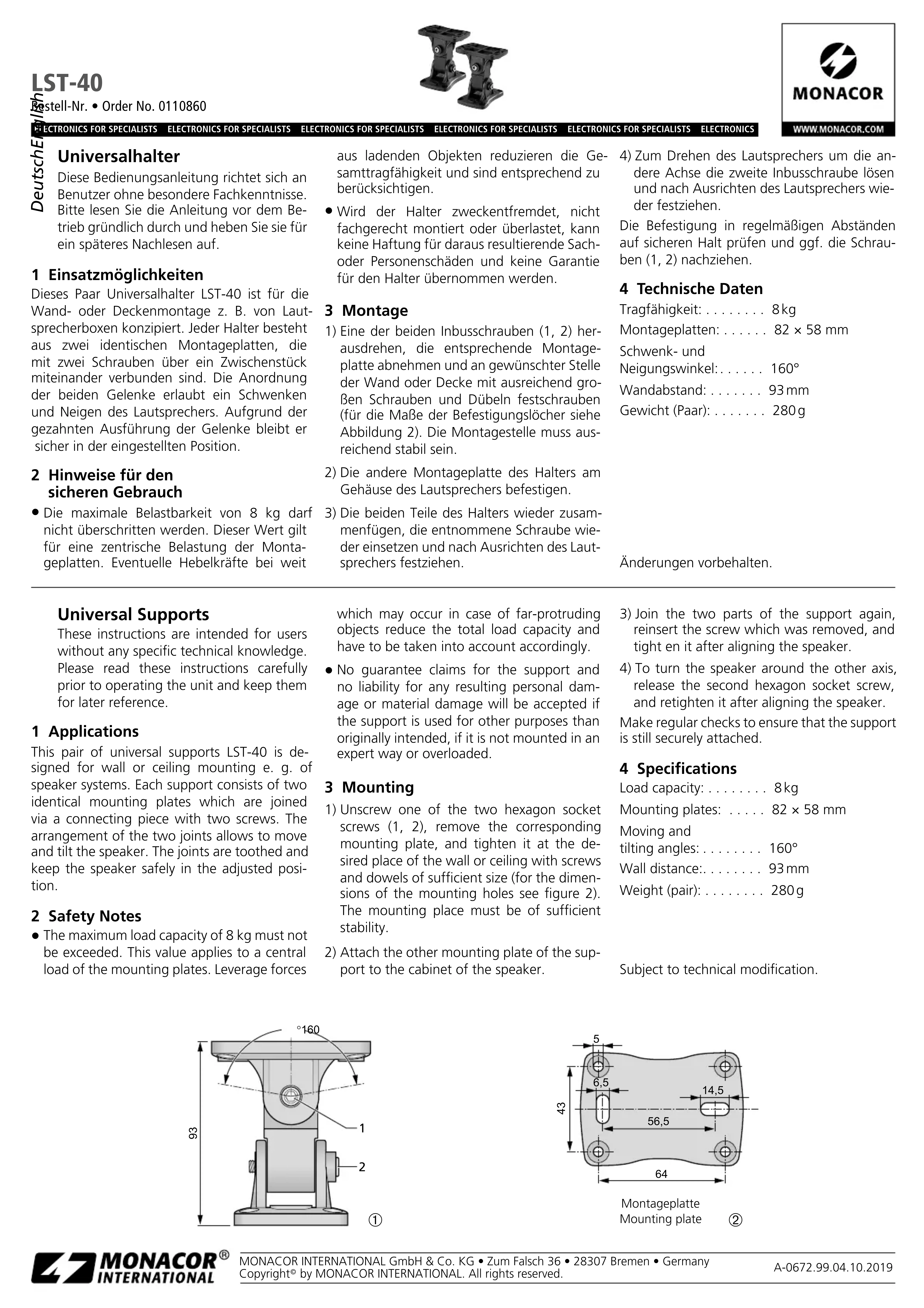 - mm Peso (coppia): g Con riserva di modifiche tecniche. Supports universels Cette notice s’ adresse aux utilisateurs sans connaissances techniques particulières. Veuillez lire la présente notice avant le fonctionnement et conservez-la pour pou- voir vous y reporter ultérieurement. 1 Possibilités d’utilisation Cette paire de supports universels LST-40 est spécialement conçue pour un montage au mur et au plafond, par exemple pour des enceintes. Chaque support se compose de deux plaques de montage identiques, reliées entre elles par une pièce intermédiaire avec deux vis. L’agen- cement des deux articulations permet une incli- naison et une orientation de l’enceinte. Grâce à la version dentée des articulations, l’enceinte reste, en toute sécurité, dans la position réglée. 2 Conseils d’utilisation et de sécurité p. 280