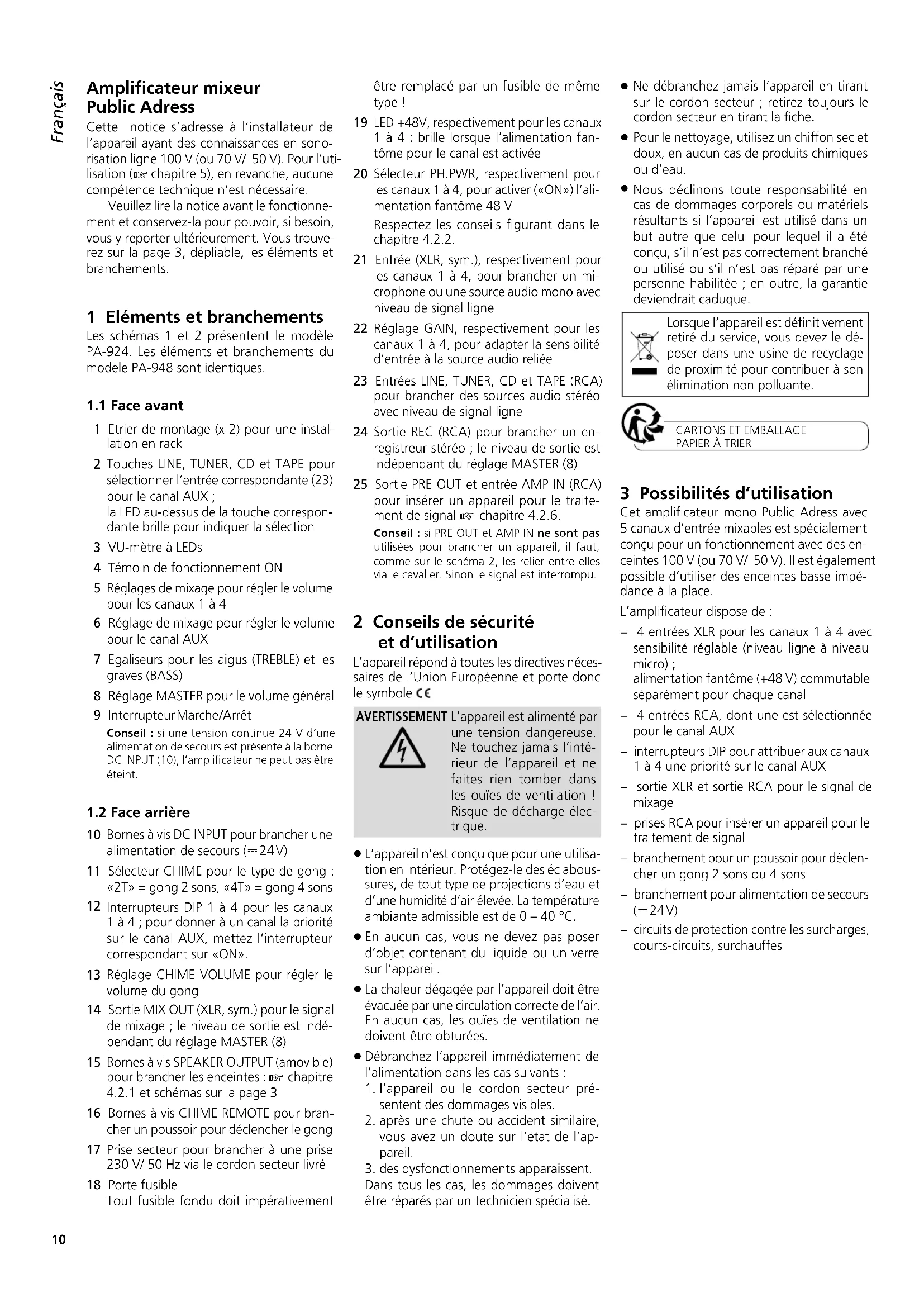 compétence technique n’est nécessaire. Veuillez lire la notice avant le fonctionne- ment et conservez-la pour pouvoir, si besoin, vous y reporter ultérieurement. Vous trouve- rez sur la page 3, dépliable, les éléments et branchements. 1 Eléments et branchements Les schémas 1 et 2 présentent le modèle PA-924. Les éléments et branchements du modèle PA-948 sont identiques.