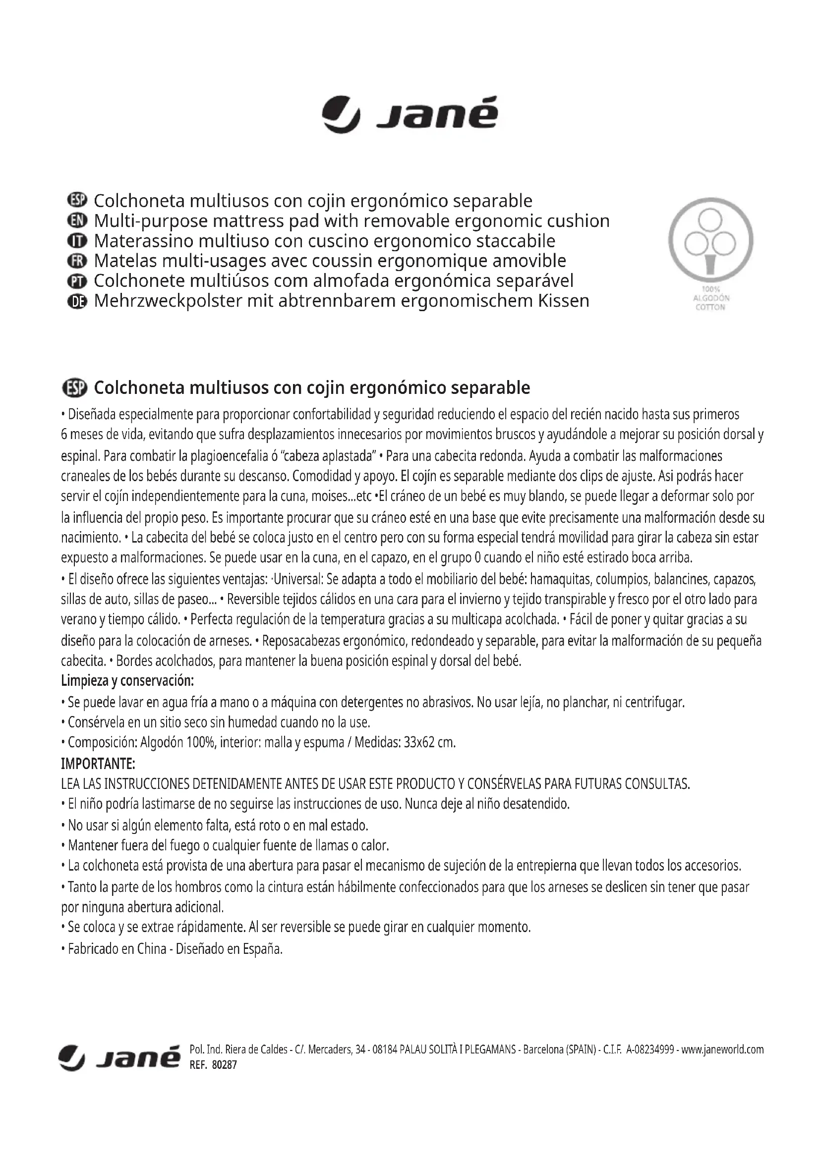 - Fabbricato in Cina - Progettato in Spagna. Materassino multiuso con cuscino ergonomico staccabile Pol. Ind. Riera de Caldes - C/. Mercaders, 34 - 08184 PALAU SOLITÀ I PLEGAMANS - Barcelona (SPAIN) - C.I.F. A-08234999 - www.janeworld.com REF. 80287• Tout spécialement conçu pour apporter confort et sécurité en réduisant l'espace du nouveau-né jusqu'à l'âge de 6 mois, afin d'éviter qu'il subisse des déplacements dus à des mouvements brusques tout en contribuant à améliorer la position de son dos et de ses lombaires. Pour prévenir la plagiocéphalie ou «tête plate» • Pour une petite tête bien ronde. Permet d'éviter les malformations crâniennes des bébés durant leur sommeil. Confort et maintien. • Le coussin est amovible au moyen de clips de réglage. Vous pourrez ainsi l’utiliser indépendamment pour le lit-bébé, le couffin, etc. • Le crâne d'un bébé est très malléable, il peut se déformer uniquement sous l'effet de son propre poids. Il est important que son crâne repose dès sa naissance sur un support prévenant le risque de malformation. • La petite tête du bébé se câle juste au centre, mais grâce à sa forme spéciale il pourra bouger la tête sans risquer de malformations. • On peut l'utiliser dans le lit, dans la nacelle, dans le groupe 0 lorsque le bébé est allongé sur le dos.
