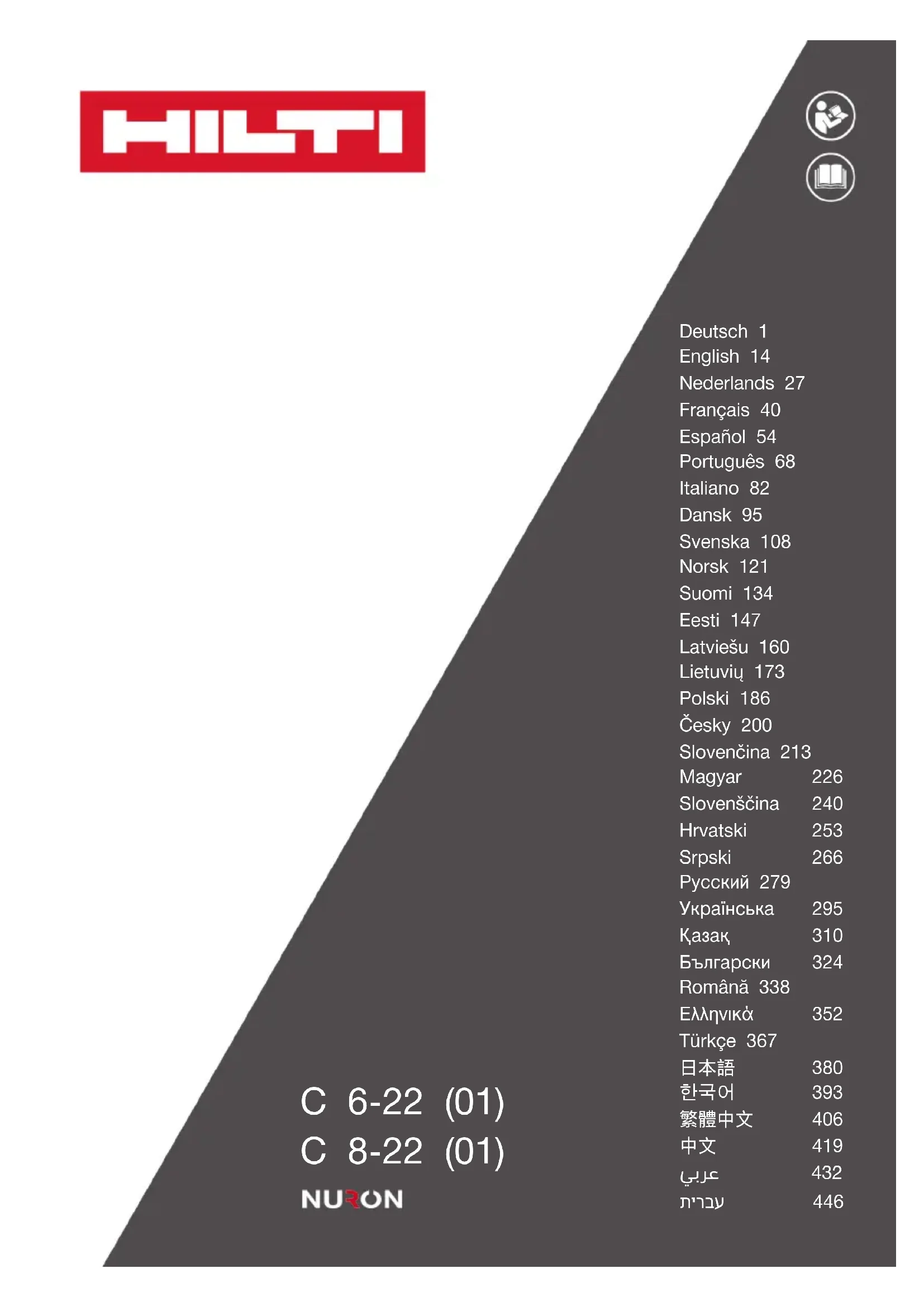 opérations indésirables. 11 Garantie constructeur ▶ En cas de questions sur les conditions de garantie, veuillez vous adresser à votre partenaire Hilti local. 12 Informations complémentaires C 6-22 (01)*2275225* 2275225 Français 49 RoHS (directive relative à la limitation d'utilisation des substances dangereuses) Ce tableau s'applique au marché de la Chine.50 Français 2275225 *2275225* Ce tableau s'applique au marché de Taïwan. C 8-22 (01)*2275225* 2275225 Français 51 RoHS (directive relative à la limitation d'utilisation des substances dangereuses) Ce tableau s'applique au marché de la Chine.52 Français 2275225 *2275225* Ce tableau s'applique au marché de Taïwan. 13 Accus li-ion Hilti Instructions de sécurité et d'utilisation Dans la présente documentation, le terme accu est utilisé pour des accumulateurs au lithium-ion Hilti rechargeables qui renferment plusieurs cellules au lithium-ion. Ces accus ont été conçus pour les outils électriques Hilti et doivent exclusivement être utilisés à cet effet. Utiliser uniquement des accus d'origine de Hilti ! Description Les accus Hilti sont dotés des systèmes de gestion des cellules et de la protection des cellules. Les accus sont constitués de cellules qui contiennent des matériaux accumulateurs au lithium-ion permettant une densité de flux énergétique spécifique élevée. Les cellules Li-Ion sont soumises à un effet mémoire très faible mais sont très sensibles aux effets de la force, à la décharge profonde ou aux températures élevées. La liste des produits autorisés pour les accus Hilti est disponible auprès de Hilti Store ou sous : www.hilti.group Sécurité ▶ Respecter les consignes de sécurité suivantes relatives à la manipulation et à l'utilisation des accus Li-Ion. Le non-respect de telles mesures risque de provoquer des irritations cutanées, des blessures graves corrosives, des brûlures chimiques, des incendies et/ou des explosions. ▶ Traiter les accus avec soin pour éviter les endommagement et les fuites de liquides très nocifs pour la santé ! ▶ Les accus ne doivent en aucun cas être modifiés ou manipulés !